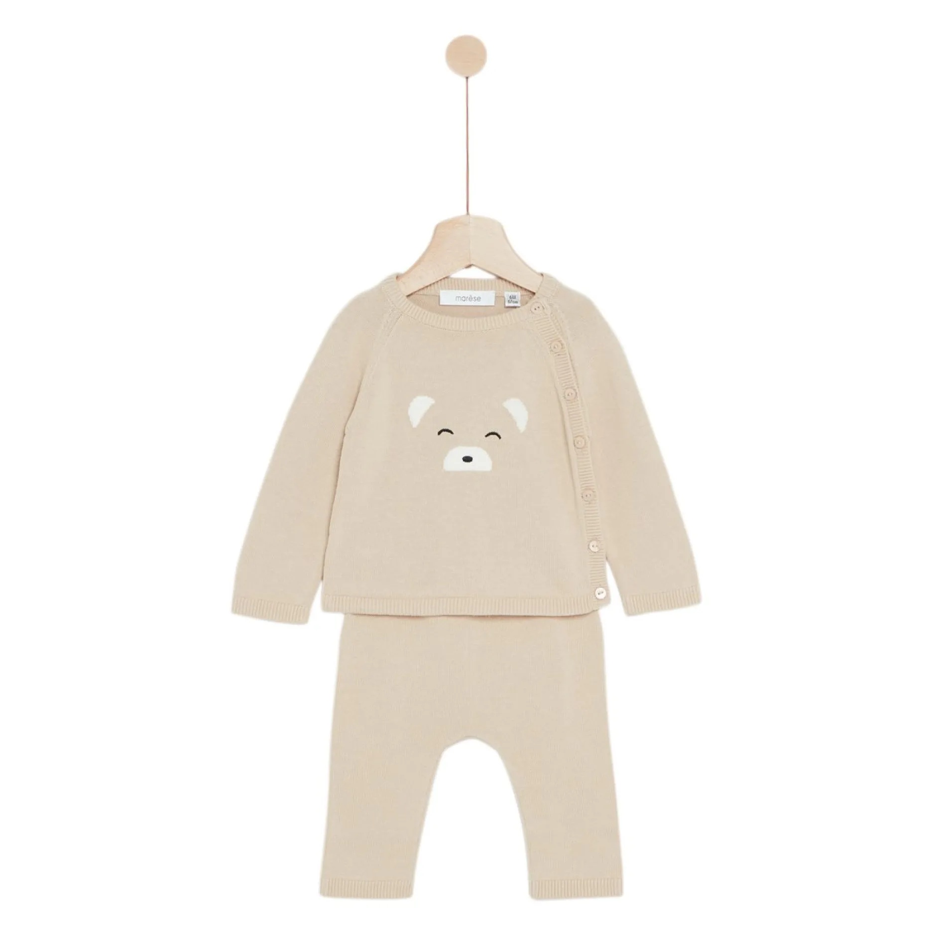 Ensemble 2 pièces Marèse en tricot de coton en coton bio composé d’un pantalon et d’un pull . Existe en version beige nougat et brun terracotta. Superbe et ludique avec sa petite tête d’ourson sur le devant en jacquard. La fonctionnalité n’est pas oubliée avec la taille élastiquée pour s’adapter à toutes les morphologies et ouverture épaules par des petits boutons en ton sur ton et gravés à la marque. Le parfait ensemble tellement craquant avec son côté mode et affectif.