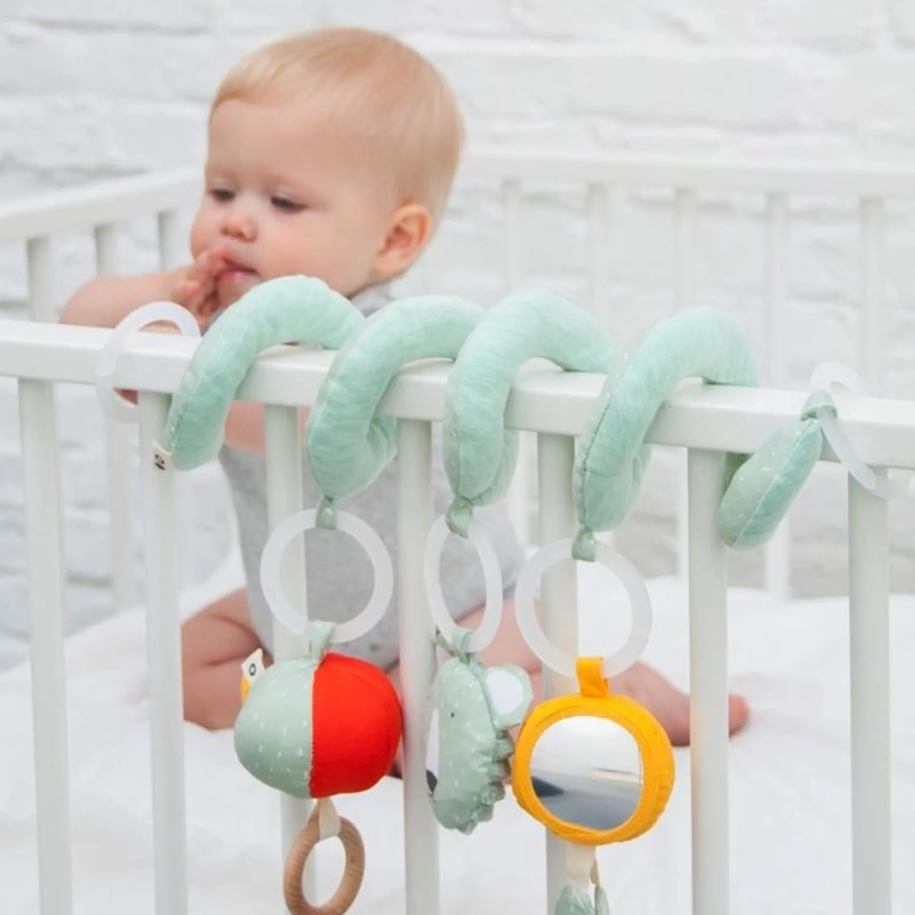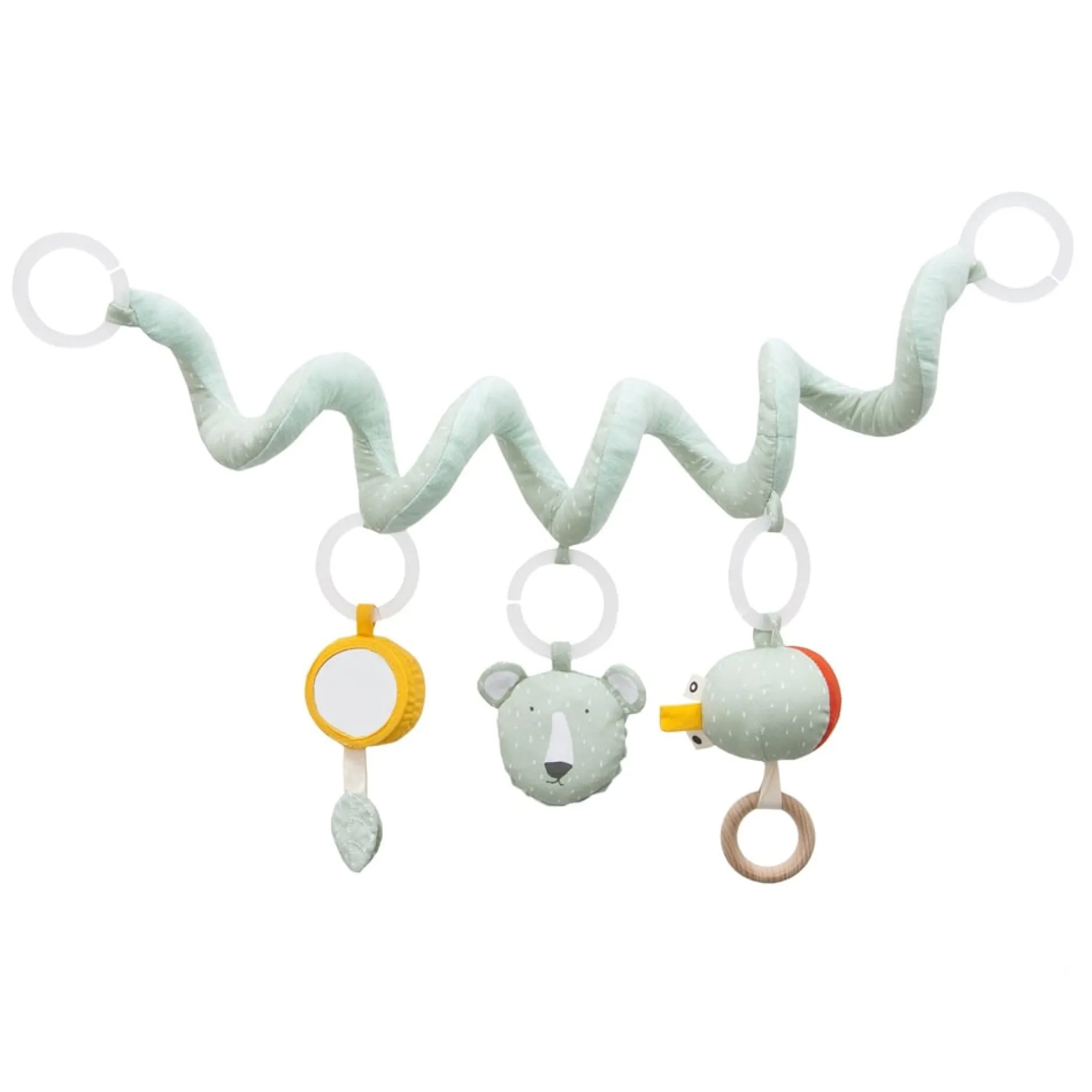 Avec trois éléments ludiques, cette spirale d’activités fait sourire tous les petits! La spirale s’enroule joliment autour d’un porte-bébé ou d’un parc. Les trois jouets ont des caractéristiques différentes, comme un anneau en bois, du papier froissé, un miroir et une petite cloche pour que votre enfant puisse jouer avec vous, où que vous alliez. Comme tous les éléments sont attachés avec des anneaux de jouets pratiques, ils peuvent facilement être enlevés pour continuer à s’amuser à l’extérieur du porte-bébé ou du parc.
