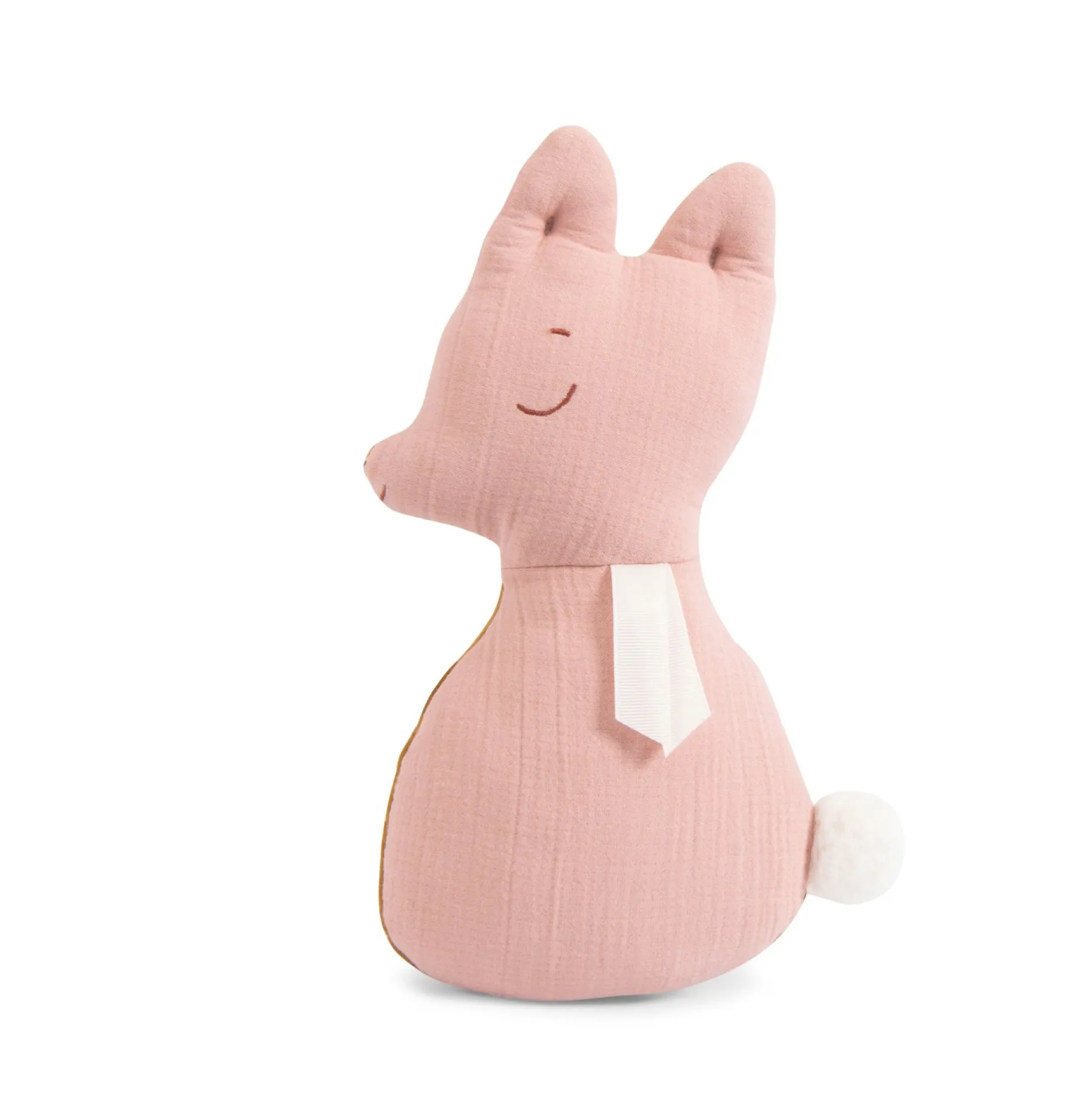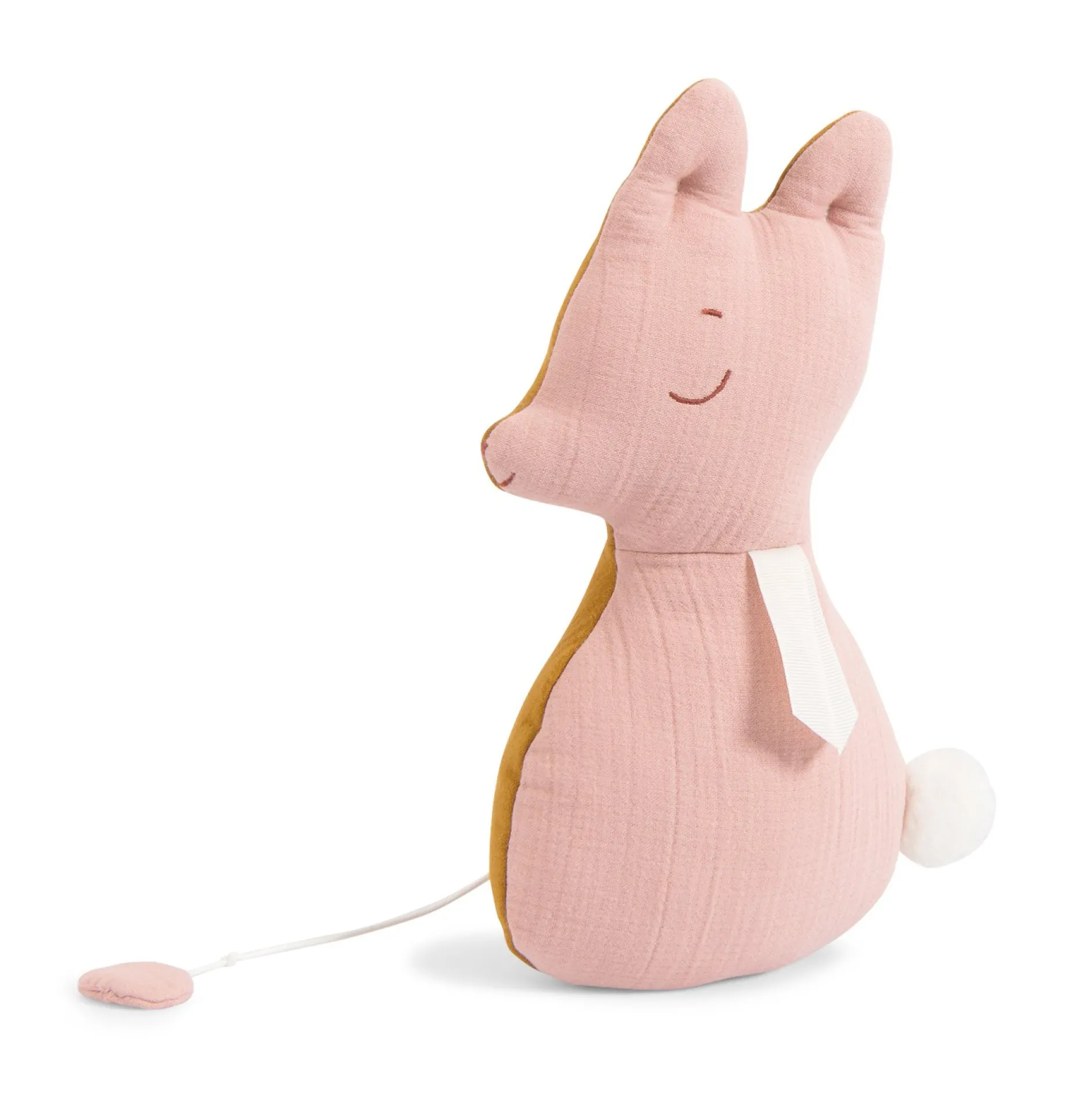 Coussin musical aux airs japonais pour fredonner, réconforter ou s’endormir. Lange rose d’un côté, et lange moutarde de l’autre, il est brodé et cousu d’une petite queue en fourrure. La boîte à musique s’enlève pour pouvoir le passer en machine.