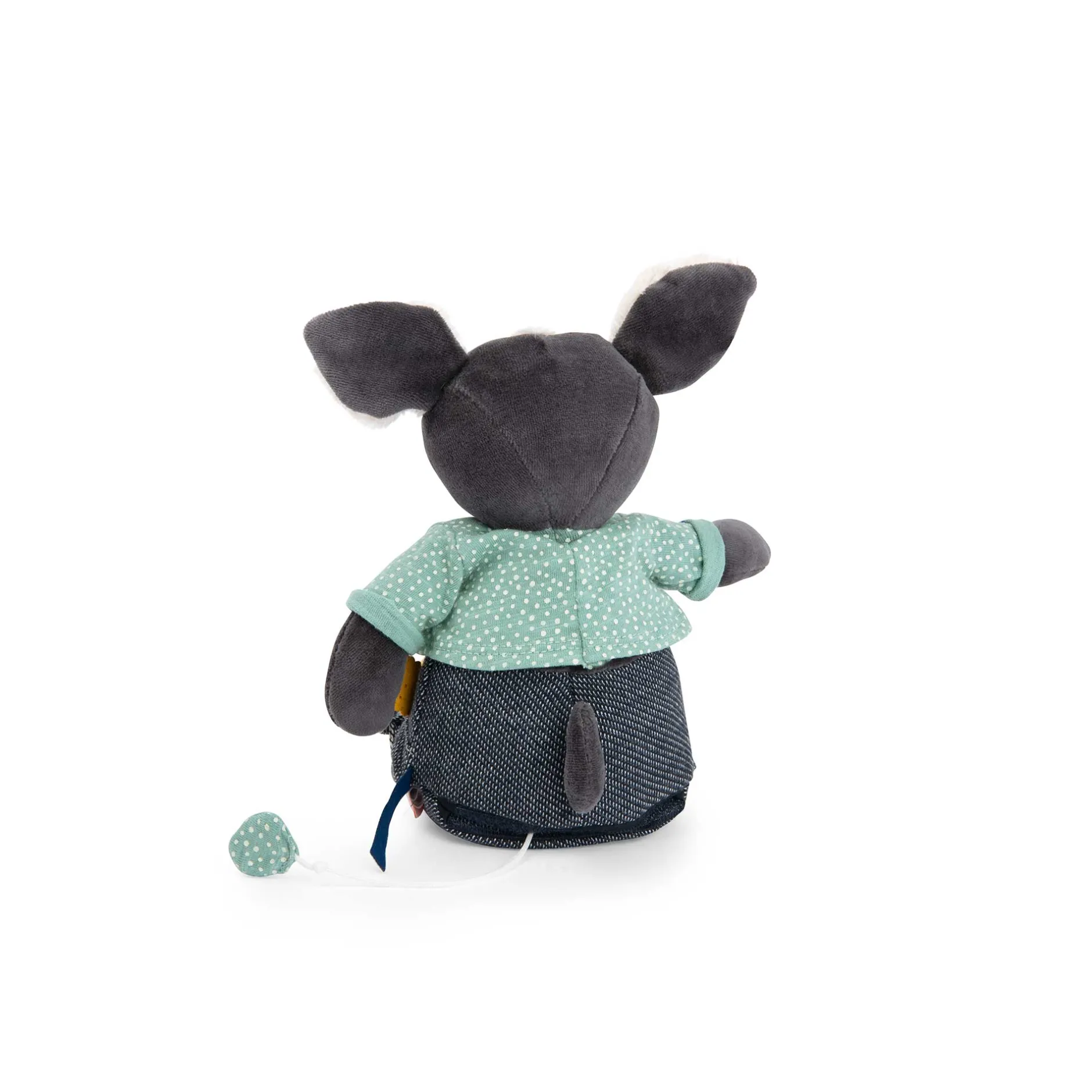 Jeu de textures et couleurs pour Puce le compagnon musical. La boîte à musique est actionnée en tirant sur la pastille. Pratique, le boitier musical est déhoussable pour facilité le lavage.