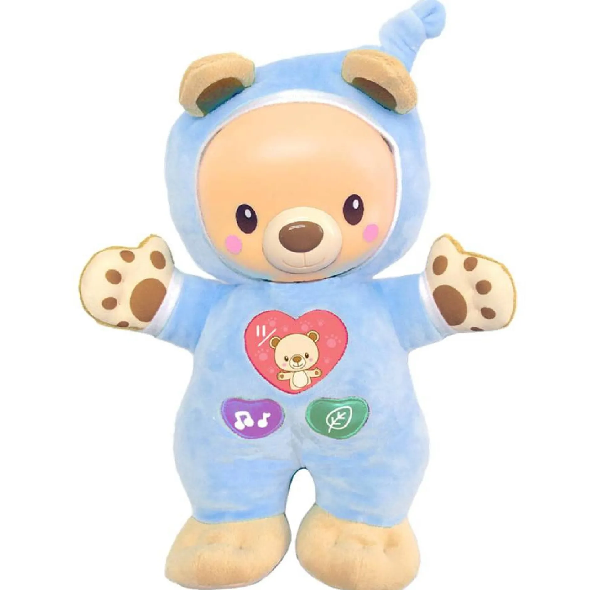- Enlacer l’ourson et appuyer sur les différents boutons contribue au développement de la motricité