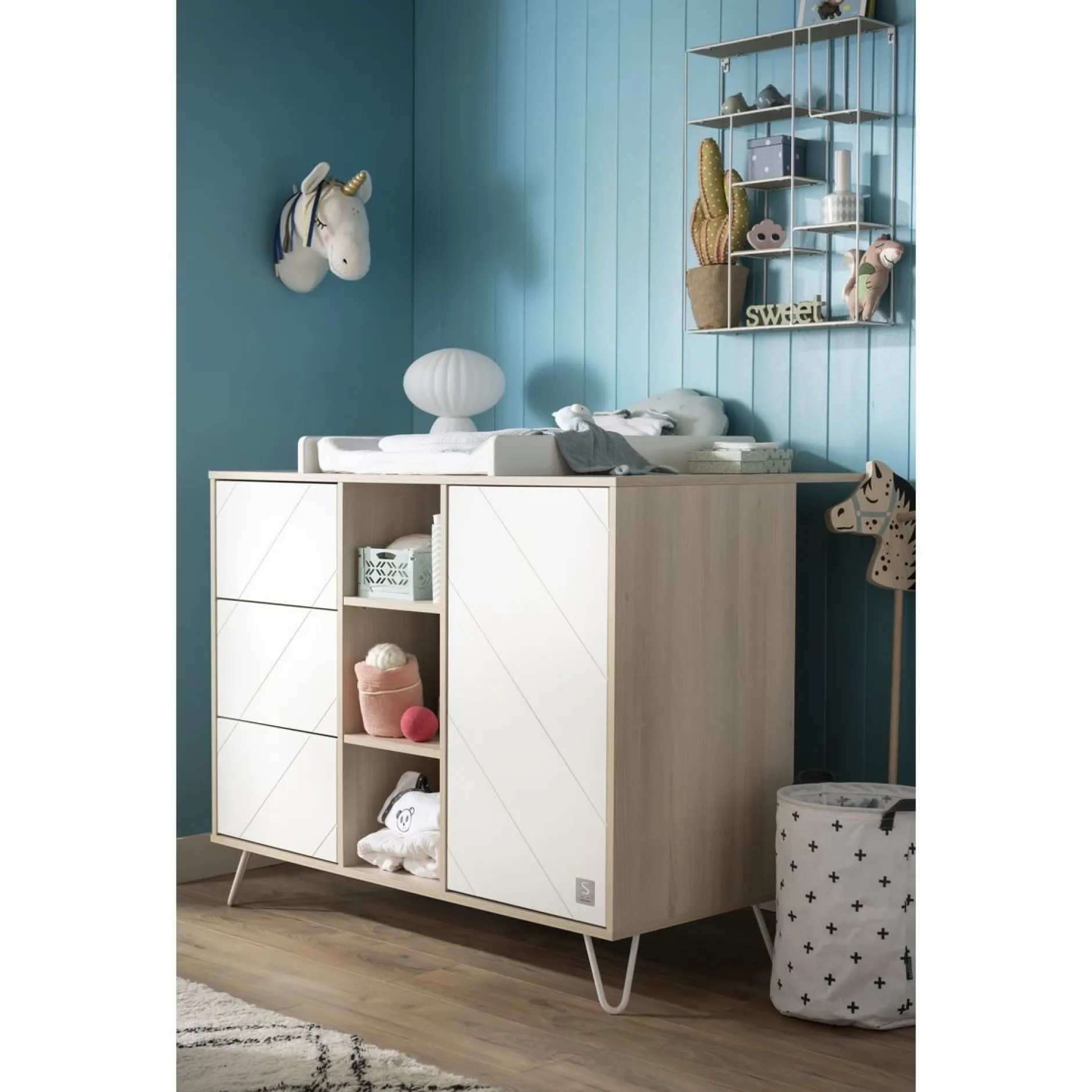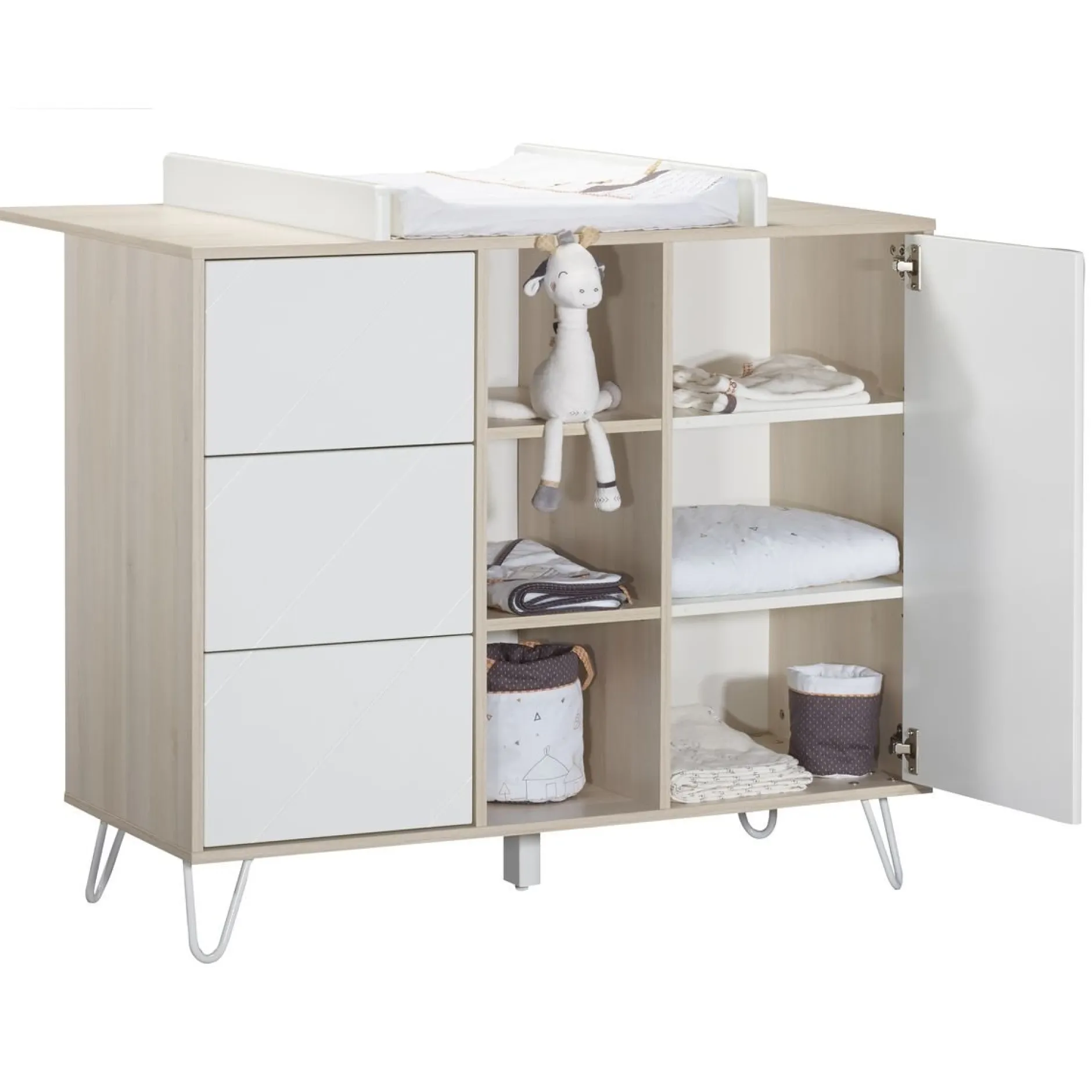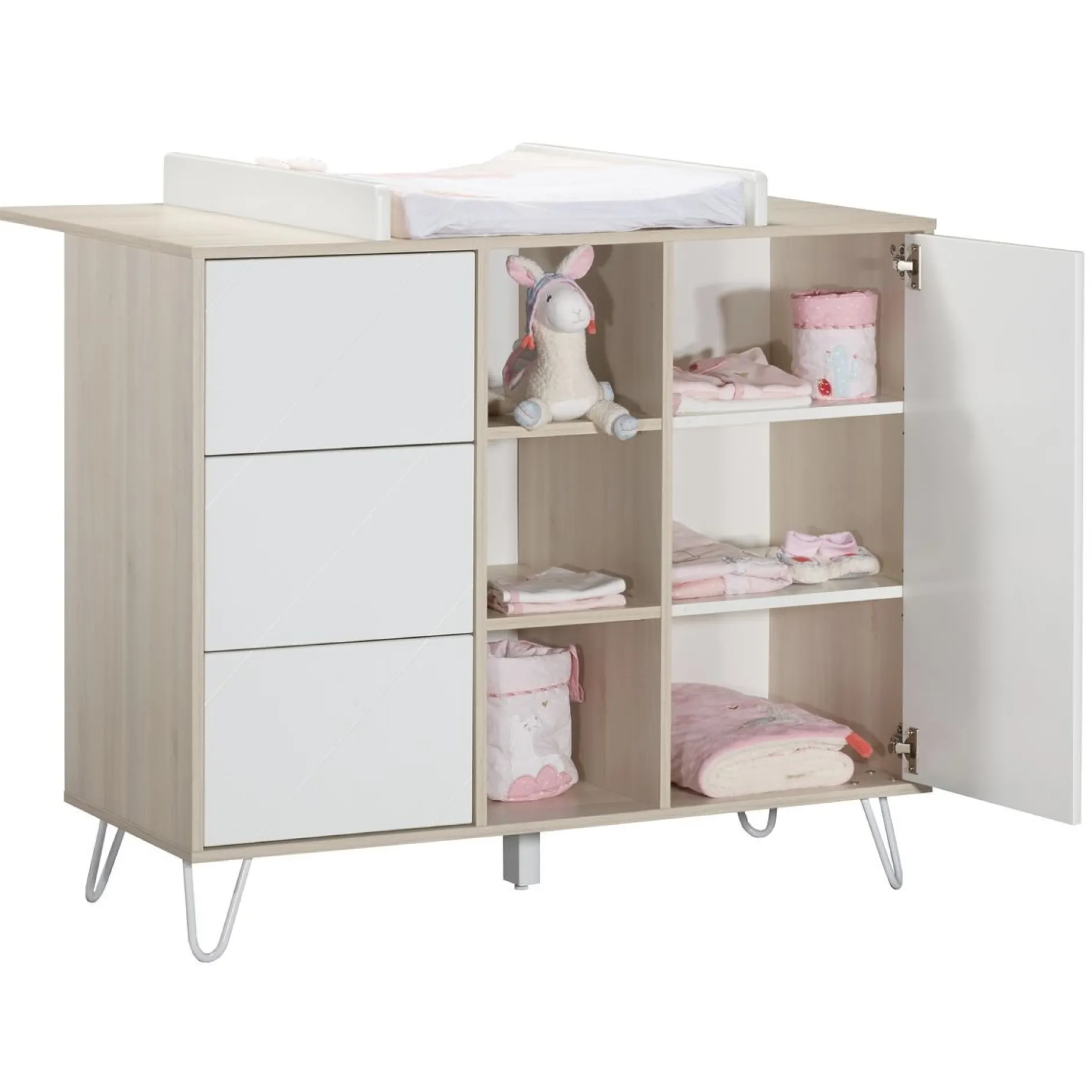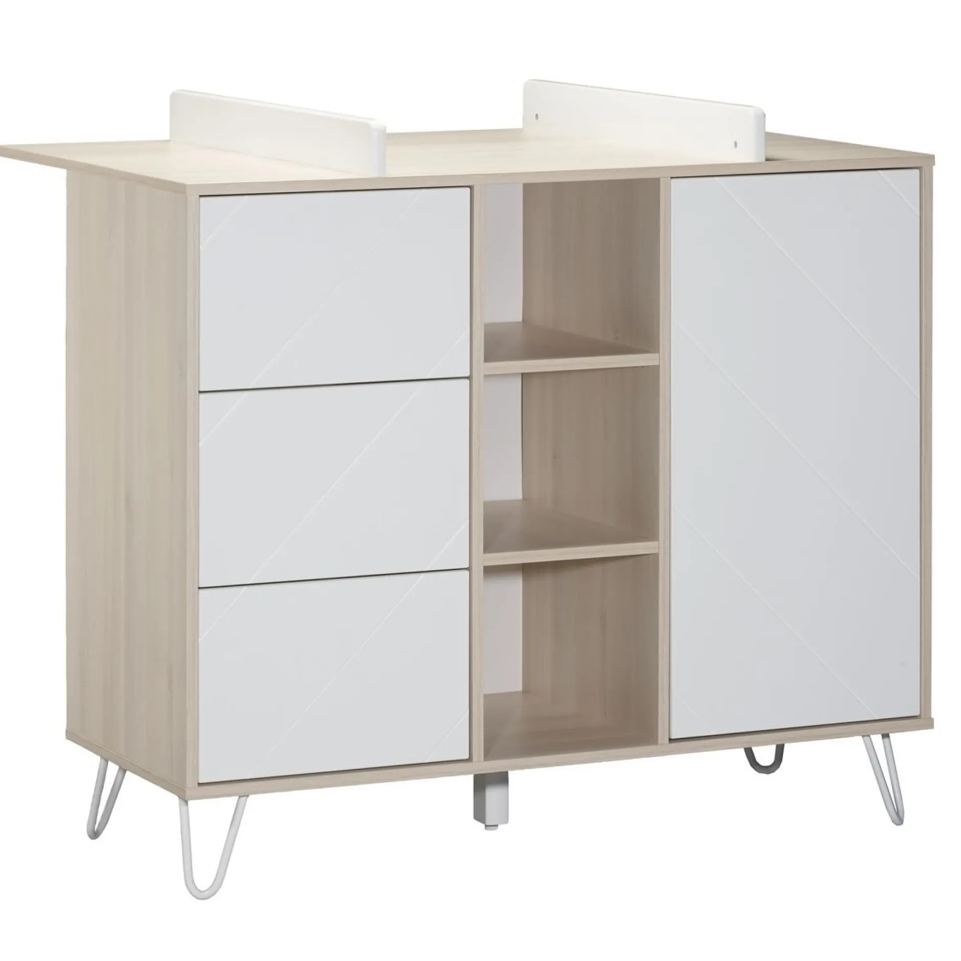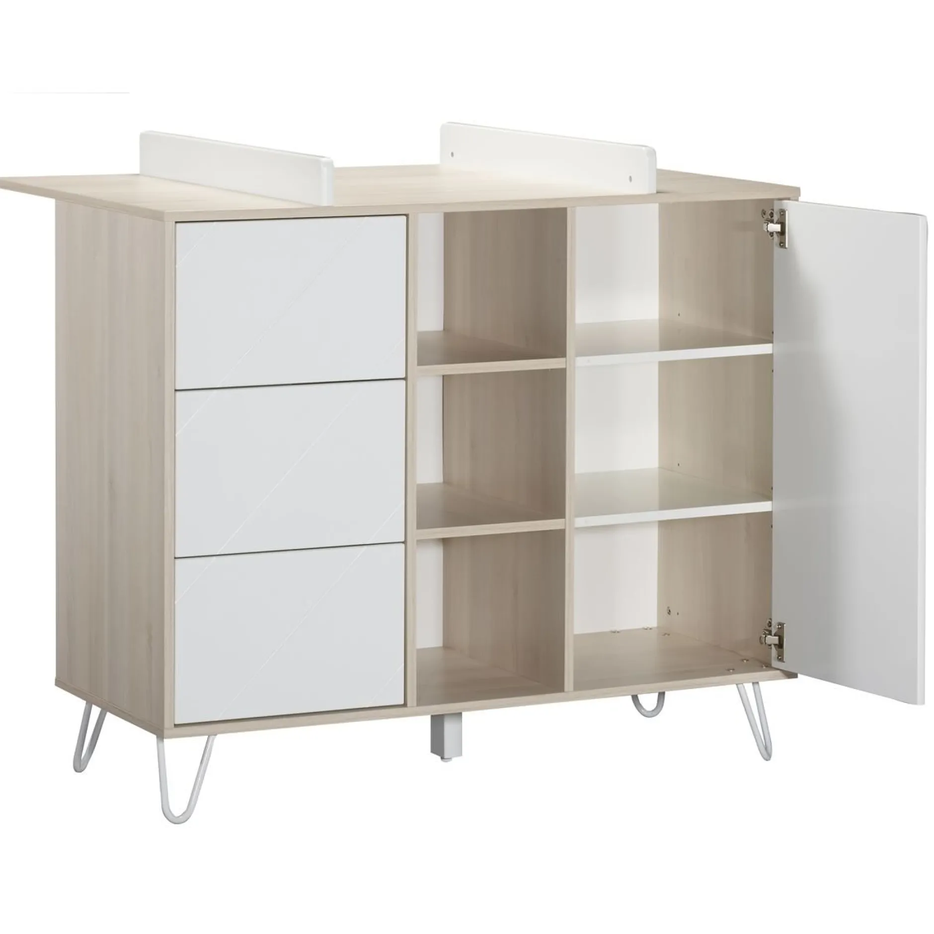 Transformez votre belle commode de la collection Happy en meuble à langer grâce à ce plan à langer intégral. Facile d’installation, vous pourrez prendre soin de bébé en toute sécurité et ce jusqu’à ses 15 kg. Dessus en panneaux de particules revêtus de papier décor Acacia clair. Joues en panneaux de fibres de Moyenne Densité (MDF) laqués blanc.