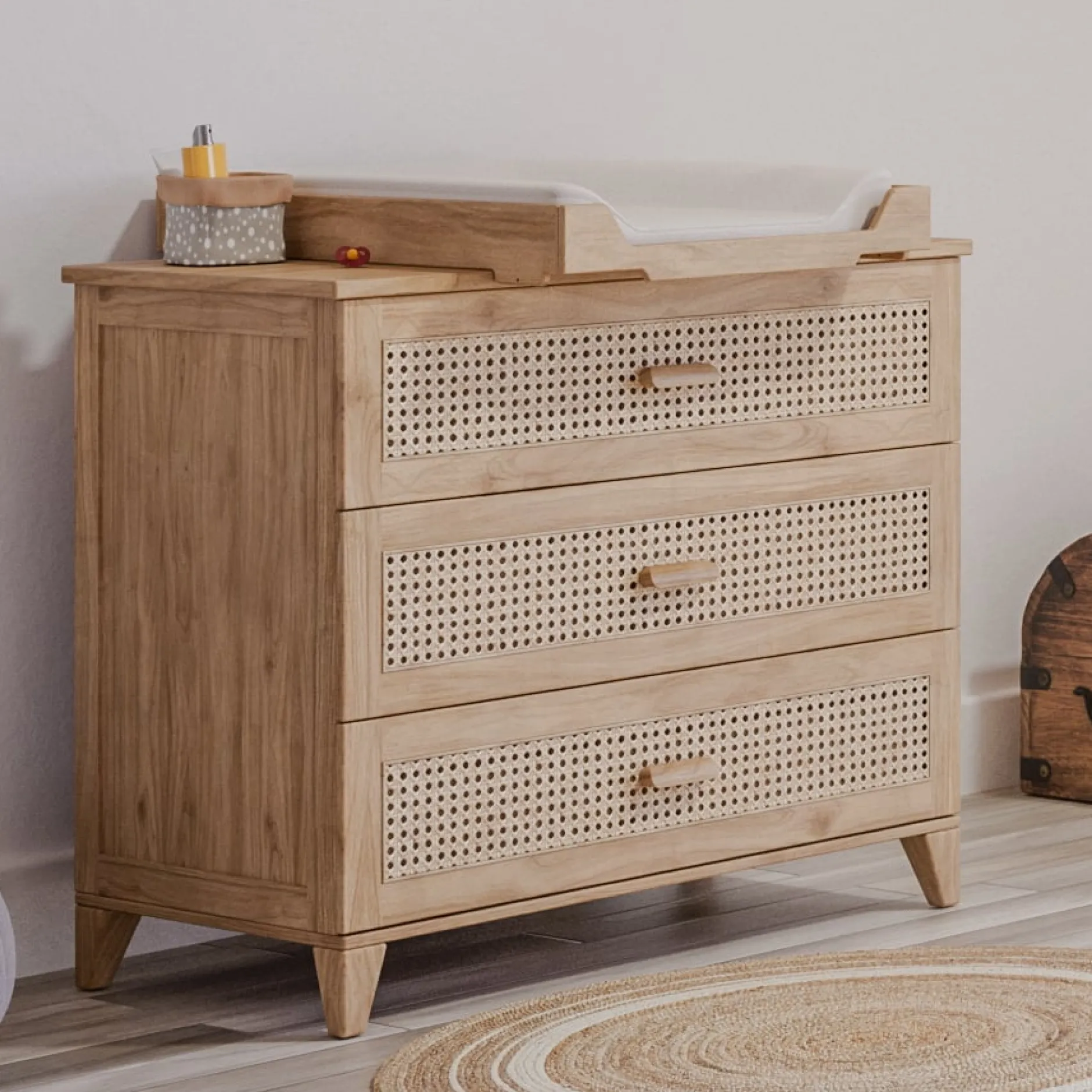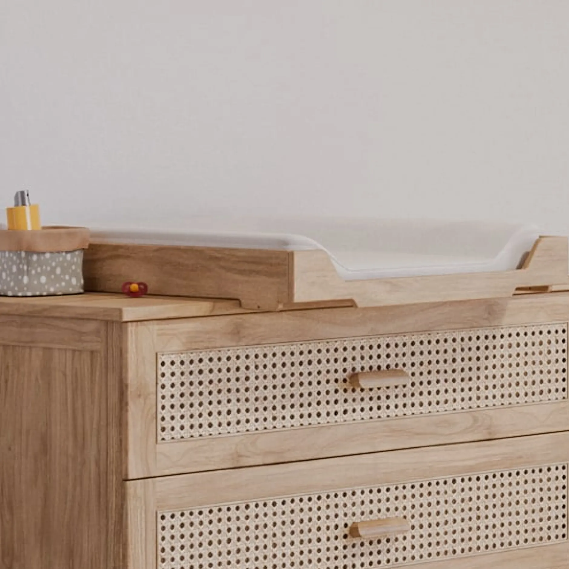 Ce plan à langer s’adapte de façon parfaitement sécure sur les commodes de la collection Nami.