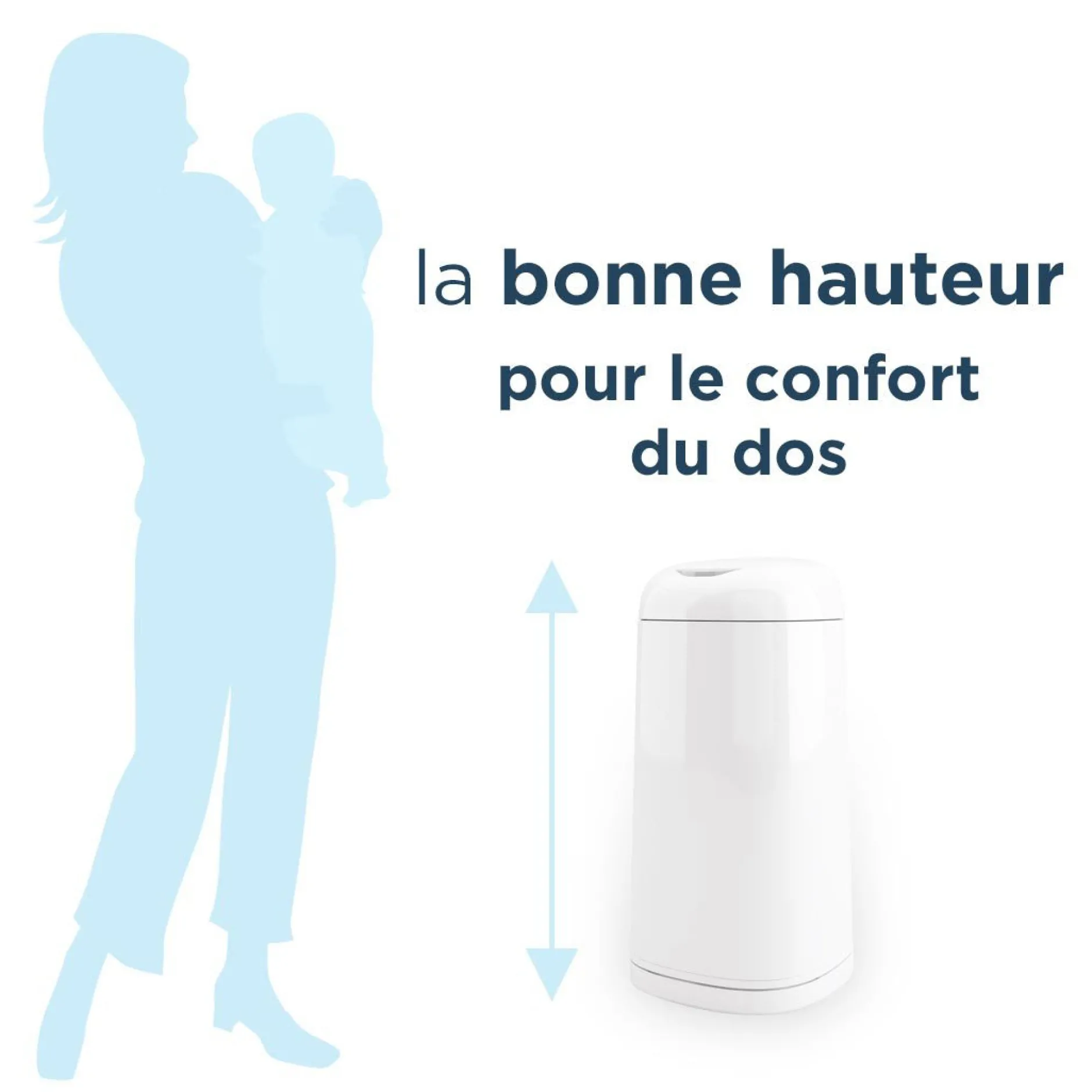- Contenance de la poubelle : jusqu’à 41 couches taille 1 ou 32 couches taille 2
