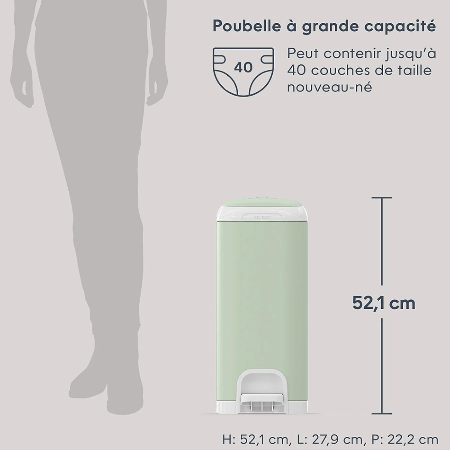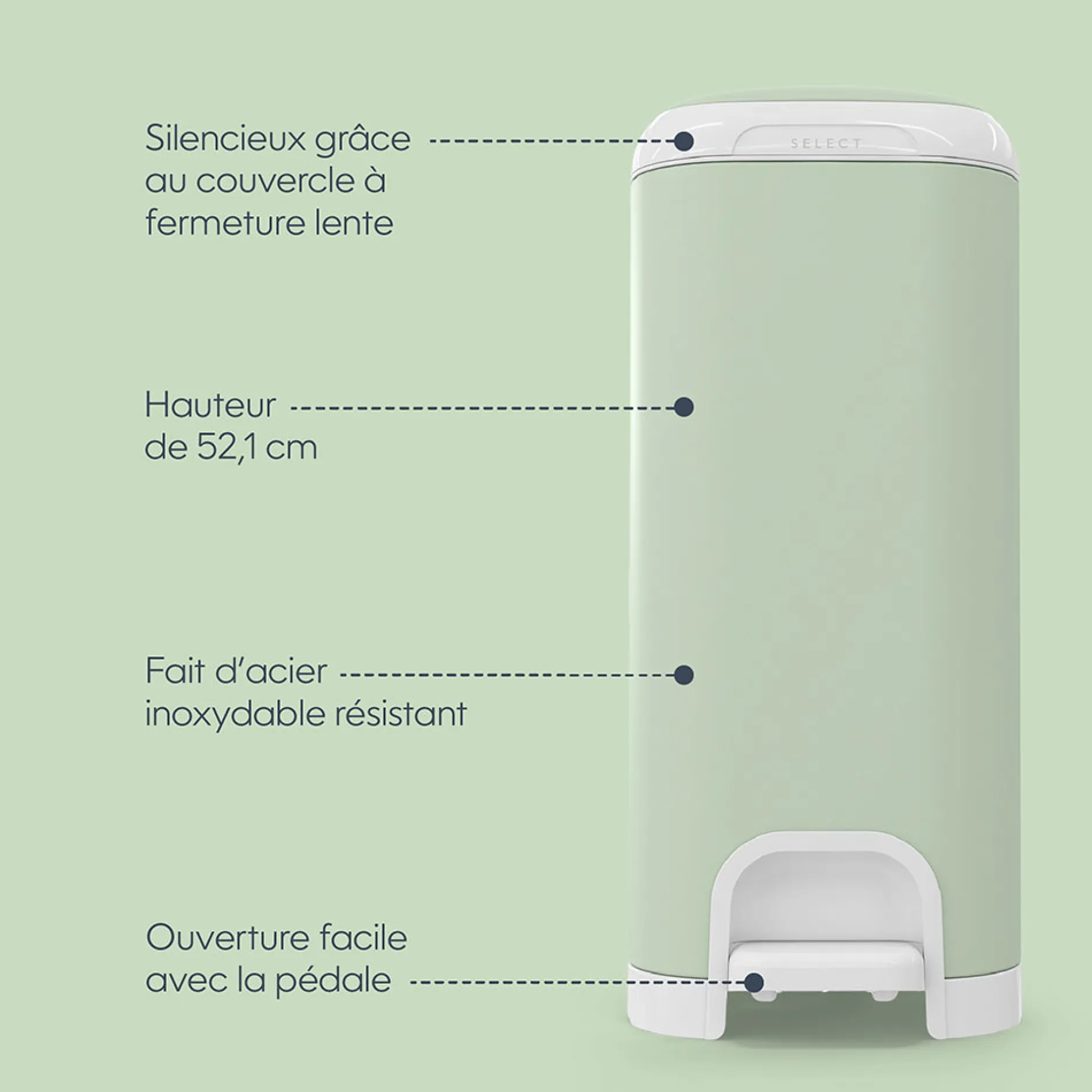 Fabriquée en acier inoxydable durable, la nouvelle Poubelle Diaper Genie Select est dotée d’une pince de blocage des odeurs Push N Lock, qui aide à contenir efficacement les odeurs des couches souillées.Pour plus de commodité, le système de disposition des couches Select présente une hauteur de 52,1 cm et une large ouverture, ainsi qu’une pédale pour une utilisation facile à une seule main.