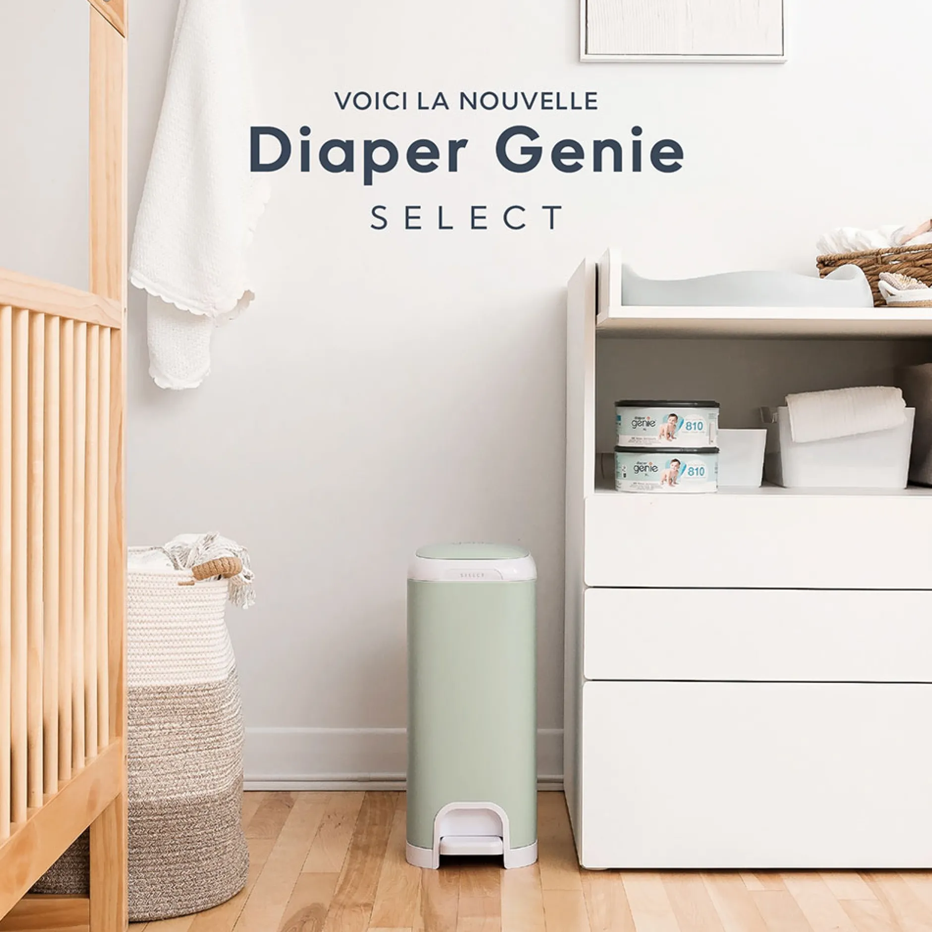 Découvrez la nouvelle poubelle à couches Diaper Genie Select conçue avec style et robustesse pour un ajout raffiné et pratique à votre chambre d’enfant.