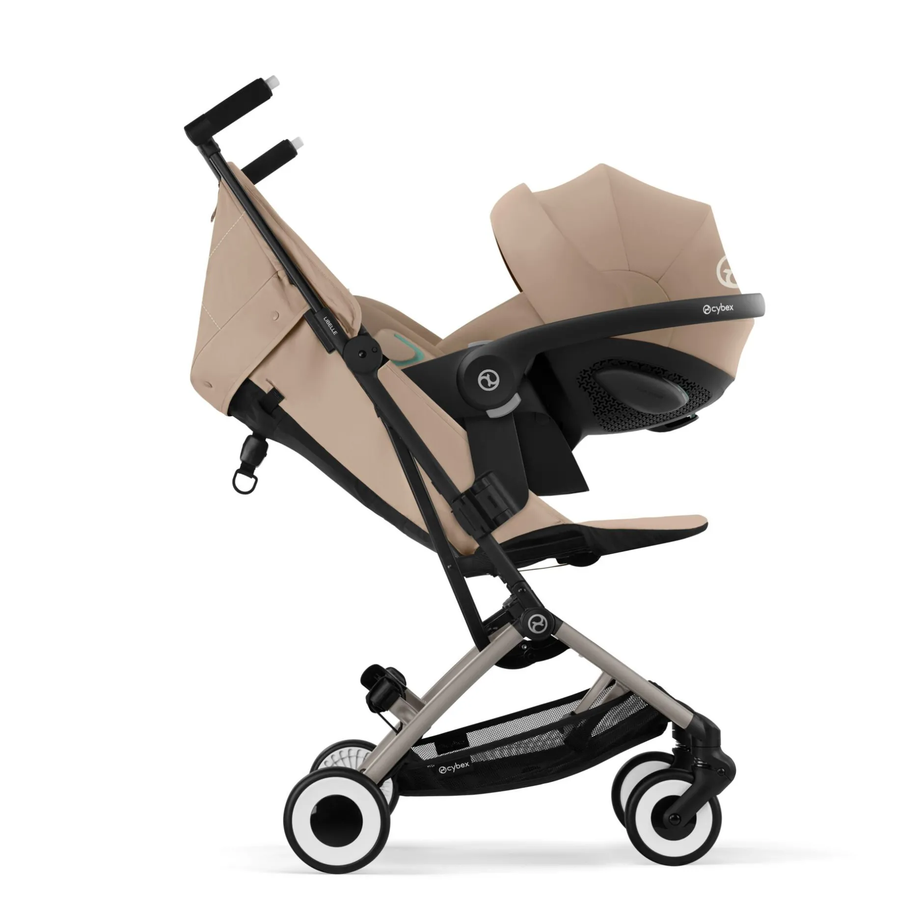 Compatible avec le travel system, la Libelle permet une fixation en toute simplicité d’un siège auto pour bébé CYBEX sur son châssis.