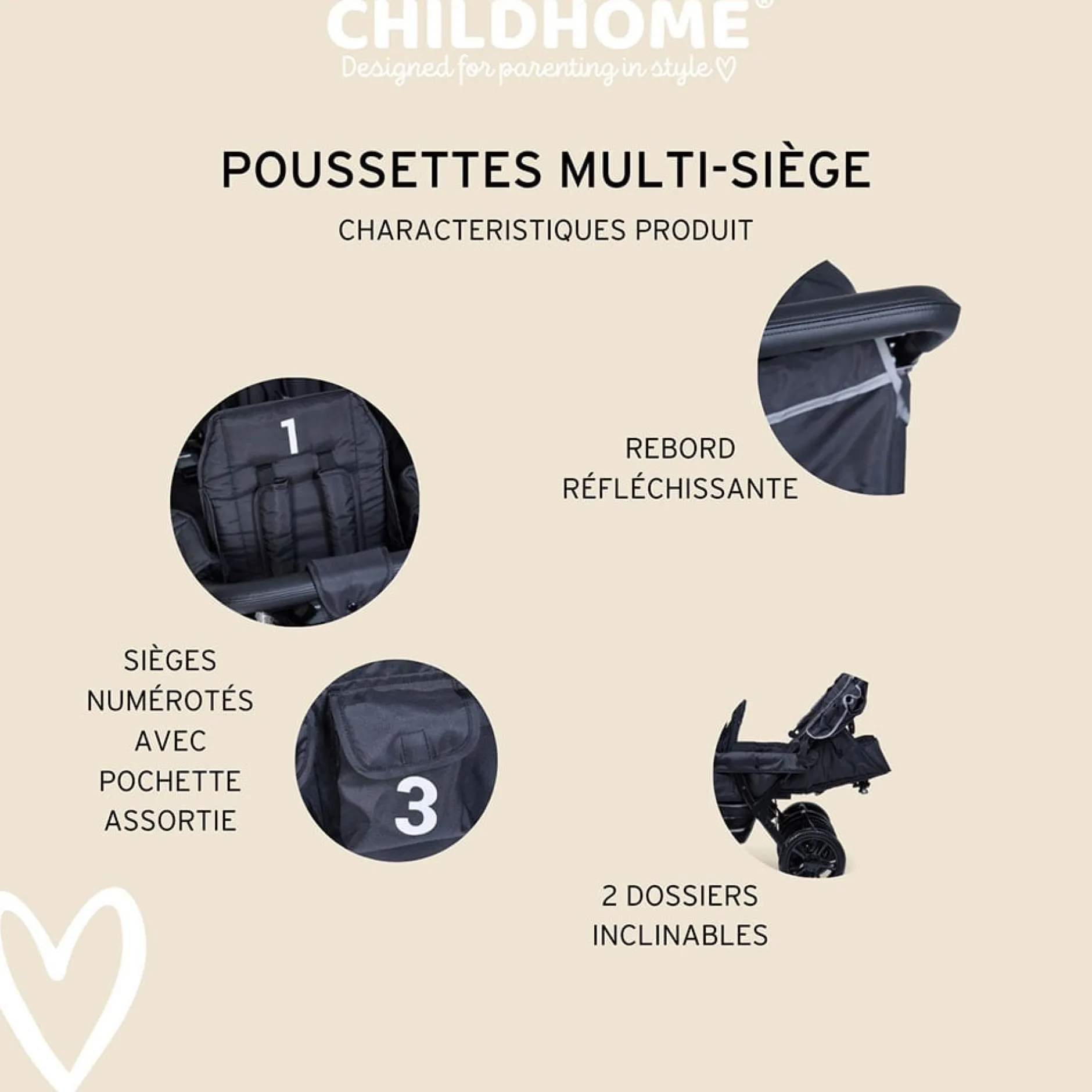 - Poussette multi-places pouvant accueillir jusqu’à 4 enfants