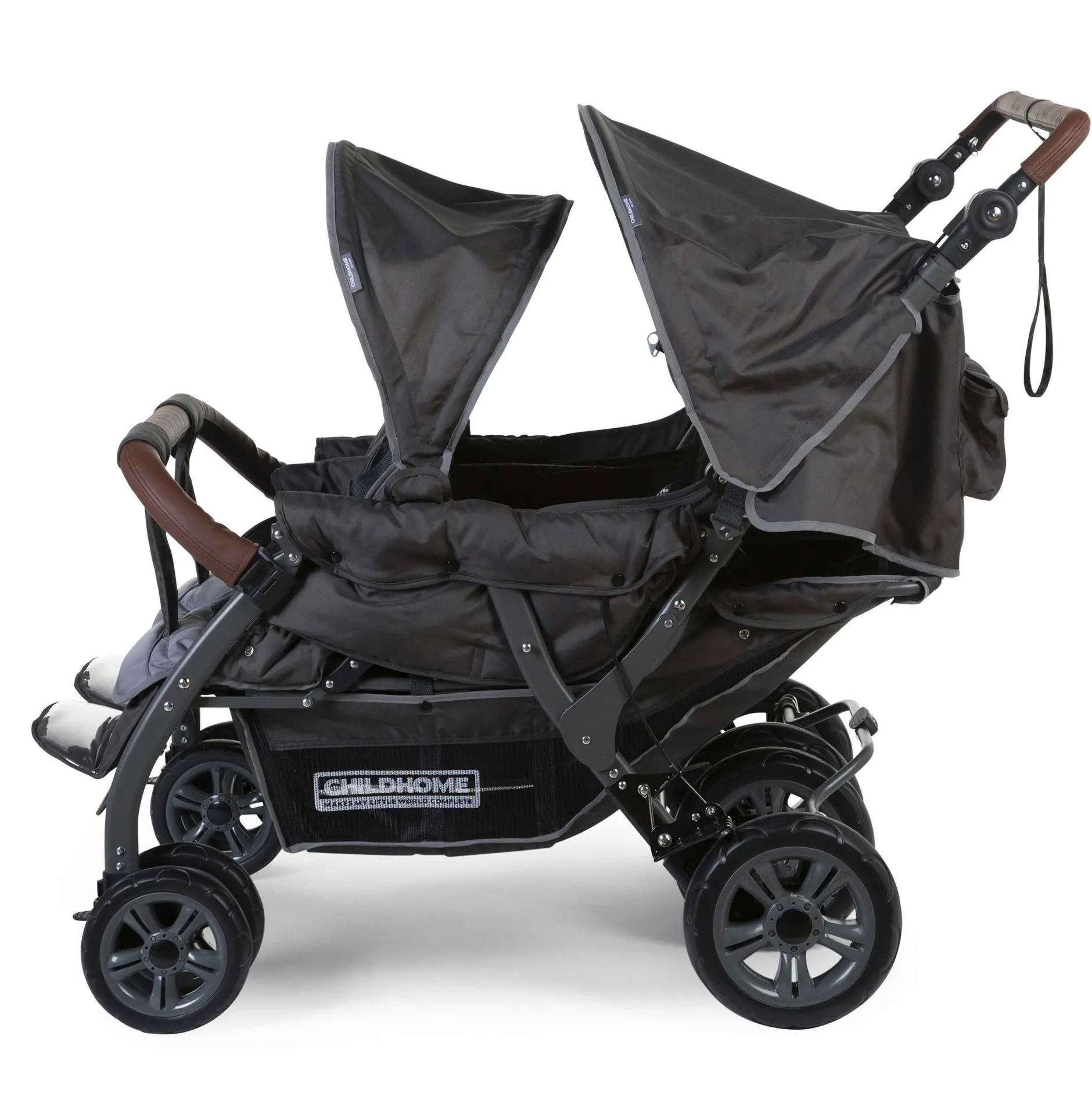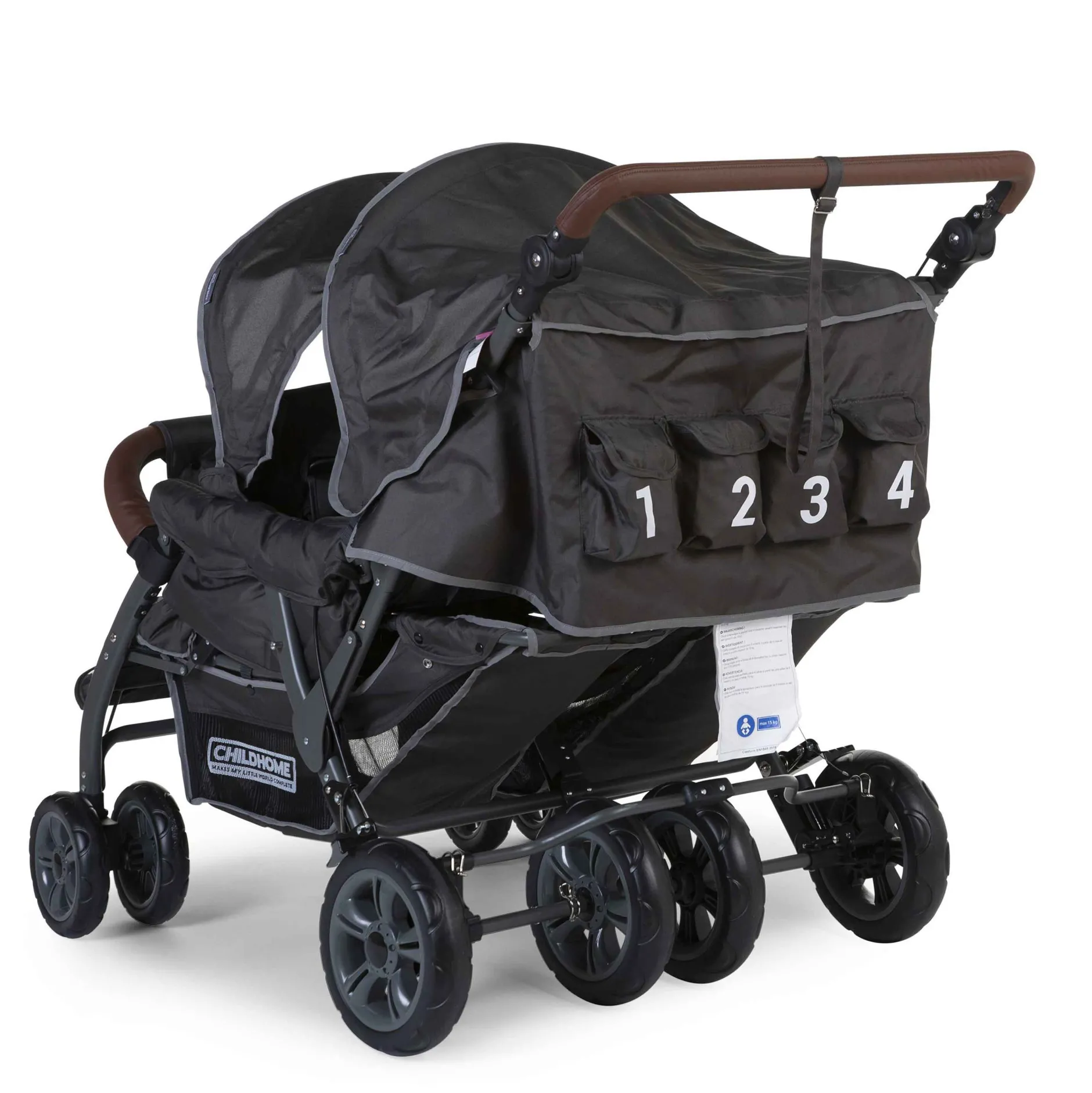 Ce multiplet a des roues pivotantes à l’avant pour une flexibilité maximale et un auto blocage central à l’arrière. Quatre grandes roues à l’avant et à l’arrière offrent plus de stabilité et de convivialité. La poussette multiple a une poignée en cuir tendance et un arceau de sécurité. Les bords sont finis avec des bandes réfléchissantes pour augmenter la visibilité dans l’obscurité. Des sacs plus petits ont été ajoutés avec les numéros correspondant aux sièges. De cette façon, il est facile de se rappeler quelle sucette appartient à quel enfant.