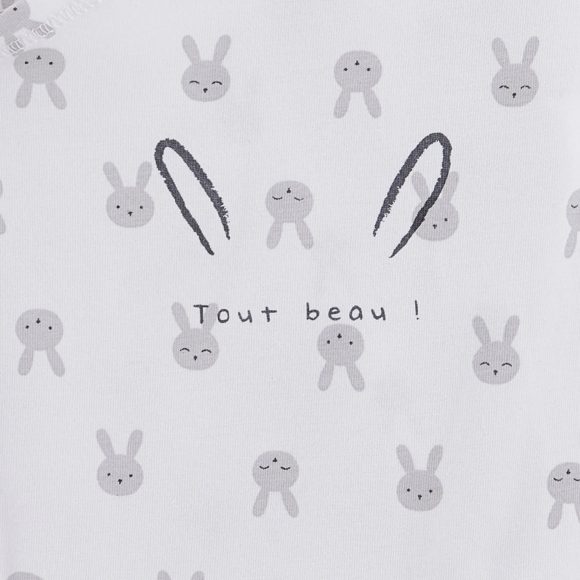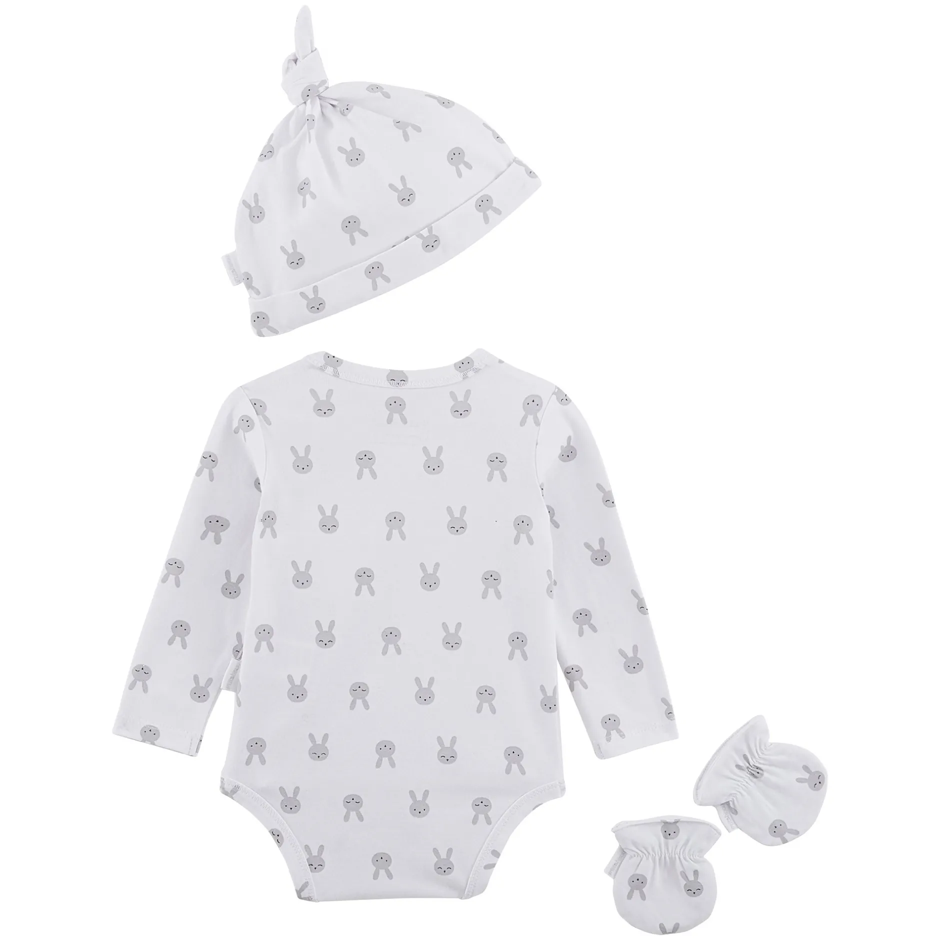 Set P’tit Bisou composé d’un body + 1 bonnet + 1 paire de moufles en jersey blanc imprimé avec des petites têtes de lapins en gris. C’est le set idéal à acheter ou à offrir pour le trousseau maternité ! Le body manches longues est ludique avec son impression devant avec ses oreilles de lapin dessinées mais aussi fonctionnel avec son ouverture totale devant avec ses pressions. Le bonnet a une forme très originale façon pompon noué sur le dessus de la tête et les moufles sont craquantes avec leur petit élastique au poignet pour assurer un bon maintien des mains. Ces moufles sont indispensables pour éviter que bébé se griffe le visage.