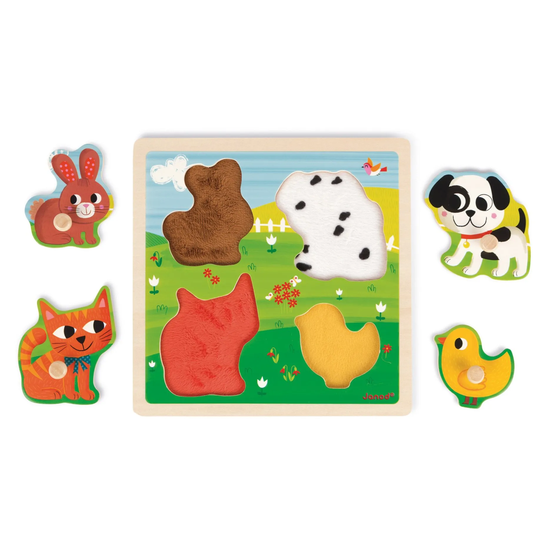 Puzzle tactile de 4 pièces sur le thème « mes premiers animaux », idéal pour développer le toucher de bébé. Découvr…