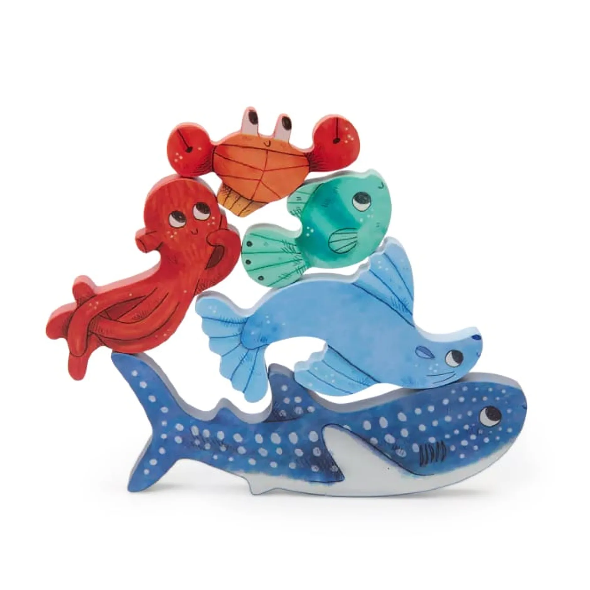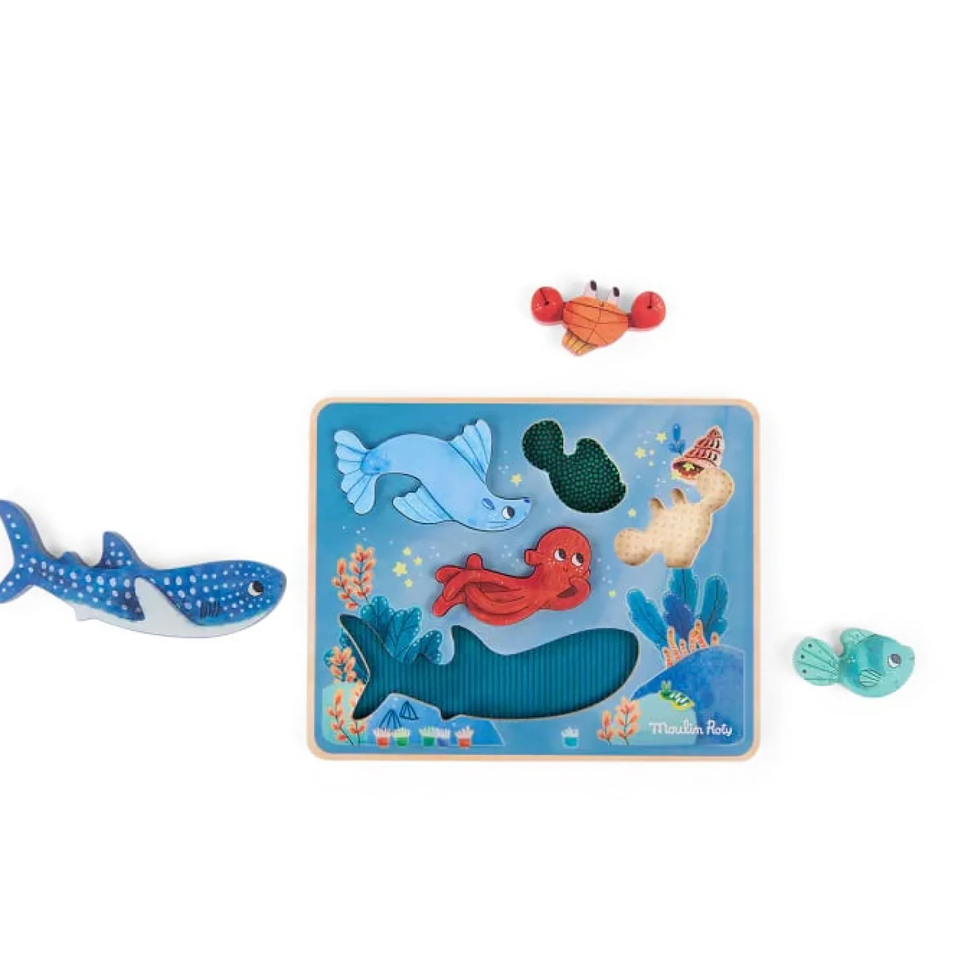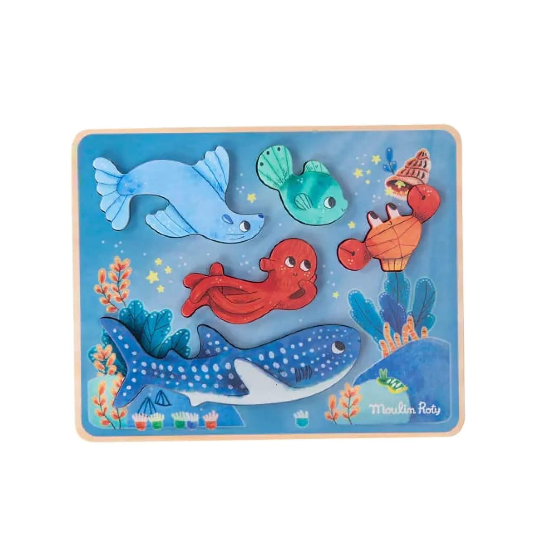 Un puzzle sensoriel composé de 6 pièces encastrables avec Paulie le poulpe et ses amis, pour découvrir les formes, les couleurs et les textures.