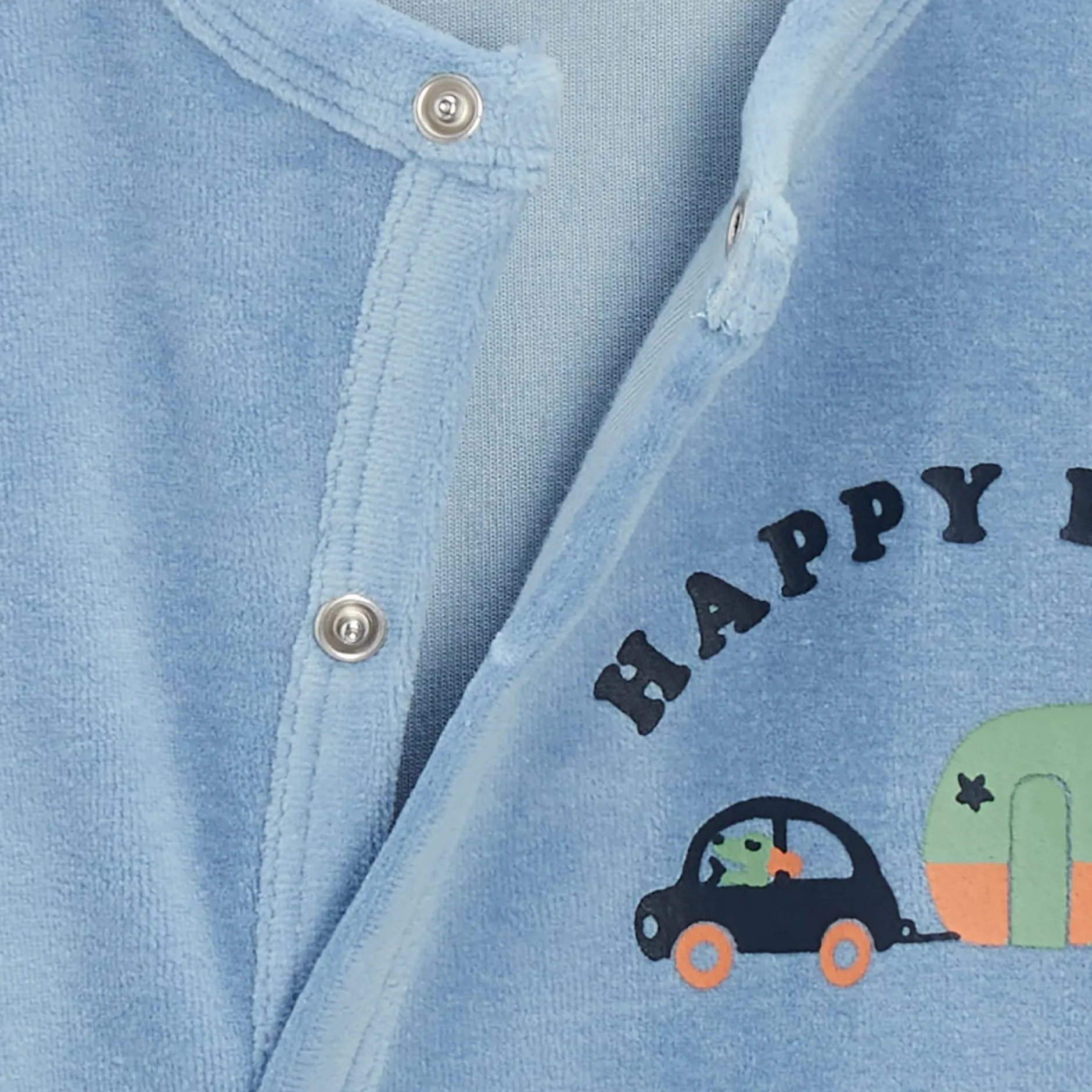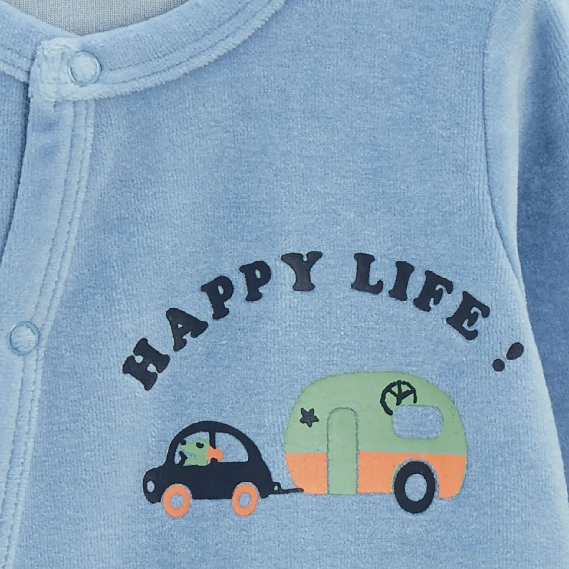 Pyjama P’tit Bisou en velours bleu denim chiné très craquant à encolure ronde. Ouverture fonctionnelle devant par pressions qui évite de trop manipuler bébé. Très jolie animation représentant une voiture et sa caravane avec un texte « Happy life ! » pour un côté très ludique. Le parfait allié des nuits de bébé. Lavage à 30°c.