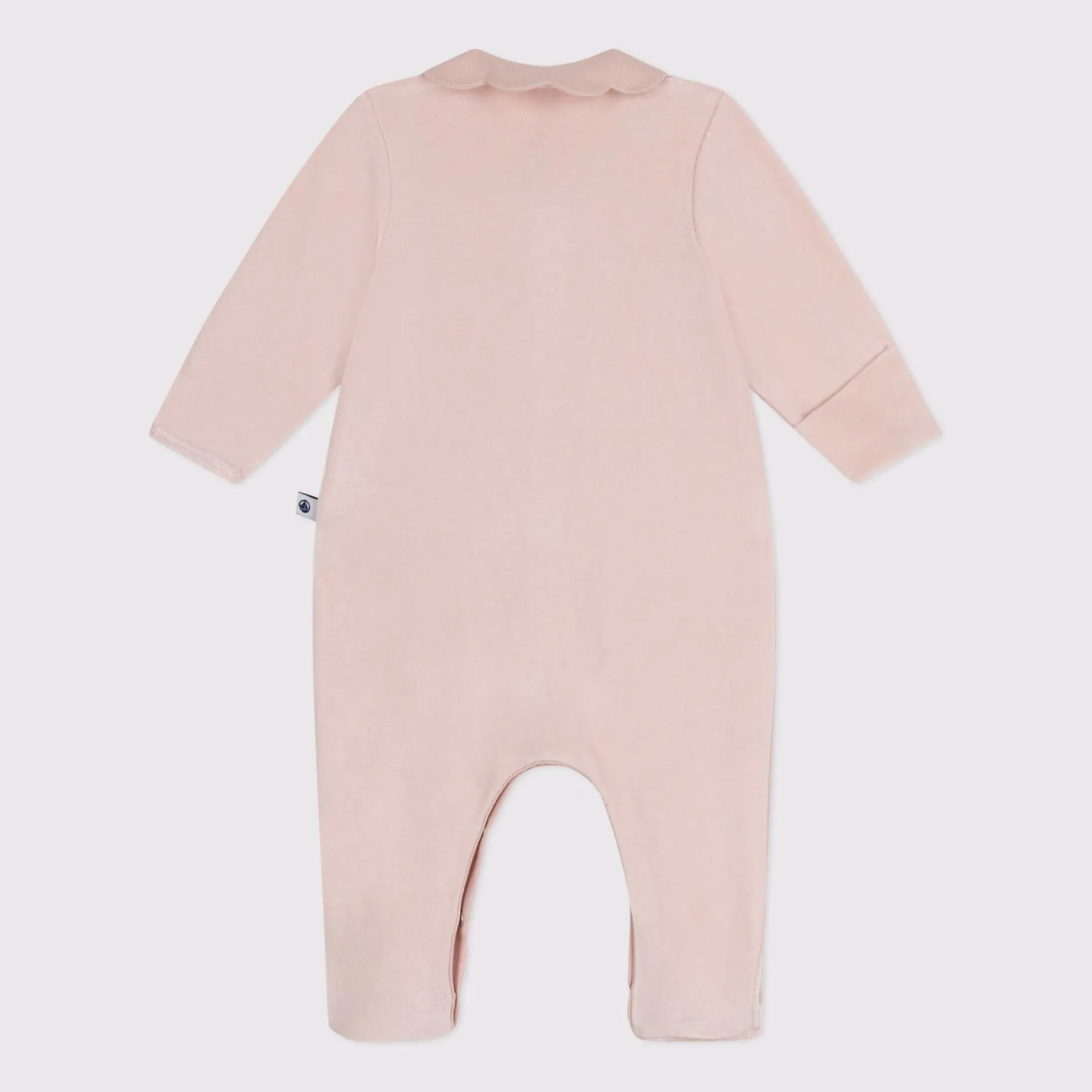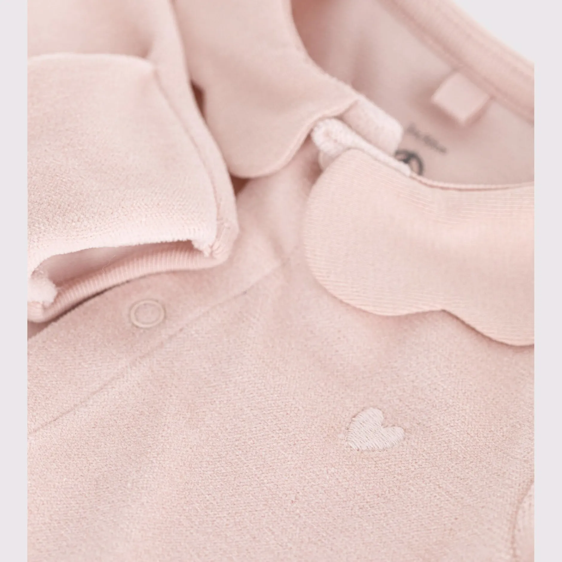 Dors biene n velours, une matière douce et chaude. Ouverture pressionnée sur l’avant et à l’entrejambe. Ce pyjama raffiné, avec un joli col pétale et des moufles intégrées, est idéal pour les premiers jours du bébé. Broderie cœur en poitrine