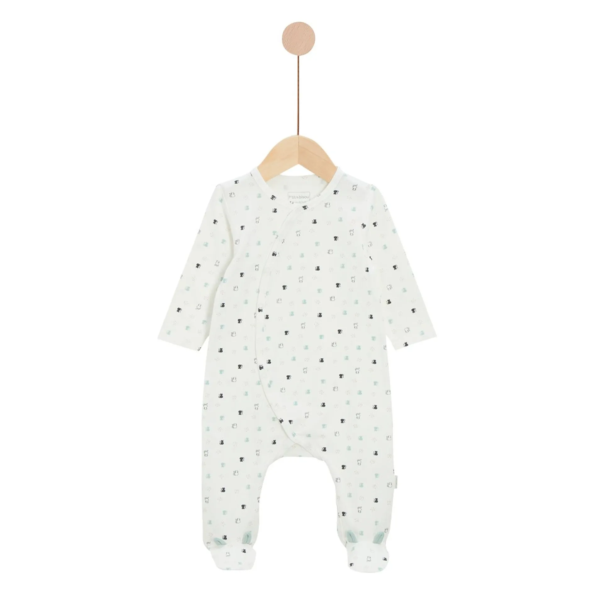Pyjama P’tit Bisou en jersey écru avec imprimé « petits chats ». Il est tellement mignon avec les petites oreilles en jersey vert sauge qui dépassent sur les pieds !