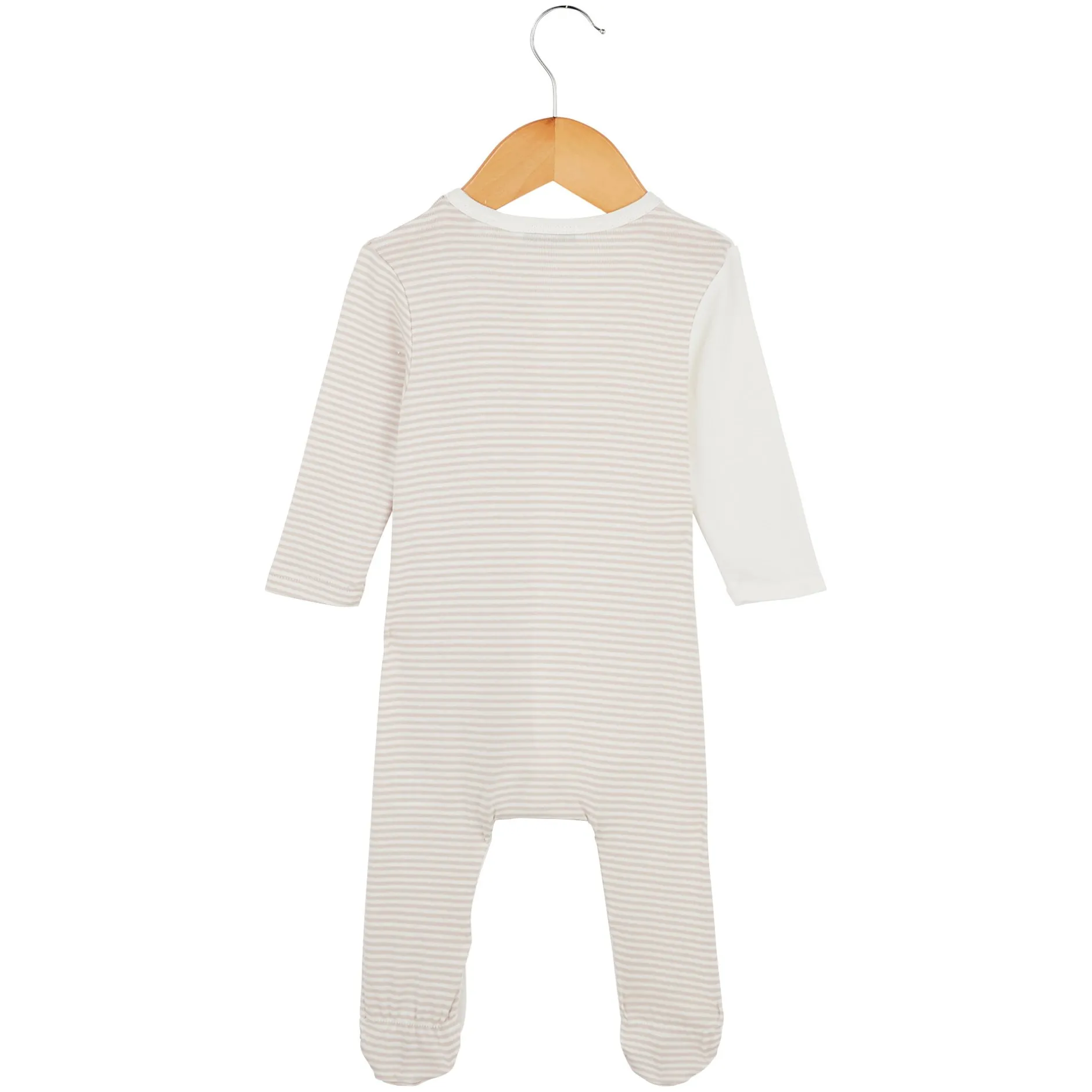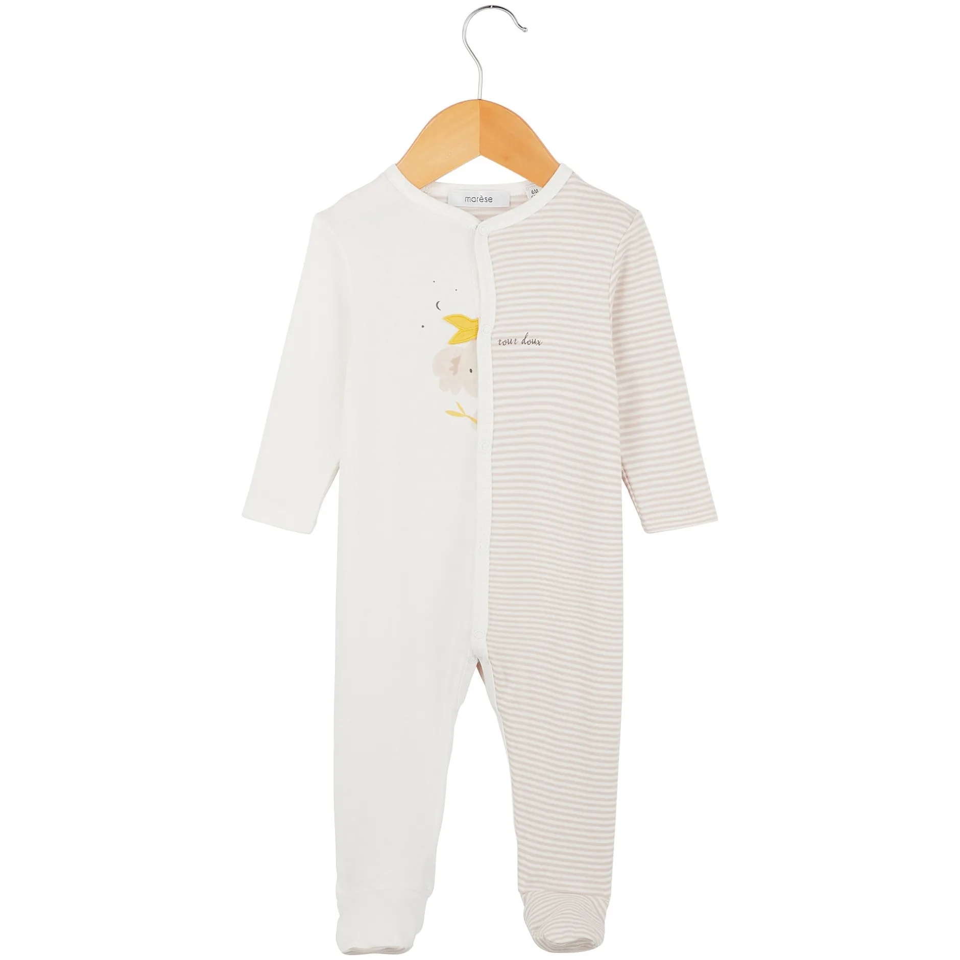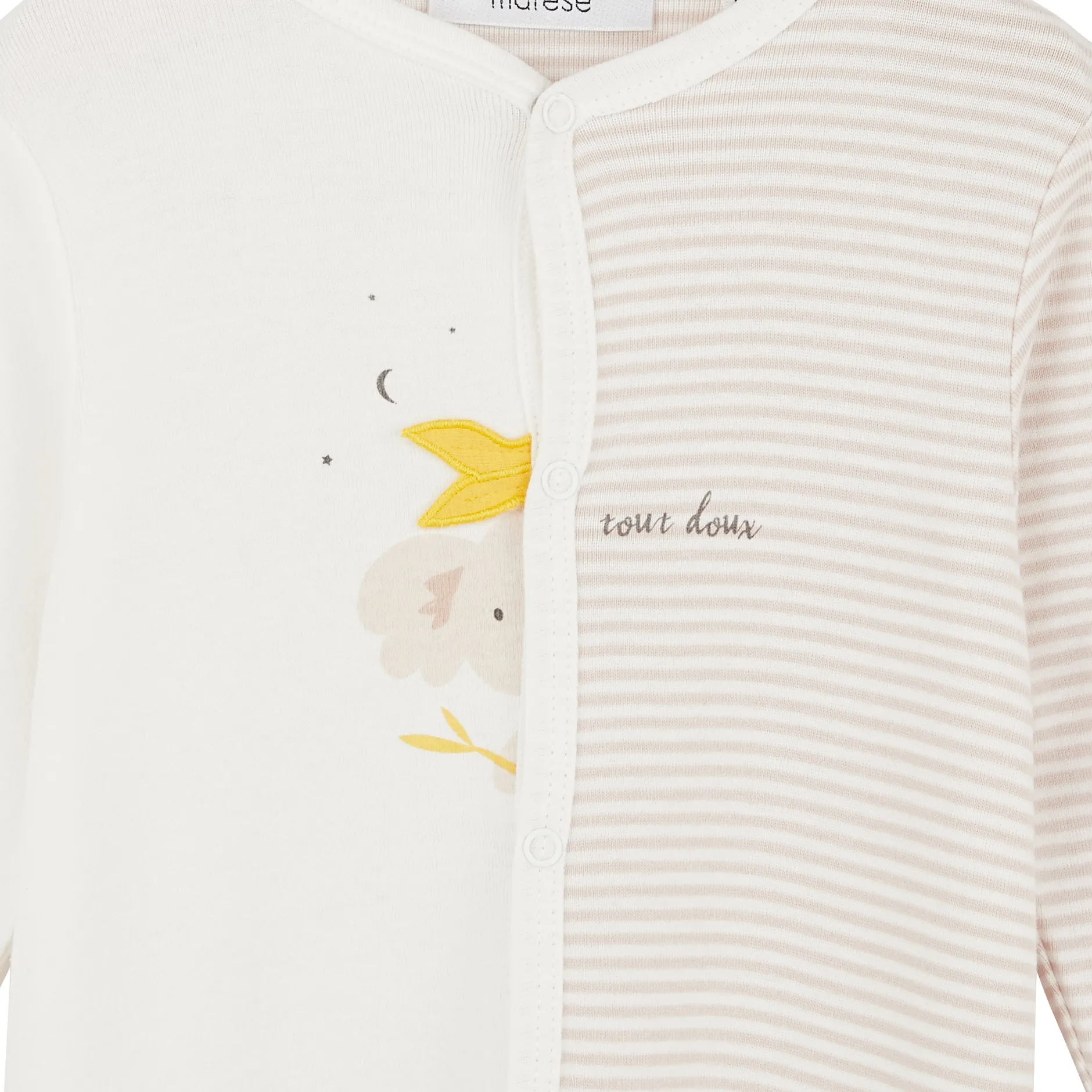 Pyjama Marèse en coton bio jersey côtelé : 1 côté uni écru et 1 côté à rayures beige/écru. Ce pyjama est plus léger et sera idéal pour les températures plus clémentes. Il est très mignon et fonctionnel avec son ouverture sur l’avant et à l’entrejambes par pressions qui évite de trop manipuler Bébé pendant le change. Son encolure est ronde.