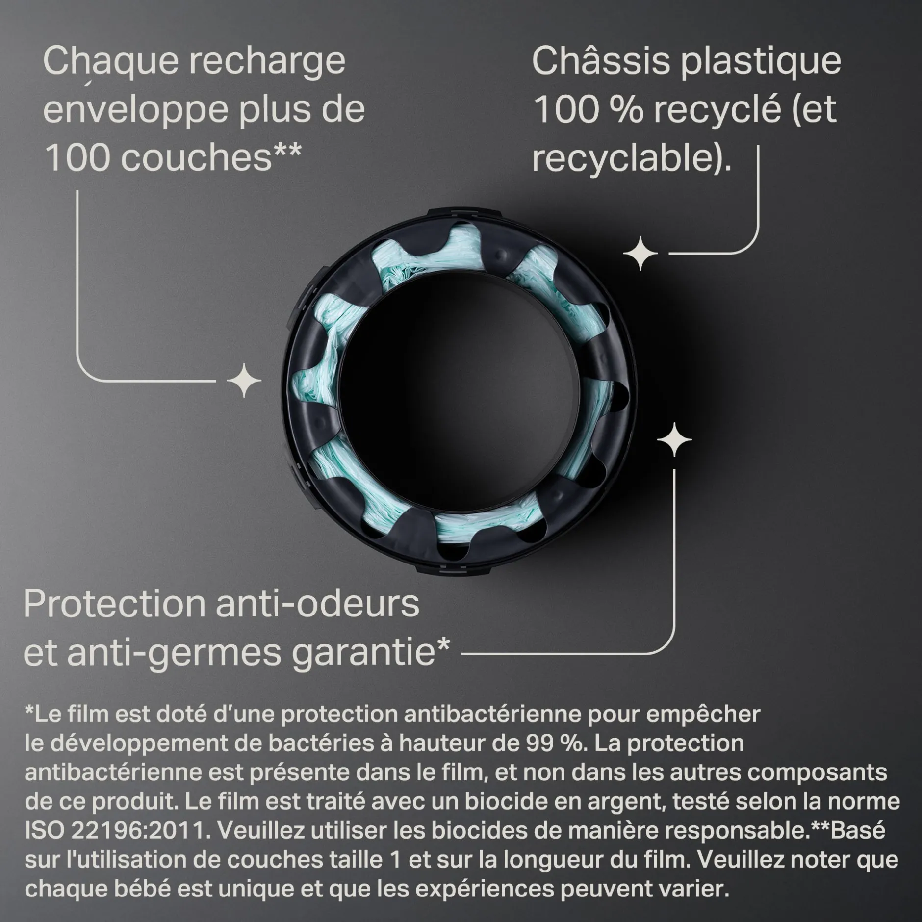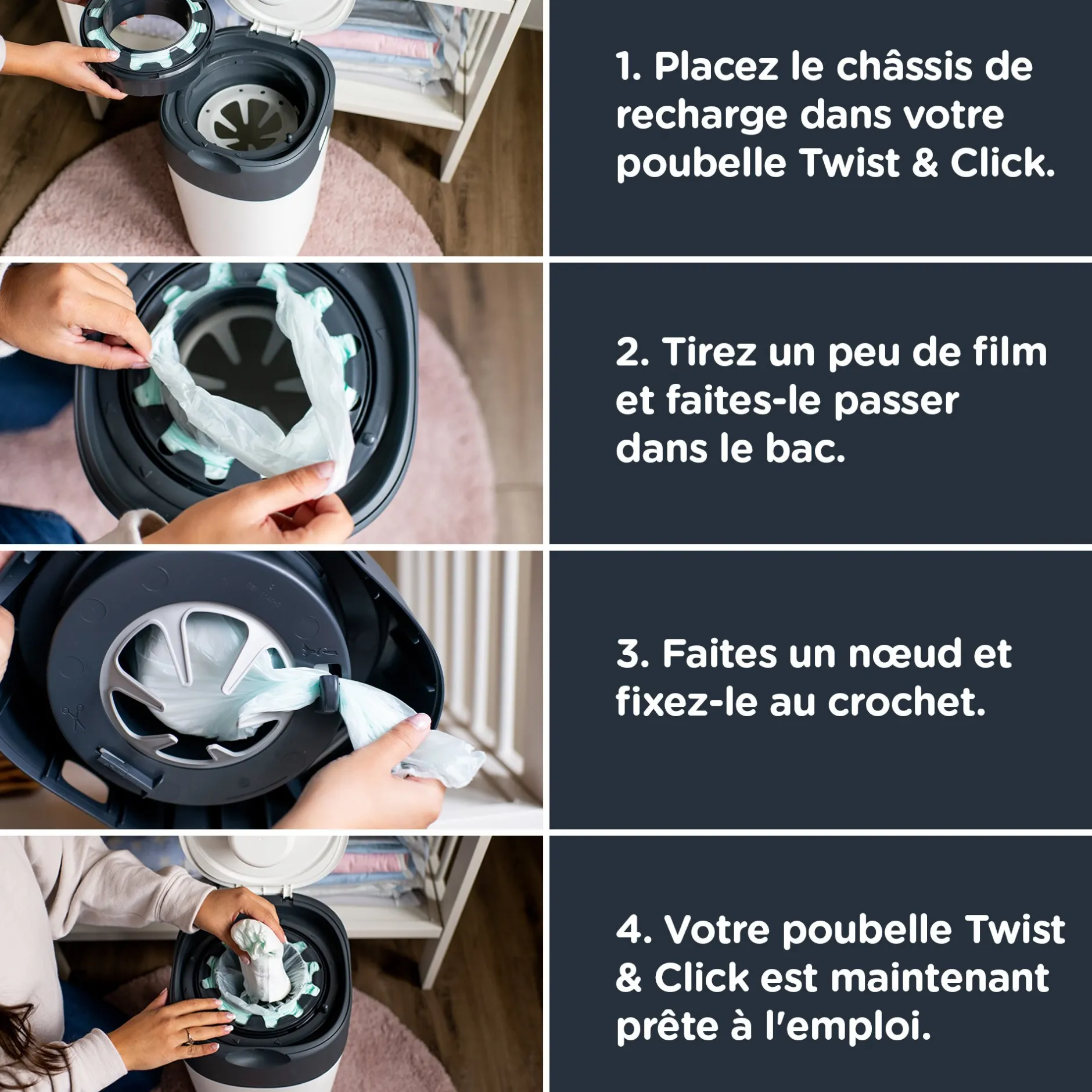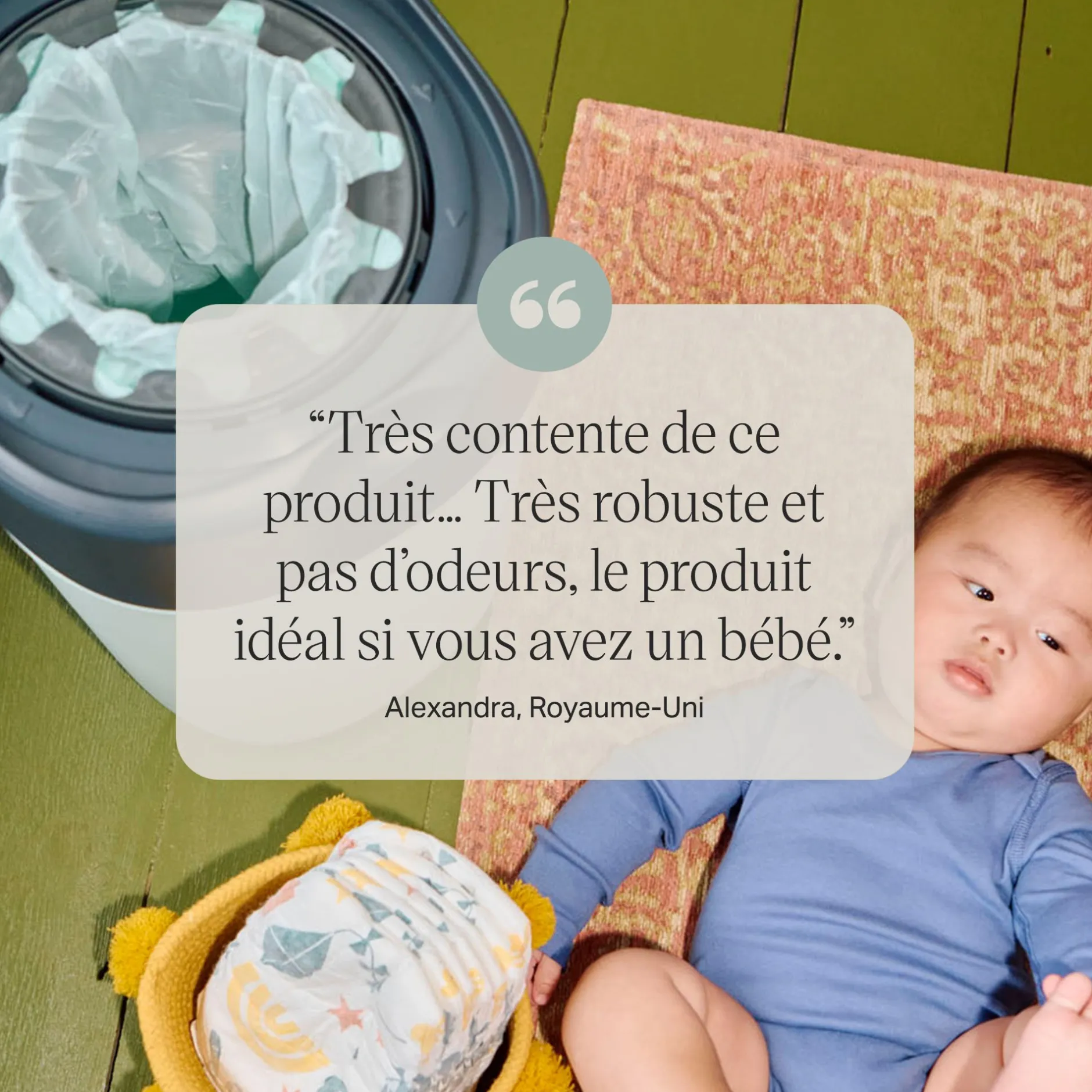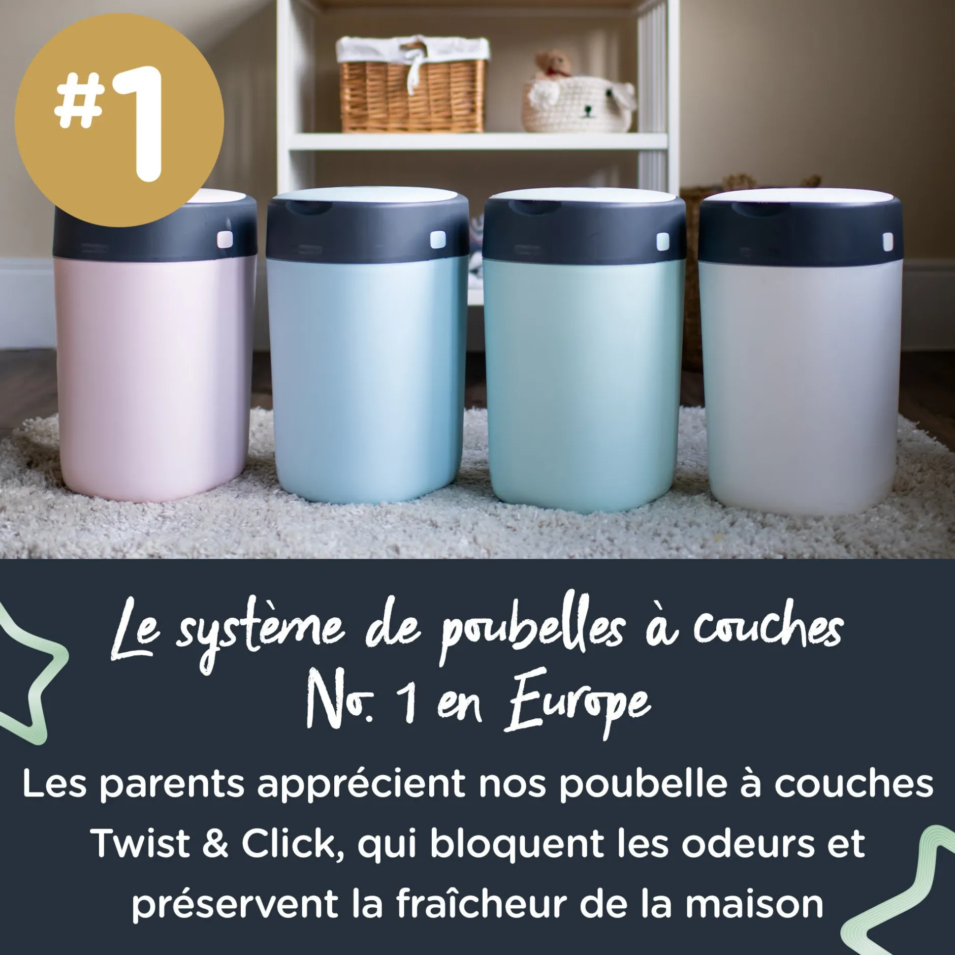 - La poubelle à couches n°1 en Europe** : Partout en Europe, les parents adorent nos poubelles à couches Twist & Click et leurs recharges, elles bloquent les odeurs et gardent votre maison propre et fraîche
