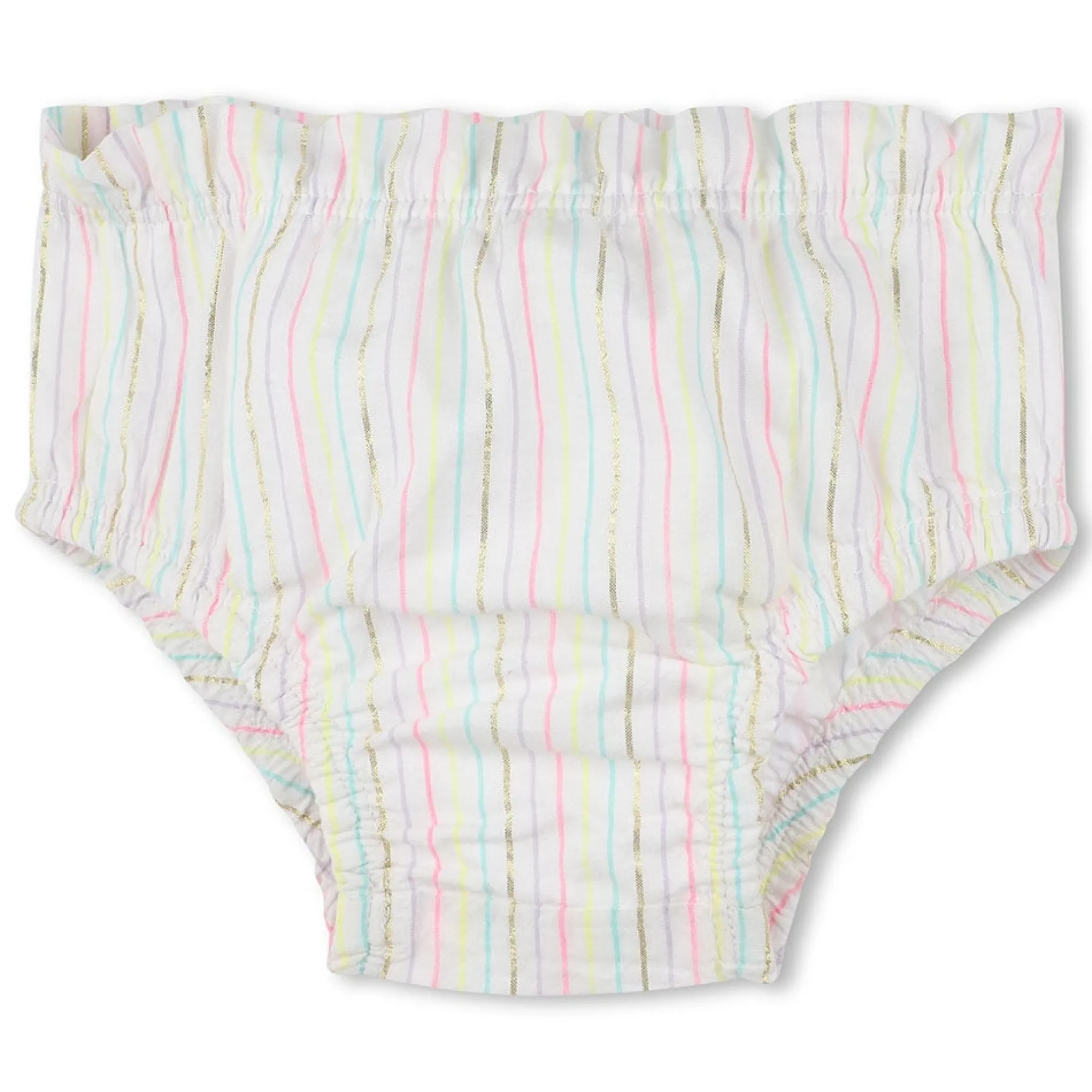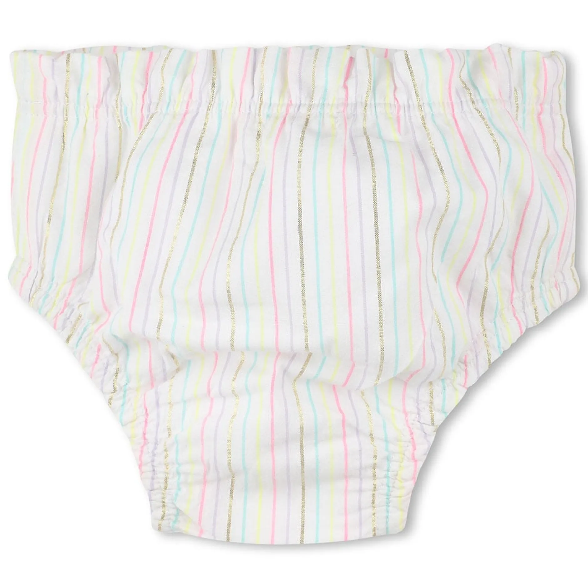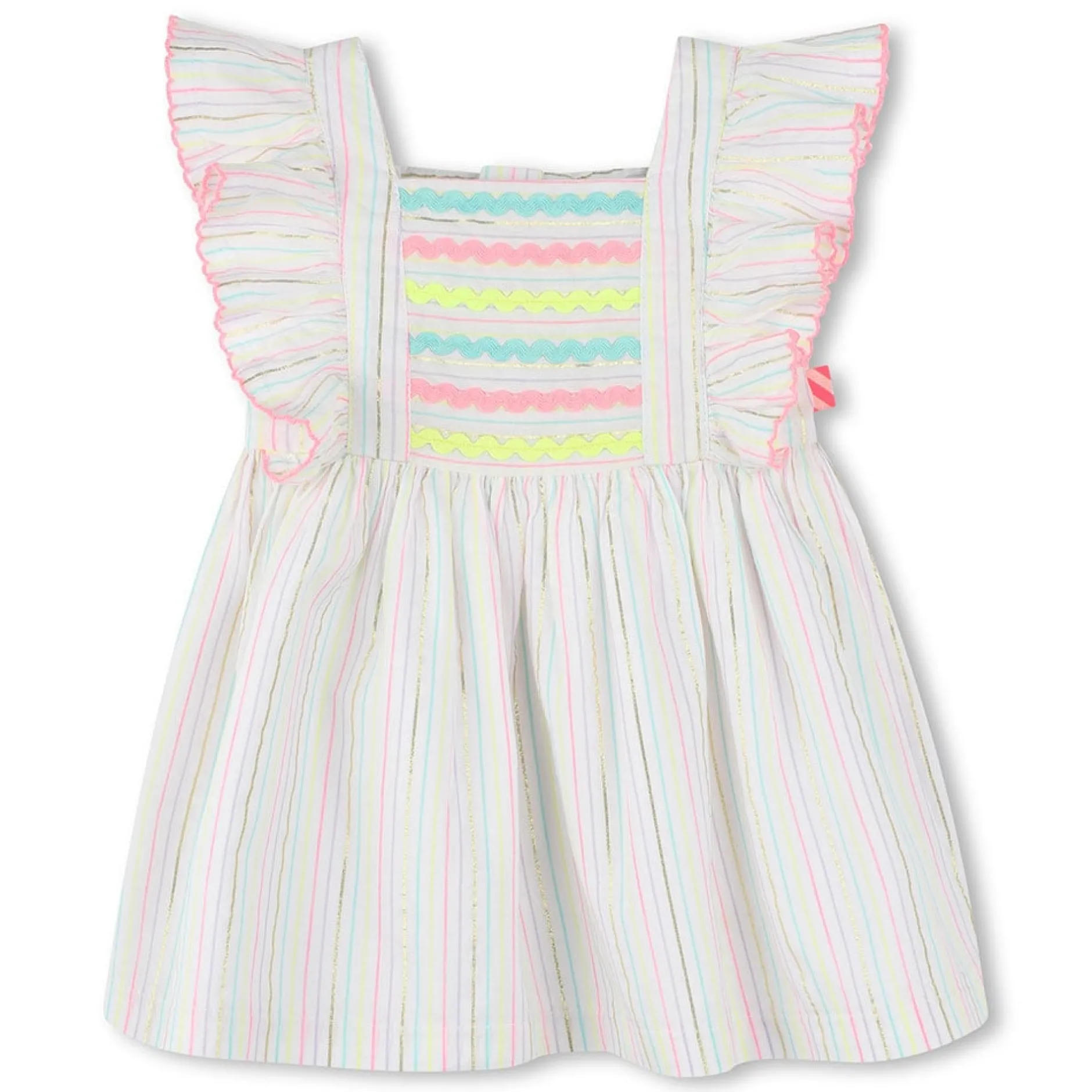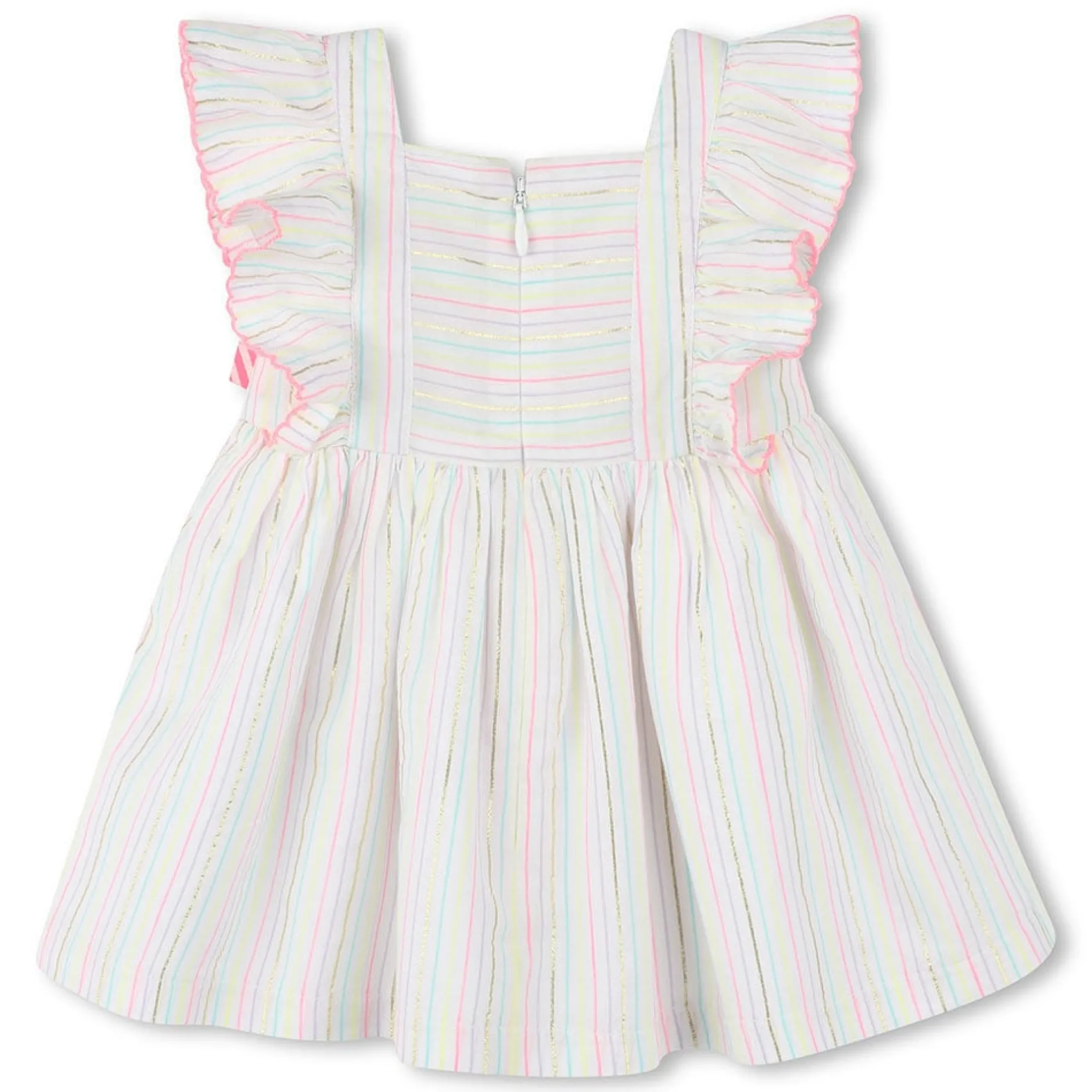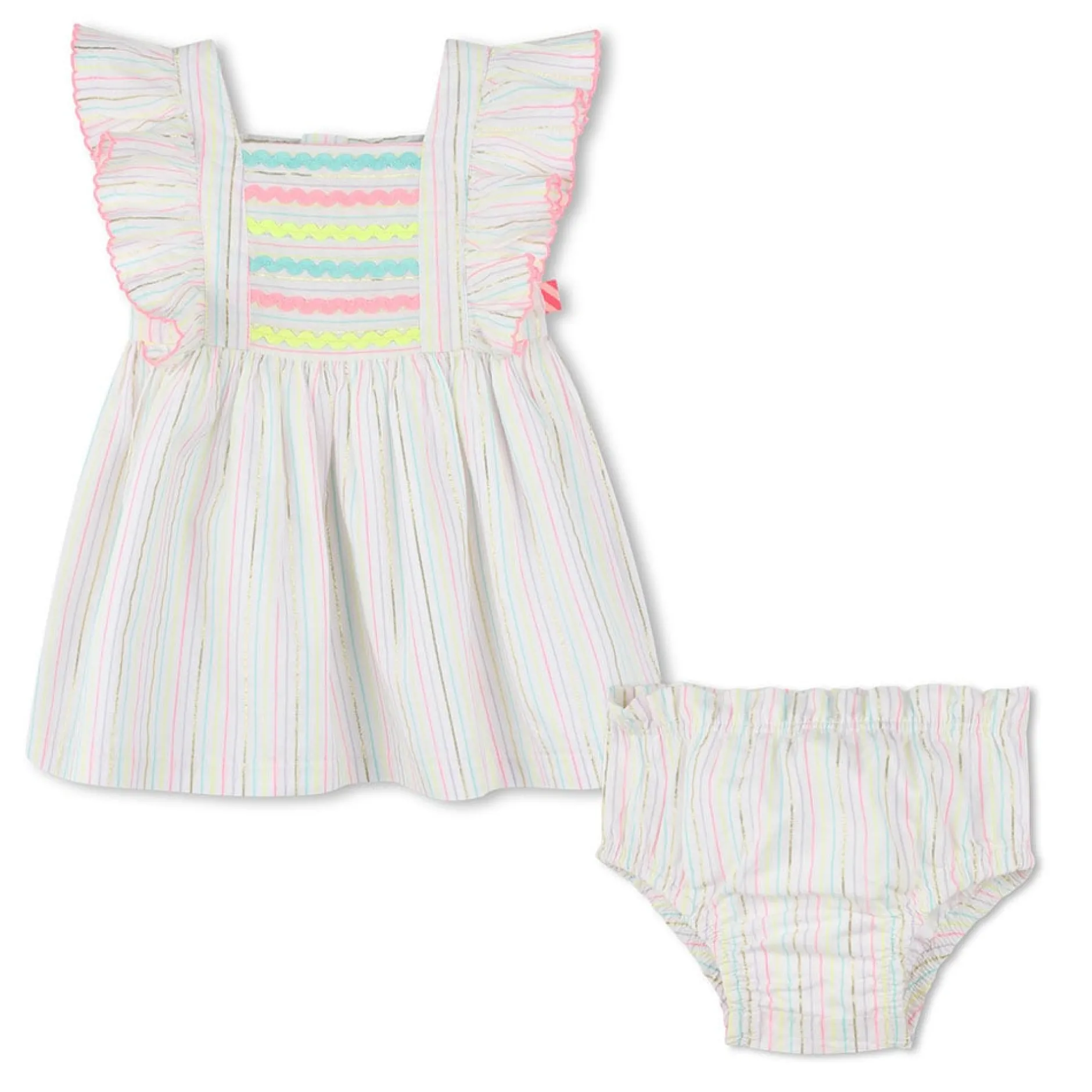 Ensemble robe et bloomer en percale de coton, rayé avec fils brillant, manches volants, fermeture zippée dans le dos, détails multicolores fantaisies devant, étiquette rayée.