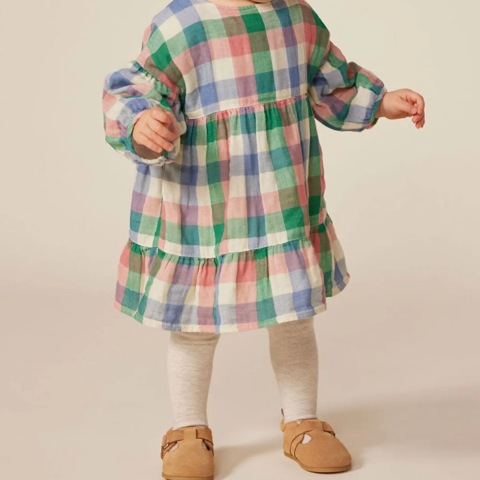 Robe en gaze de coton, une matière légère et confortable. Adorable avec son imprimé carreaux er sa découpe à la taille ! Ouverture à boutons-pression au dos pour faciliter l’enfilage.