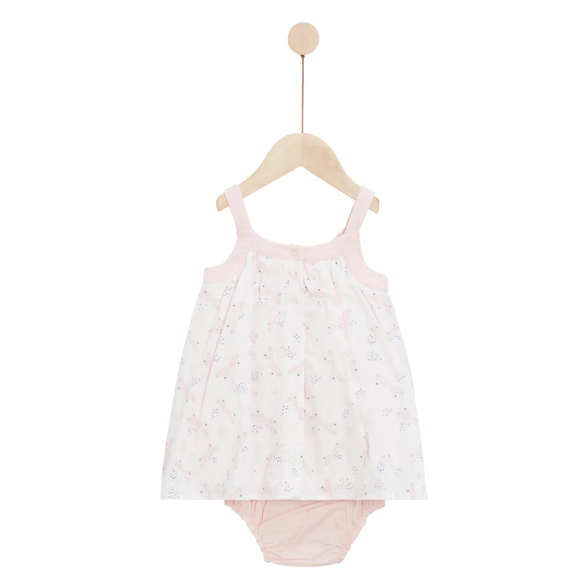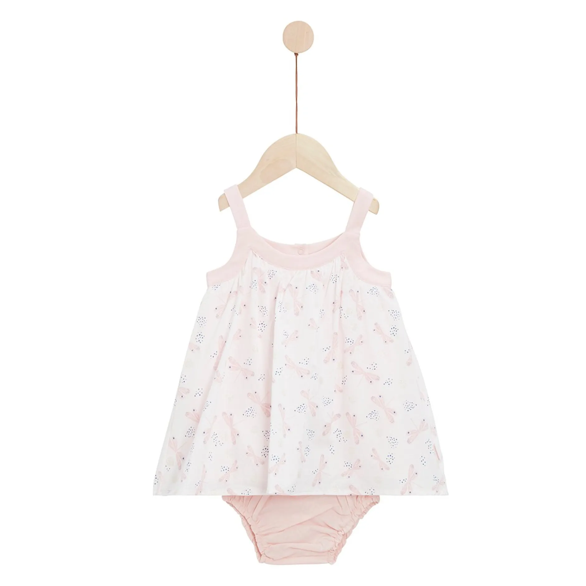 Robe + bloomer (cache-couche) P’tit Bisou en voile de coton rose en imprimé « libellules » dans les camaïeux de roses et parsemé de pois dorés. La forme est très tendance avec ses bretelles rose qui donnent un beau rendu et un beau volume donné par des fronces devant.
