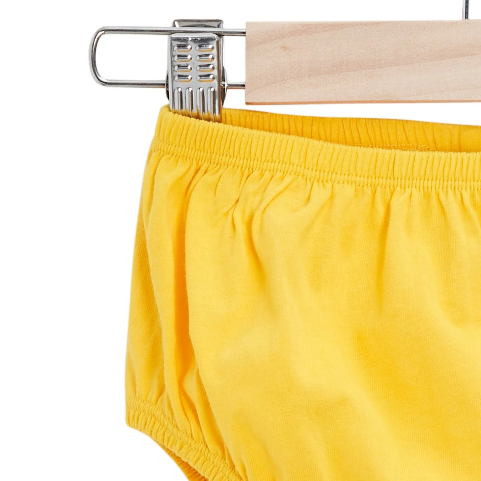 Robe + bloomer (cache-couche) P’tit Bisou en voile de Coton blanc en imprimé « marguerites » sur fond écru. La forme est très féminine avec ses manches « ballons » qui donnent un beau rendu féminin. La robe est entièrement doublée de voile pour des finitions parfaites et éviter la transparence. Ouverture dos par petits boutons gravés « p’tit bisou » en ton sur ton . Le bloomer ou cache- couche est en jersey jaune soleil. La pièce craquante et indispensable dans le vestiaire de bébé ! Lavage conseillé à 30°c.