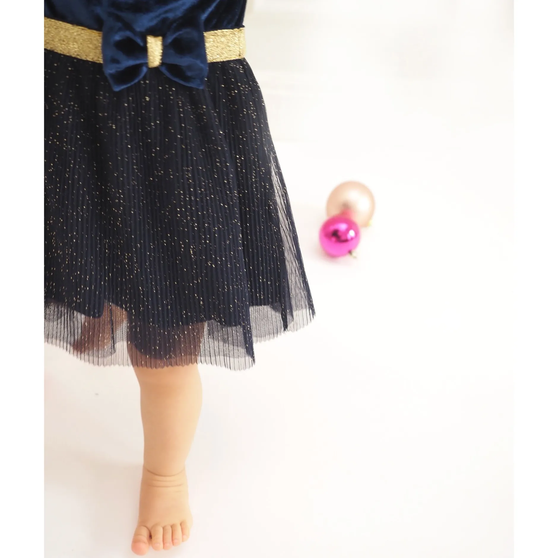 Les paillettes sur la jupe, le nœud en velours au niveau de la ceinture, le liseré doré et le velour du haut sont le combo gagnant pour une tneue de fête confortable.