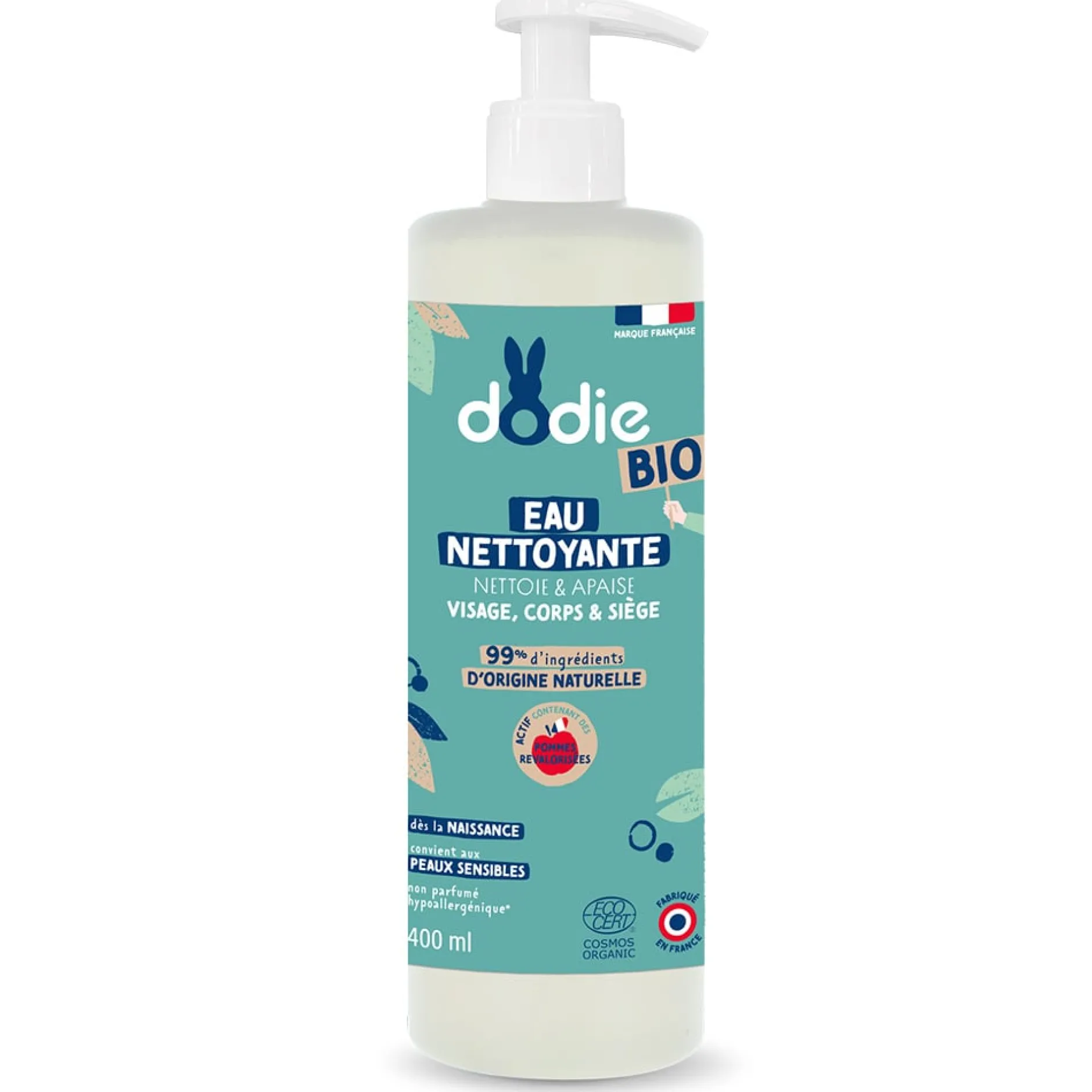Cette Eau nettoyante Bio Dodie renferme des extraits de bébés pommes bio. Extraites des arbres pour permettre aux autres pommes de se développer correctement, ces petites pommes sont promises à la benne, car non consommables. Dodie, dans une démarche anti-gaspi, récupère ces « bébés pommes » et les revalorise afin d’exploiter leurs remarquables propriétés antioxydantes capables de protéger et renforcer la peau de bébé.