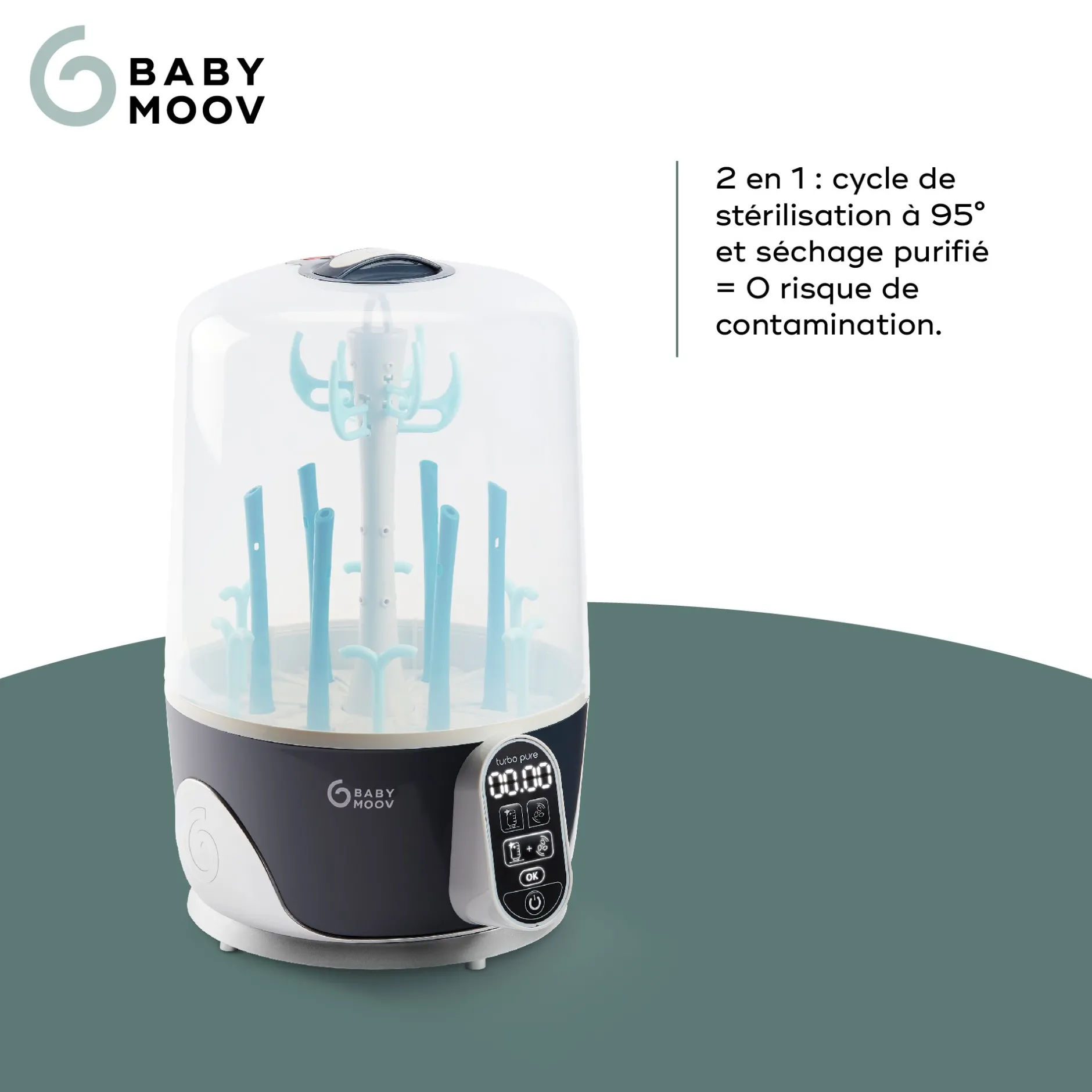Saviez-vous que le système immunitaire de votre bébé et sa flore intestinale commence à se développer lorsqu’il a 6 mois? Avant cela, votre tout petit est très sensible aux bactéries que l’on peut retrouver un petit peu partout dans notre cuisine. Babymoov et ses parents co-créateurs se sont mobilisés pour vous apporter LA solution ! Du choix des fonctions à la simplicité d’utilisation en passant par le design rien n’a été laissé au hasard 😉 Le Turbo Pure stérilise biberons et accessoires, les sèche et les conserve dans un environnement purifié. Le tout naturellement et simplement !