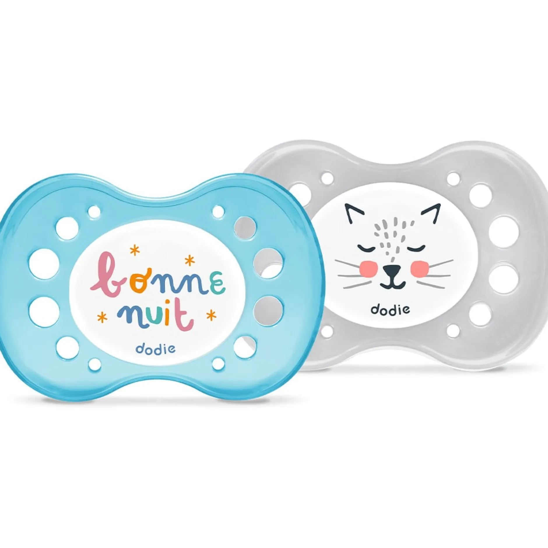 Lot de 2 sucettes anatomiques Nuit, motif Je rêve/Bonne nuit, pour les bébés de plus de 6 mois. Avec leur design ludique, ces sucettes feront rêver les parents autant que les bébés ! Leur tétine de forme anatomique est en silicone, et elles sont spécialement adaptées aux bébés de plus de 6 mois pour satisfaire leur besoin naturel de succion.