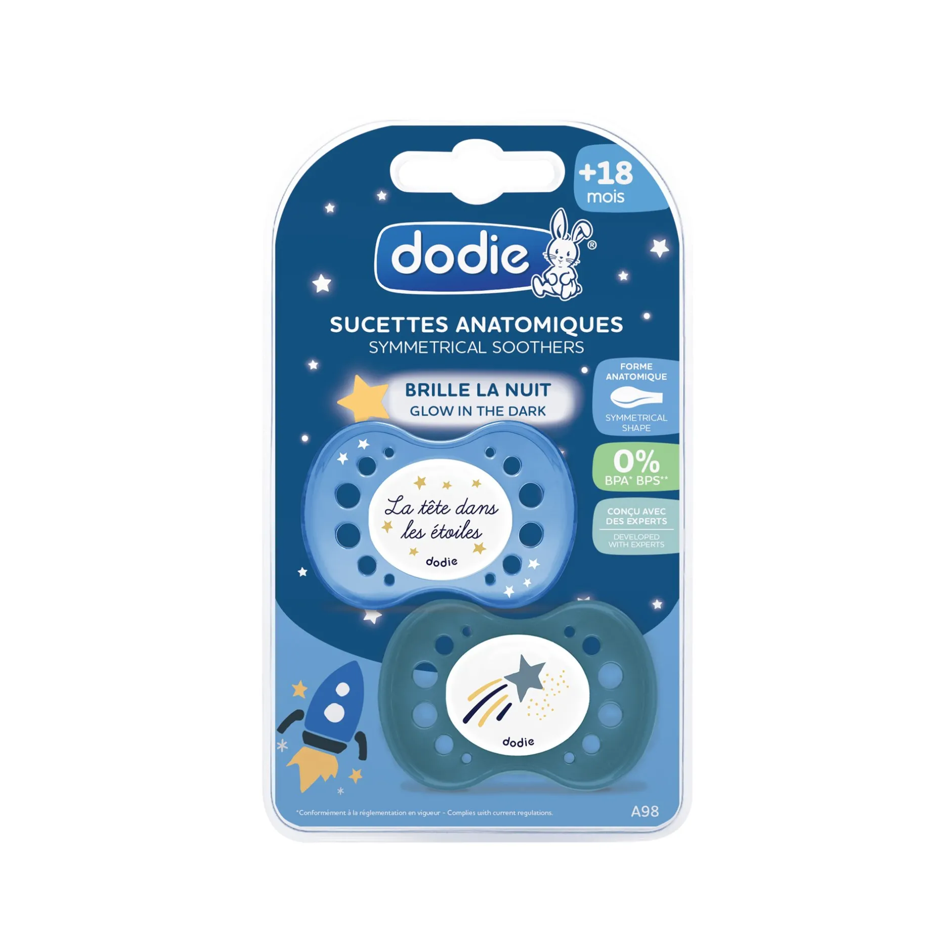 Lot de 2 sucettes anatomiques Dodie Nuit, coloris aléatoires,. Conçues avec des experts, la forme anatomique de ces sucettes favorise un bon positionnement en bouche.