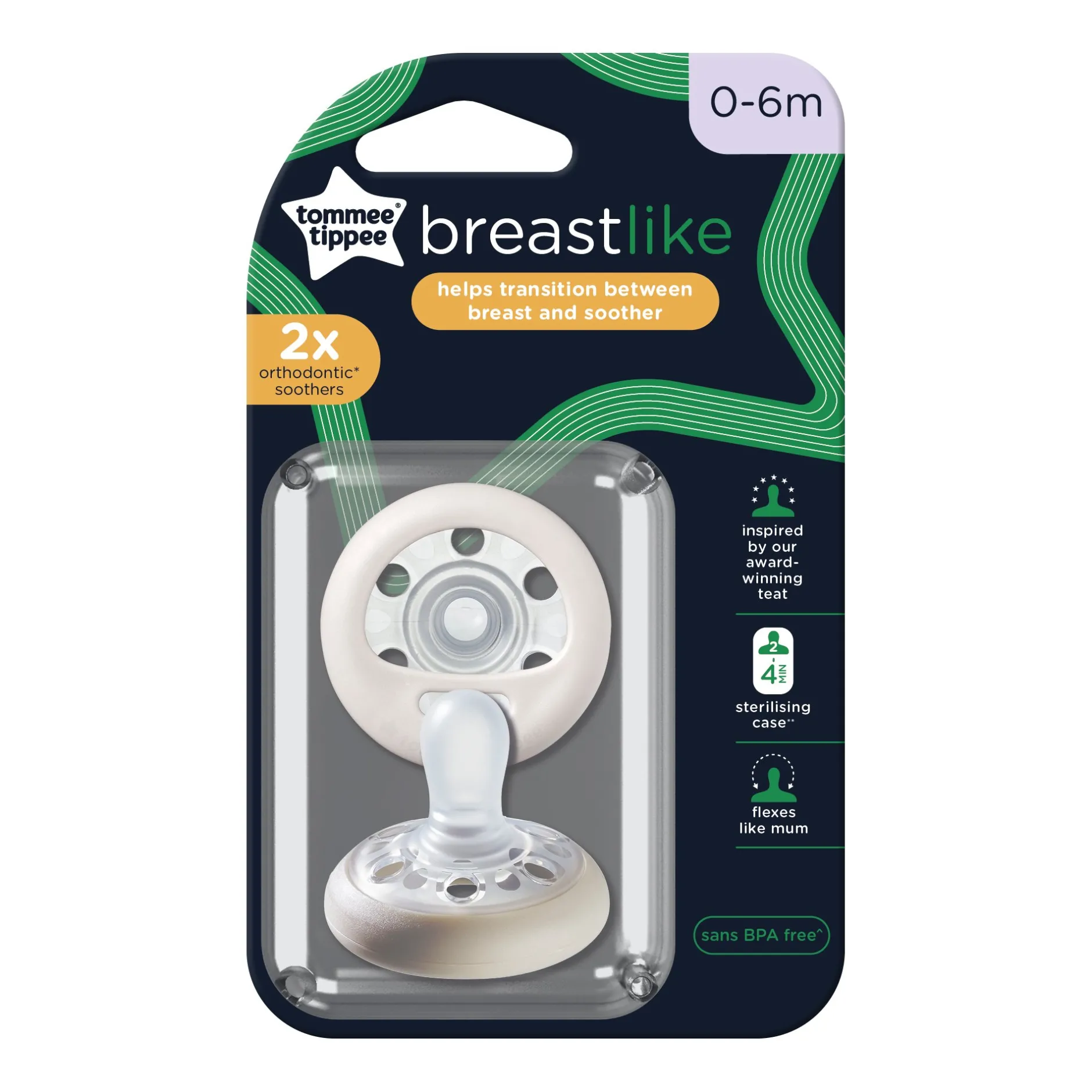 Toutes les sucettes Tommee Tippee sont sans BPA pour une tranquillité d’esprit totale.