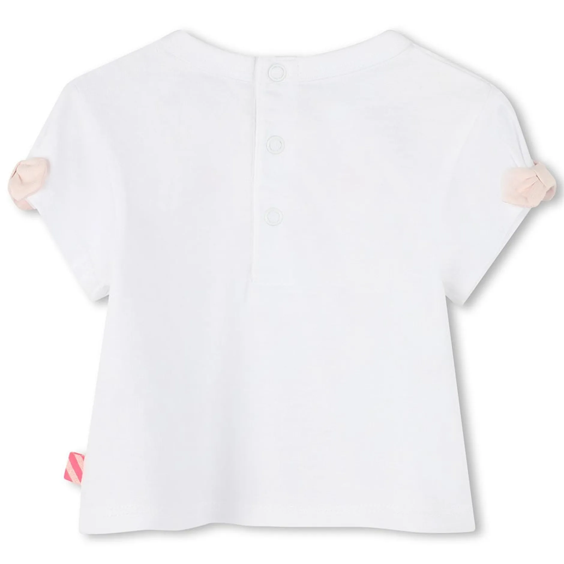 Tee-shirt en 100% coton, illustration au niveau du col avec encre gonflante, petit noeud sur les manches courtes, fermeture pressionnée dans le dos, étiquette rayée.