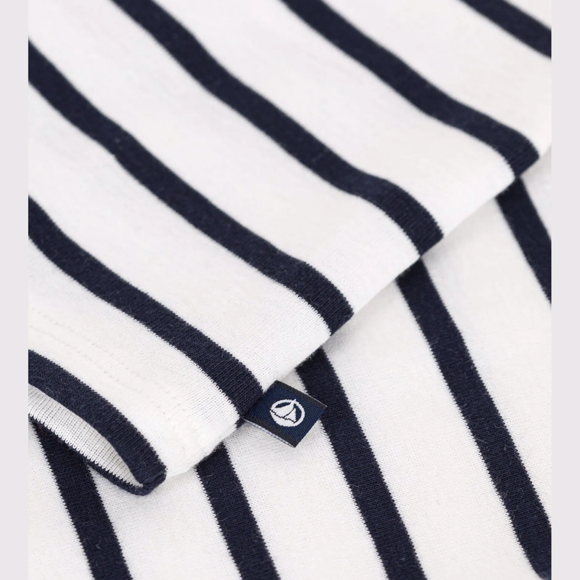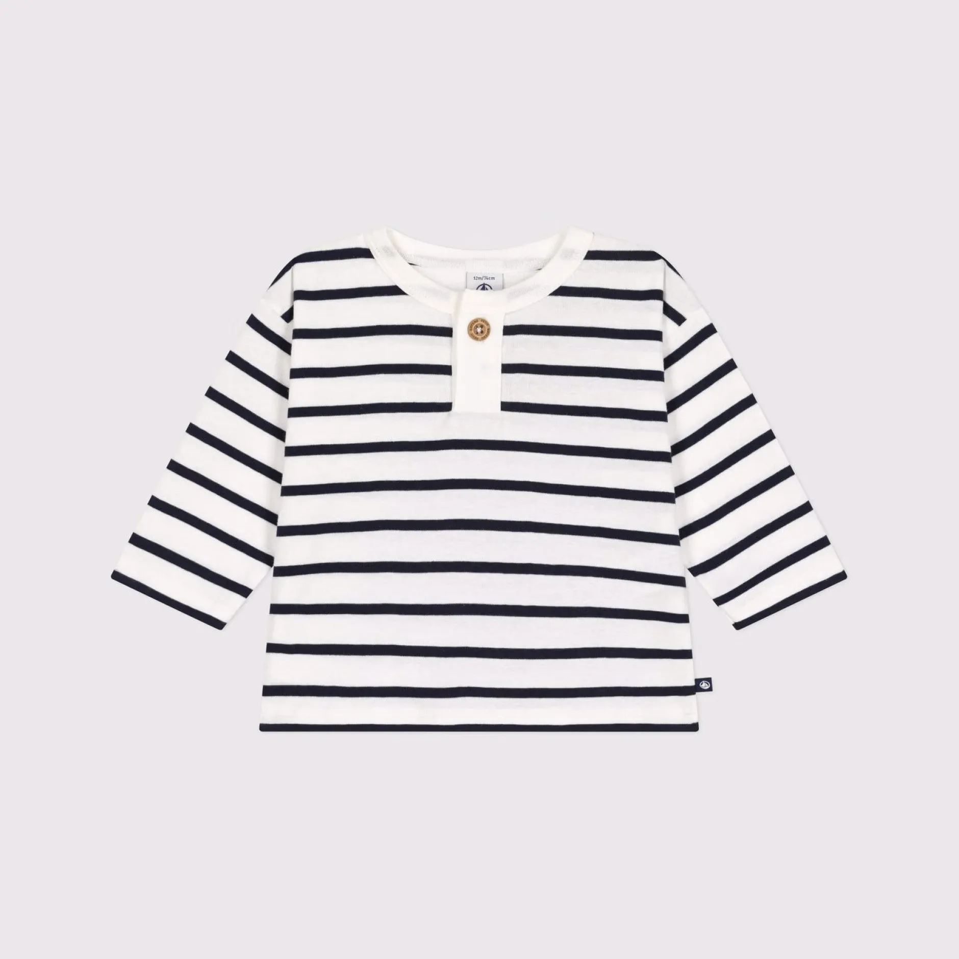 Le tee-shirt unisexe en côte, une matière extensible et confortable. Rayure iconique marinière. Ouverture boutonnée devant pour faciliter l’enfilage.