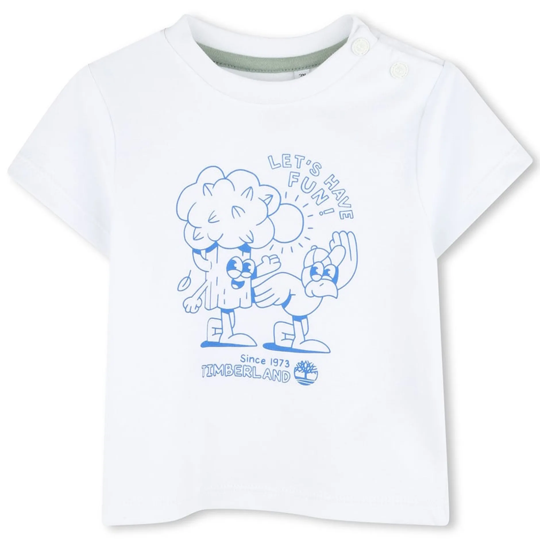 T-shirt manches courtes en interlock 100% coton issu de l’agriculture biologique, fermeture pressionnée à l’épaule, logo imprimé sur le devant.