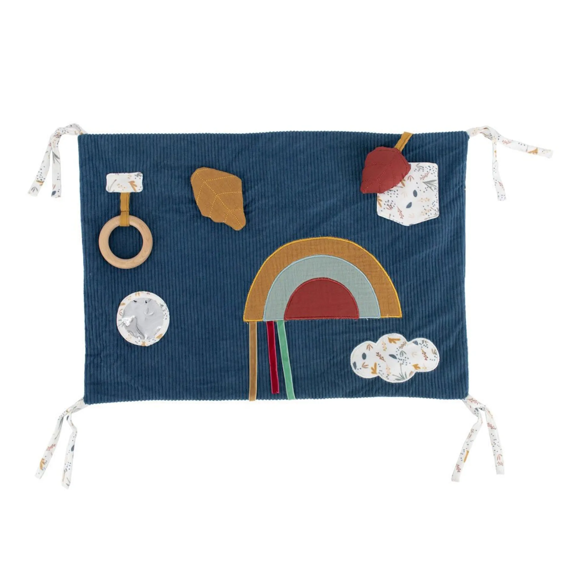Accrochés aux barreaux du parc, ou bien du lit, le mur d’activités stimule les sens de bébé et l’insite à découvrir, toucher, attraprer.