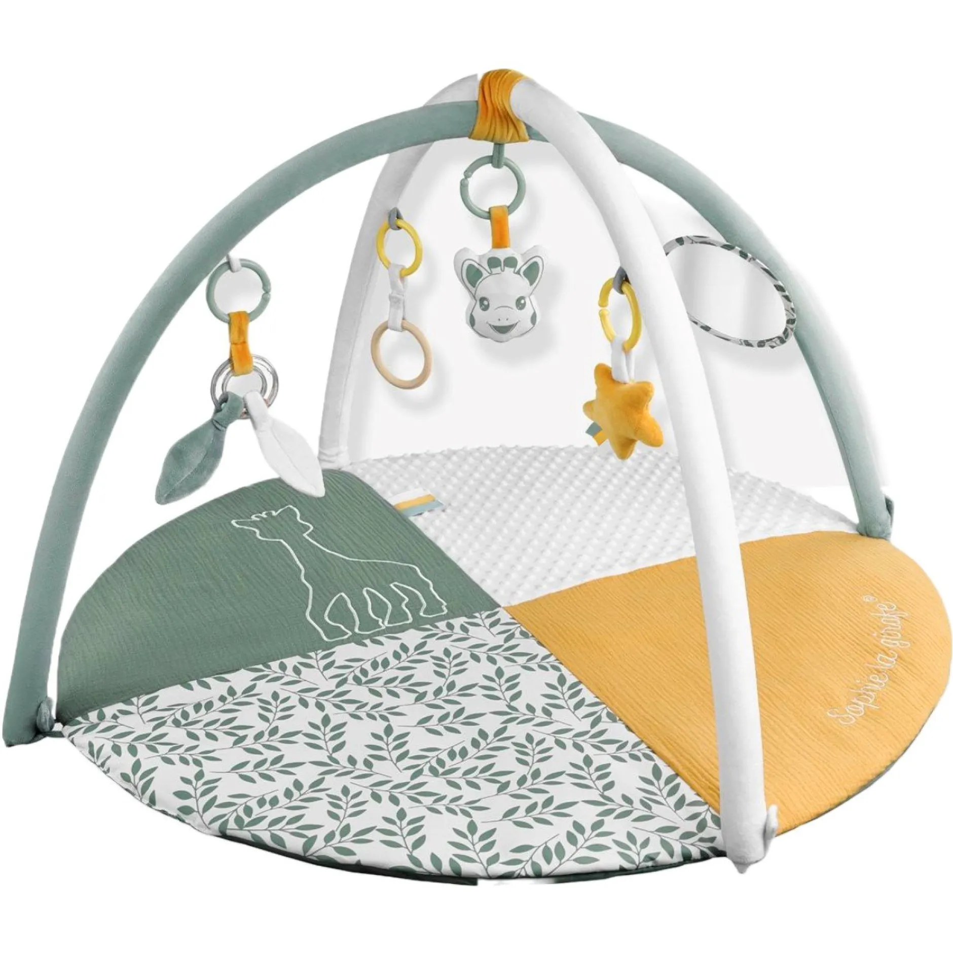 - Une face « éveil » : bébé développe son éveil et sa motricité grâce aux nombreuses activités qui l’entourent sur les arches et sur le tapis : miroir, grelot, anneau de dentition, papier froissé…