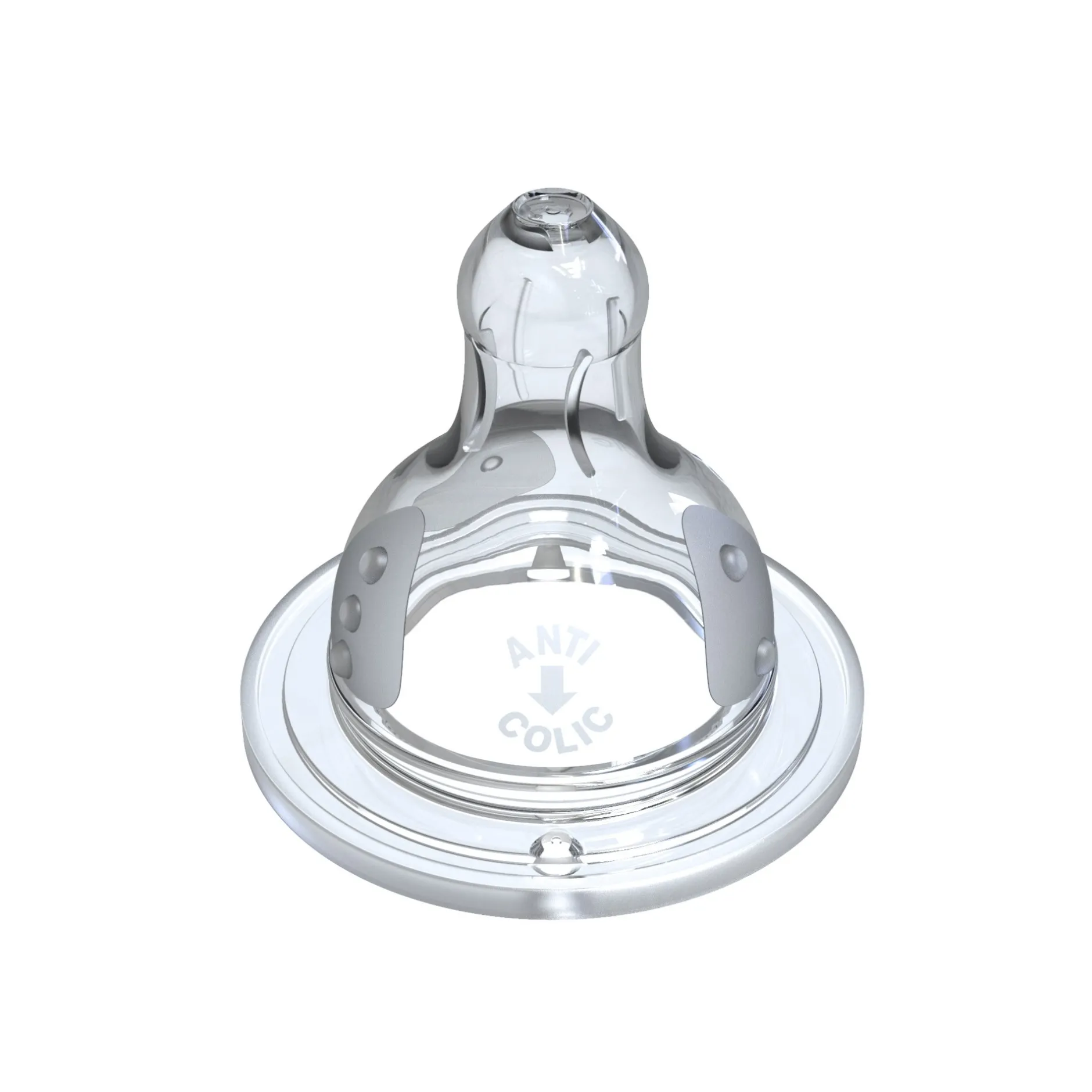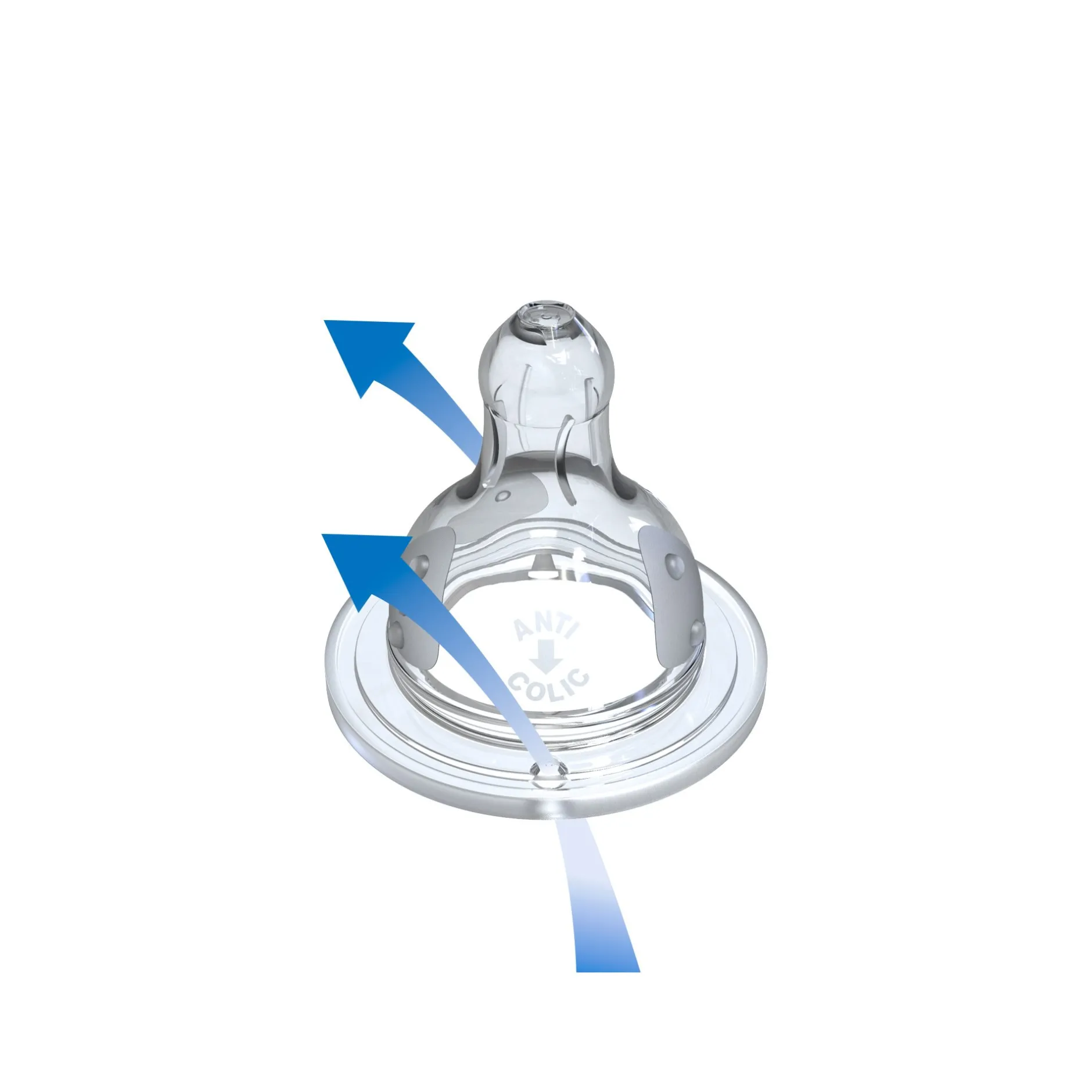 Le système anti-colique est intégré aux tétines Initiation+ grâce à une double valve brevetée, qui favorise la circulation de l’air et réduit les risques de coliques, d’aérophagie et de régurgitations.