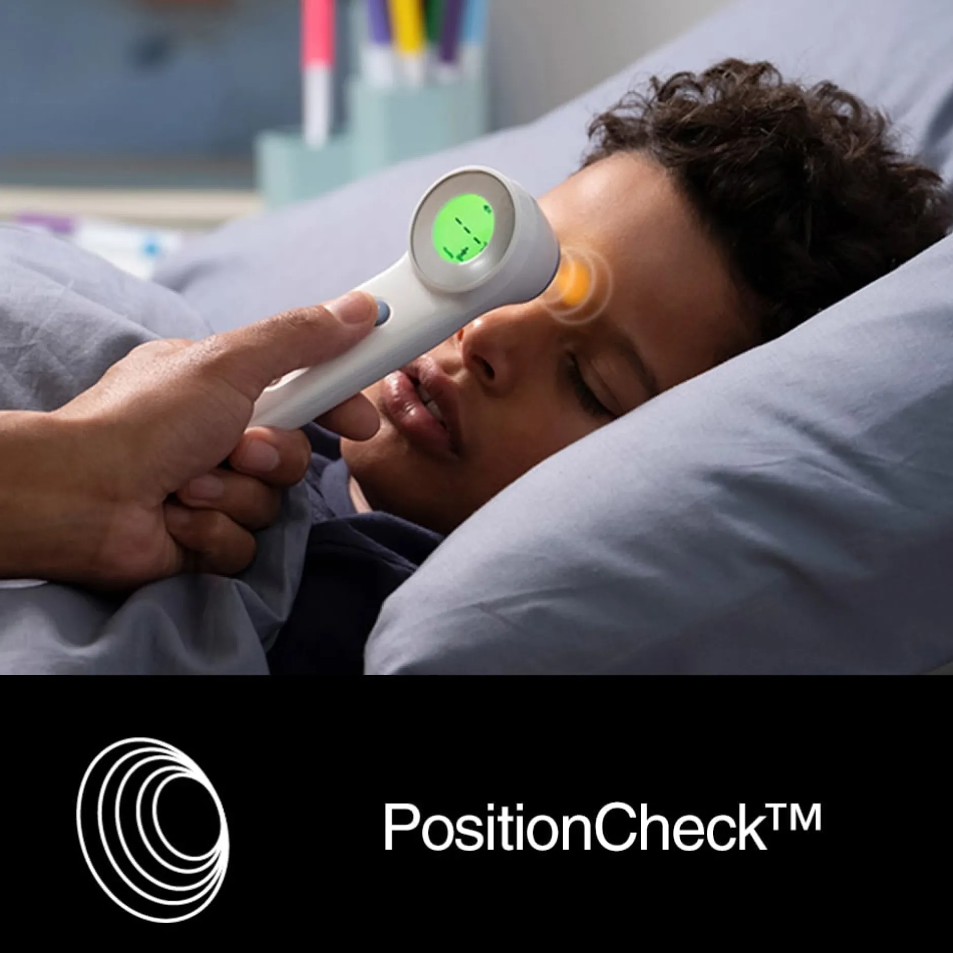 - POSITIONCHECK™ : La précision en toute simplicité : la technologie Braun associe lumière de visée, capteur de proximité et guidage à l’écran pour minimiser les erreurs et garantir le positionnement correct du thermomètre*.