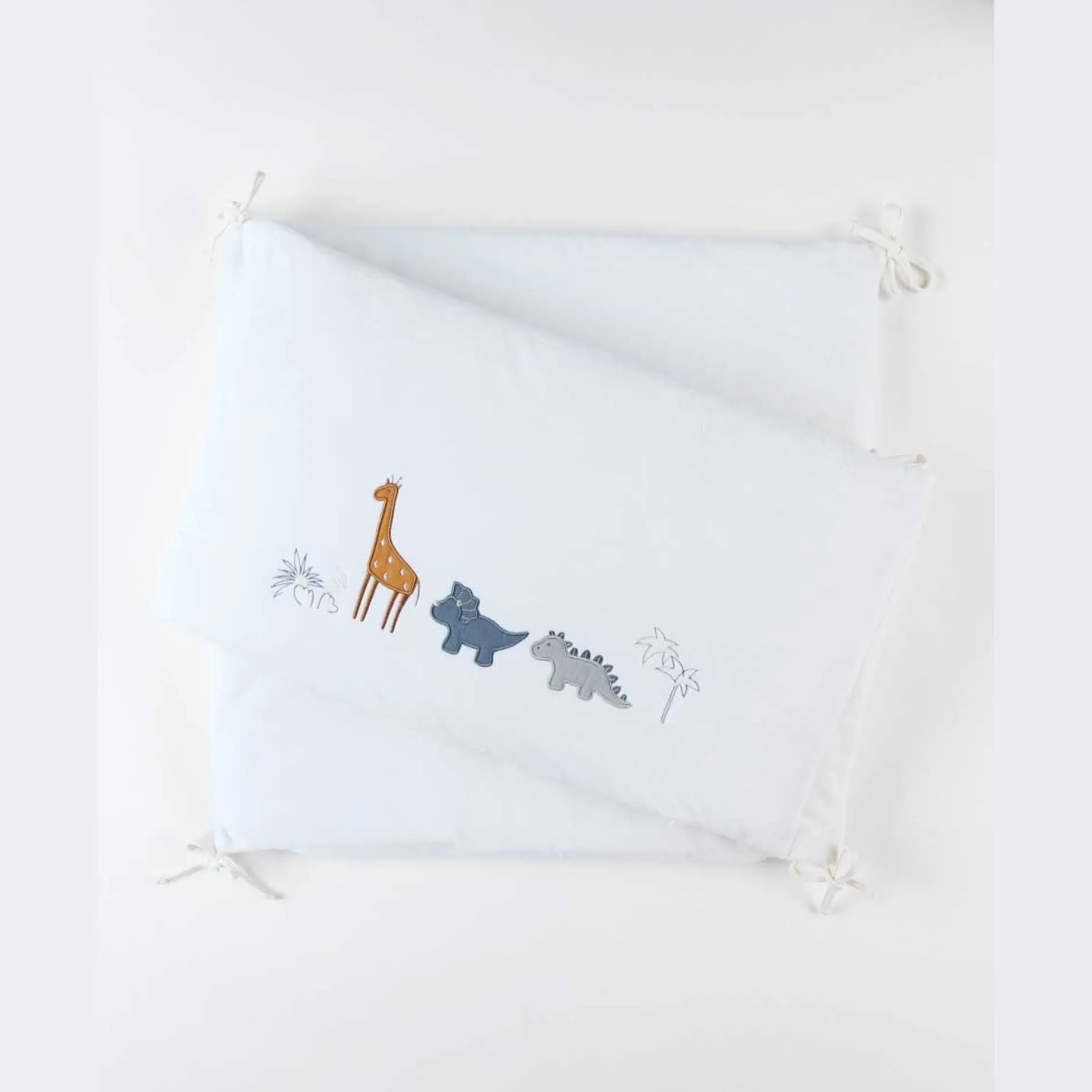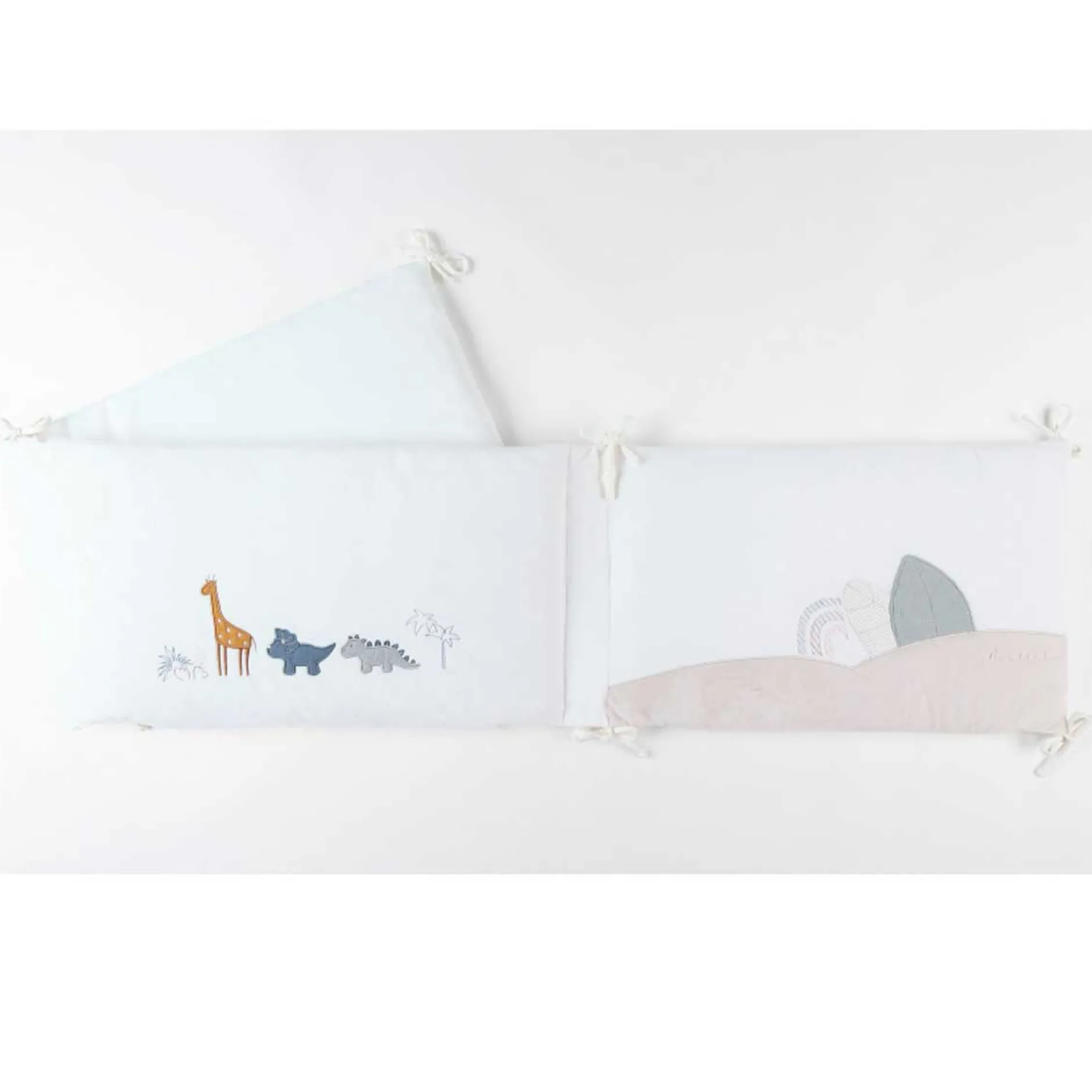 Le tour de lit avec housse déhoussable se fixe aux barreaux grâce à des liens en tissu.