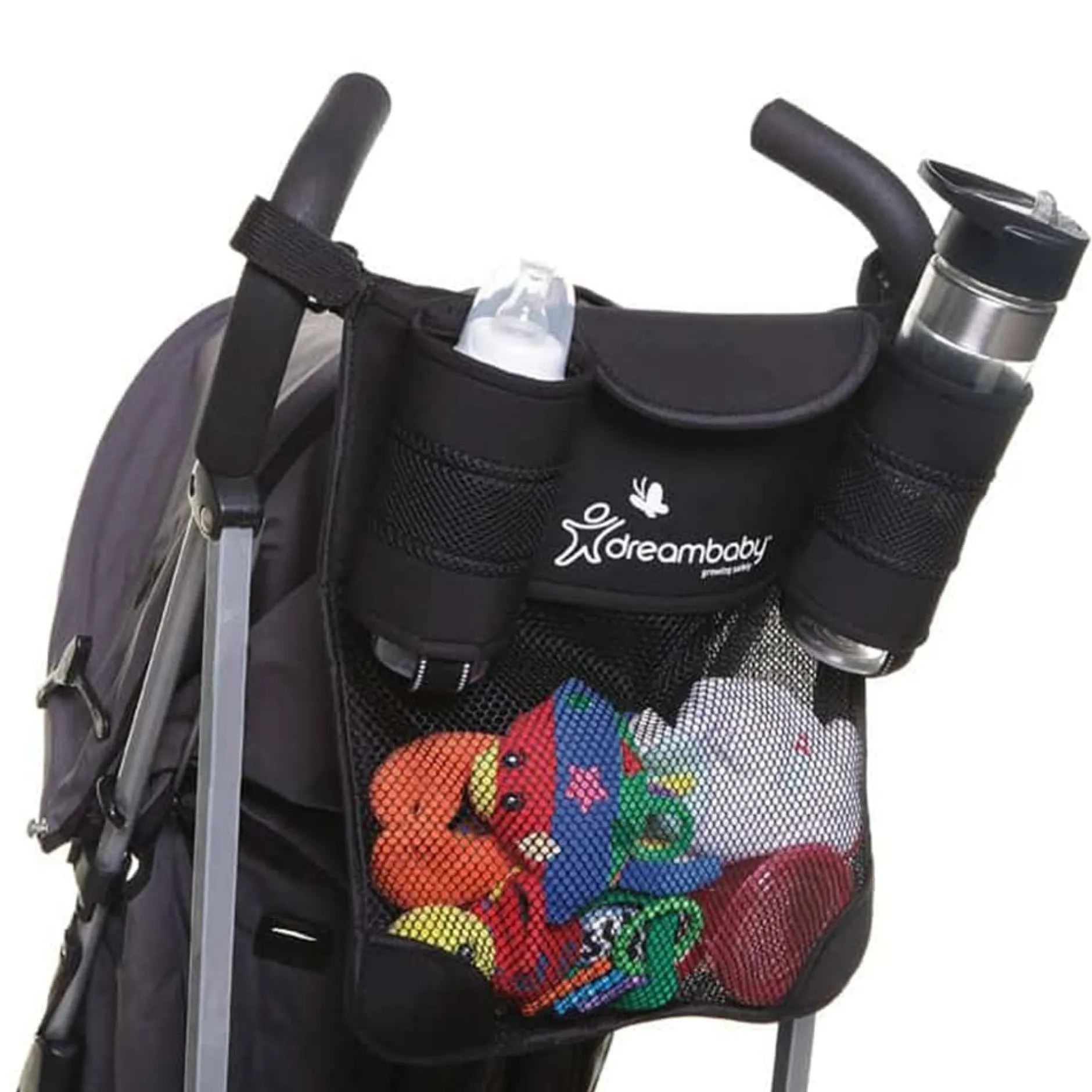 L’organisateur de poussette Dreambaby Strollerbuddy G287 rend les déplacements avec les enfants plus faciles et plus sans stress que jamais. Enroulez la sangle autour de la poignée de la poussette, passez à travers l’anneau en D et fixez le tissu auto-agrippant.