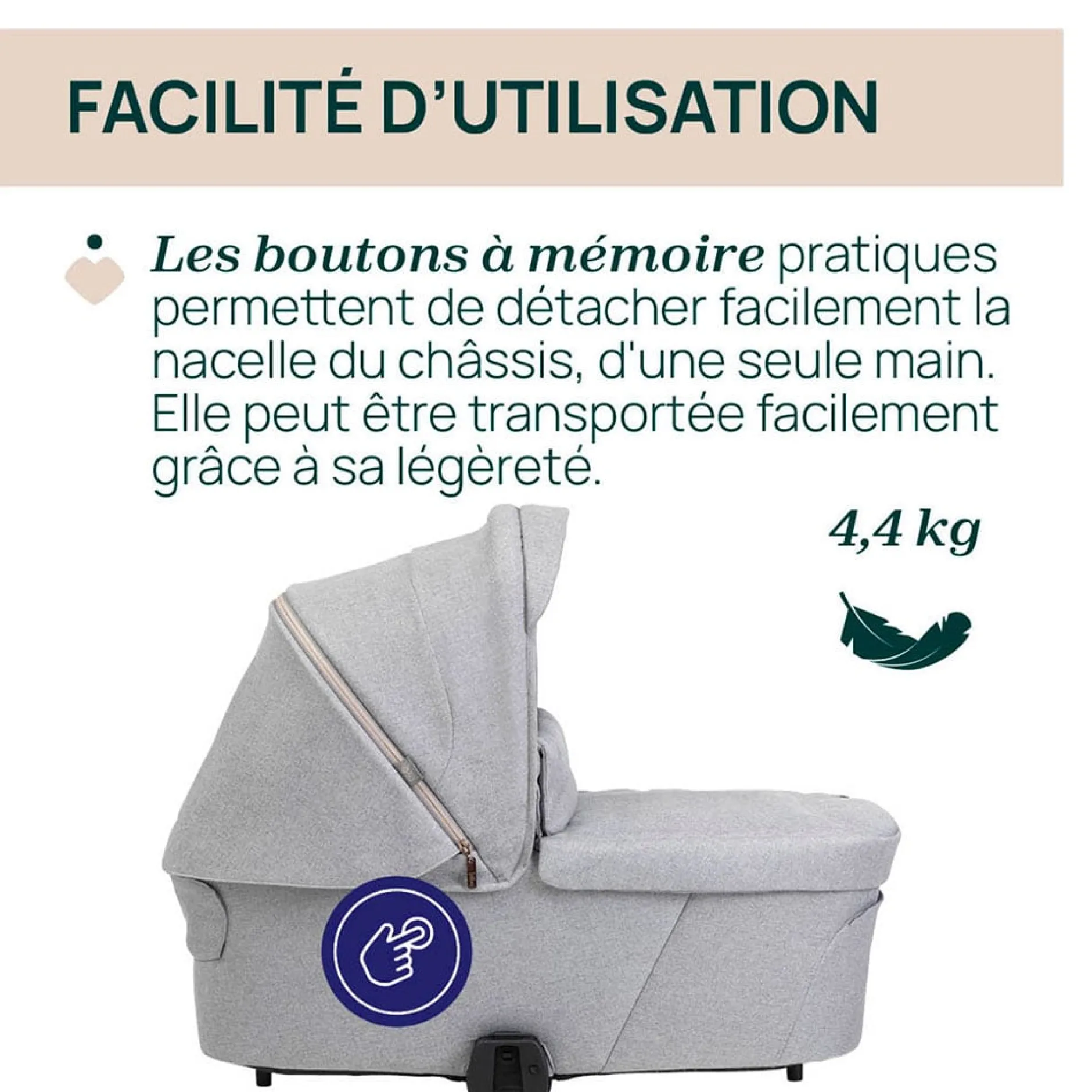 La nacelle se fixe facilement et sans adaptateur sur le châssis de la poussette. Elle se détache ultra facilement grâce aux boutons mémoire pratiques.