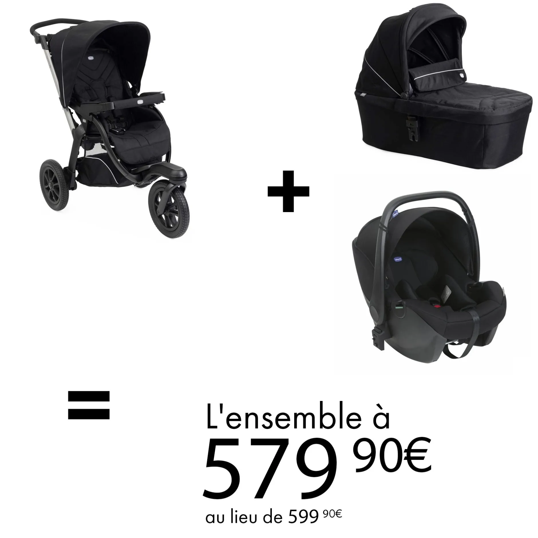 Ce bundle* contient une poussette Activ3 Ebony Noir, une nacelle Activ3 Ebony Noir et un siège auto Kory Essential Black de la marque Chicco.