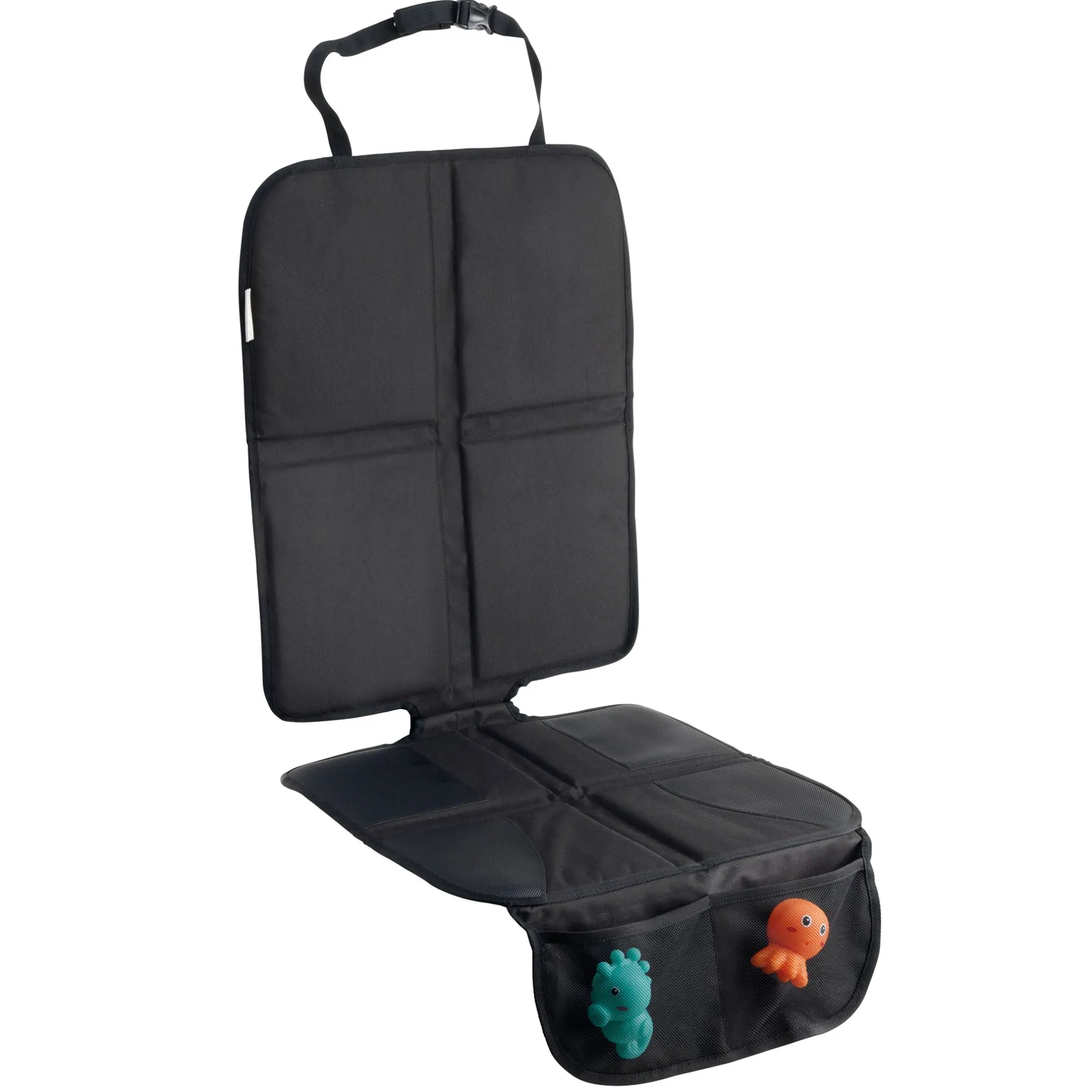 Le tissu déperlant laisse glisser les liquides en cas de petits accidents, comme de l’eau qui coule. Ce protège siège contient deux poches pour ranger les jouets, lingettes…