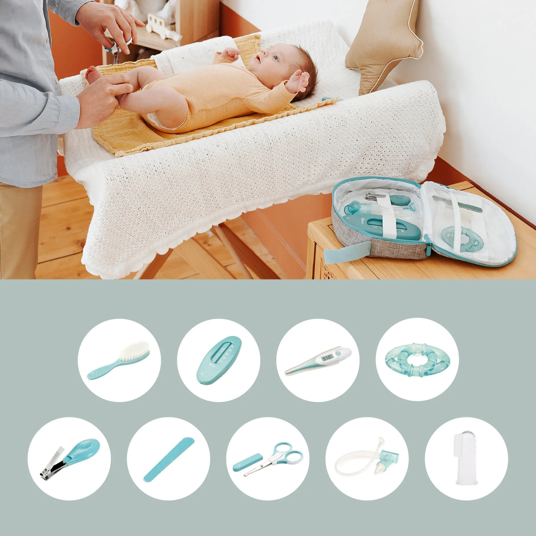 - 9 accessoires essentiels pour prendre soin de bébé : un thermomètre digital avec embout souple, un mouche bébé par aspiration buccale (avec réservoir anti-retour de sécrétions), une paire de ciseaux à bout arrondi, un coupe ongle, une lime à ongle, un thermomètre de bain, une brosse douce, un anneau de dentition réfrigérable et un masseur de gencives.