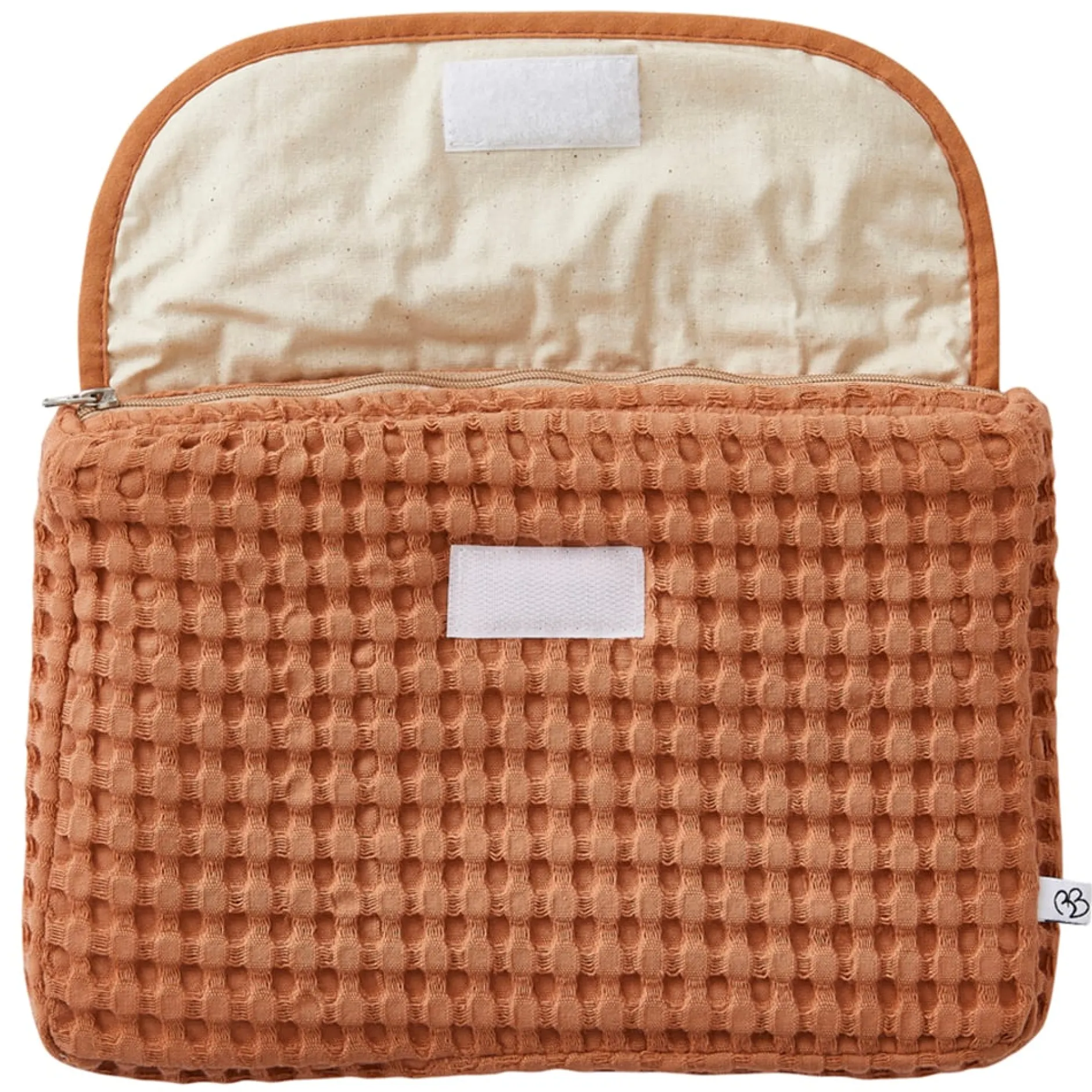 Cette jolie trousse en coton gaufré est entièrement doublée de coton enduit imperméable pour pouvoir transporter des produits de toilette sans risque. Fermeture zippée et rabat arrondi devant fermé par bande velcros.