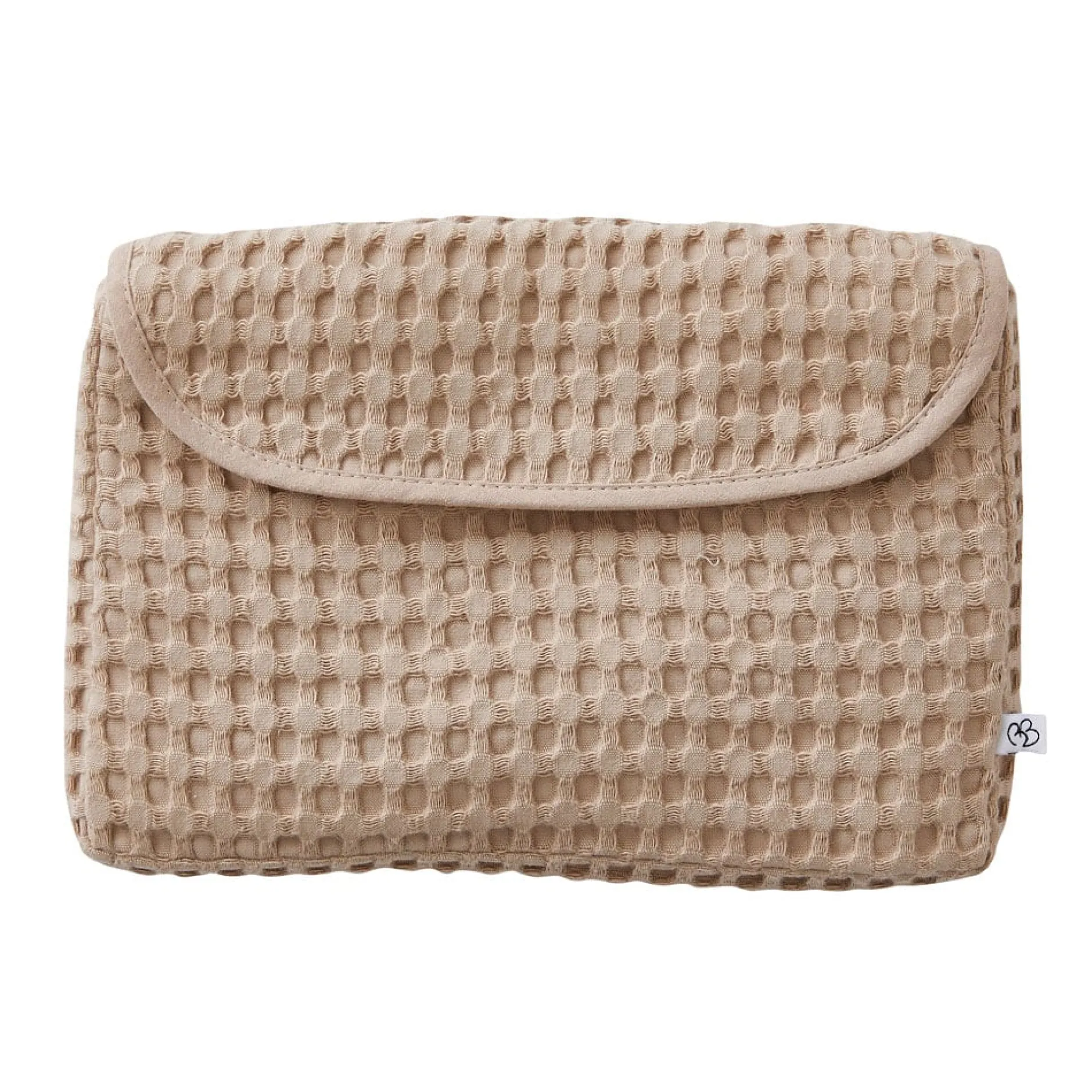 Cette jolie trousse en coton gaufré est entièrement doublée de coton enduit imperméable pour pouvoir transporter des produits de toilette sans risque. Fermeture zippée et rabat arrondi devant fermé par bande velcros.