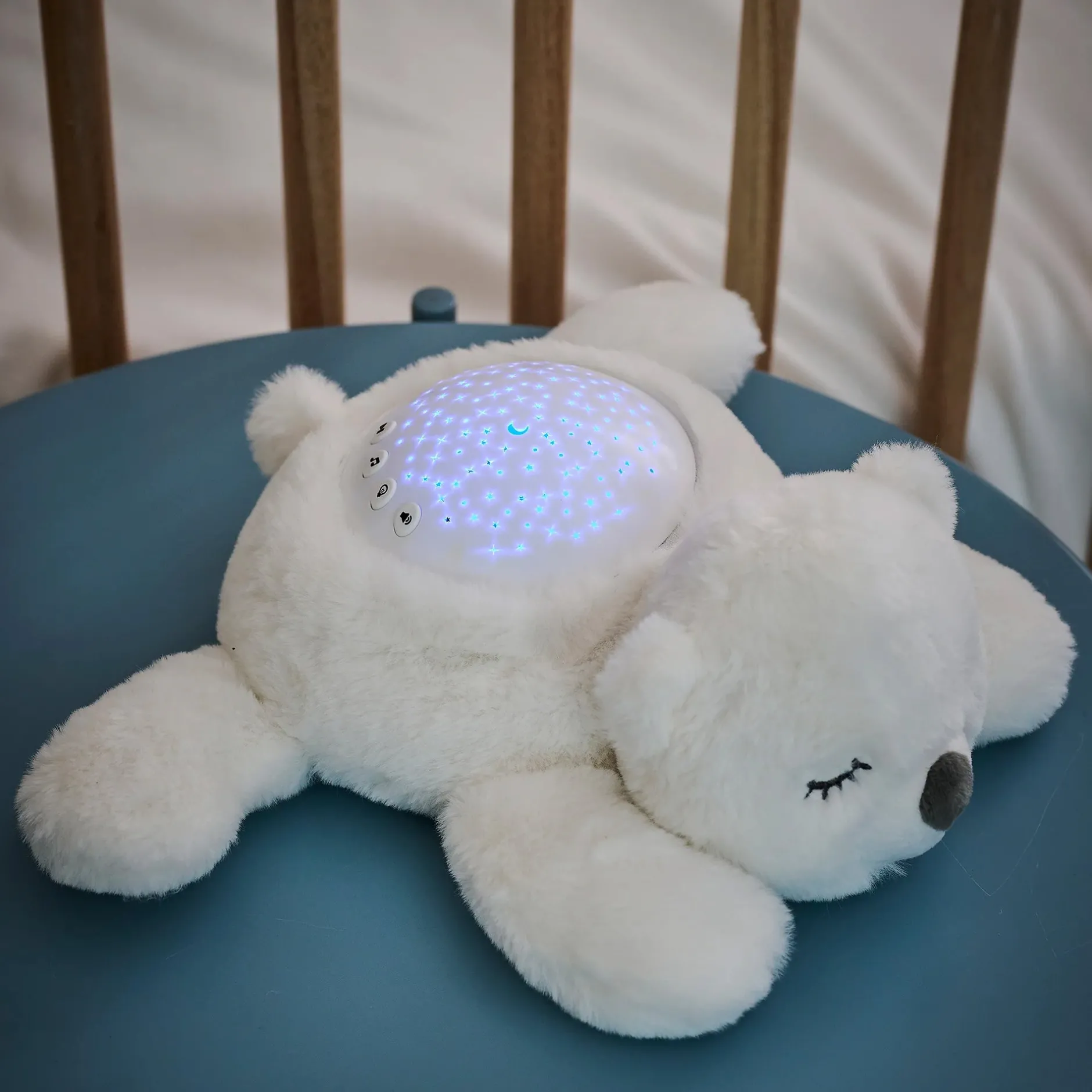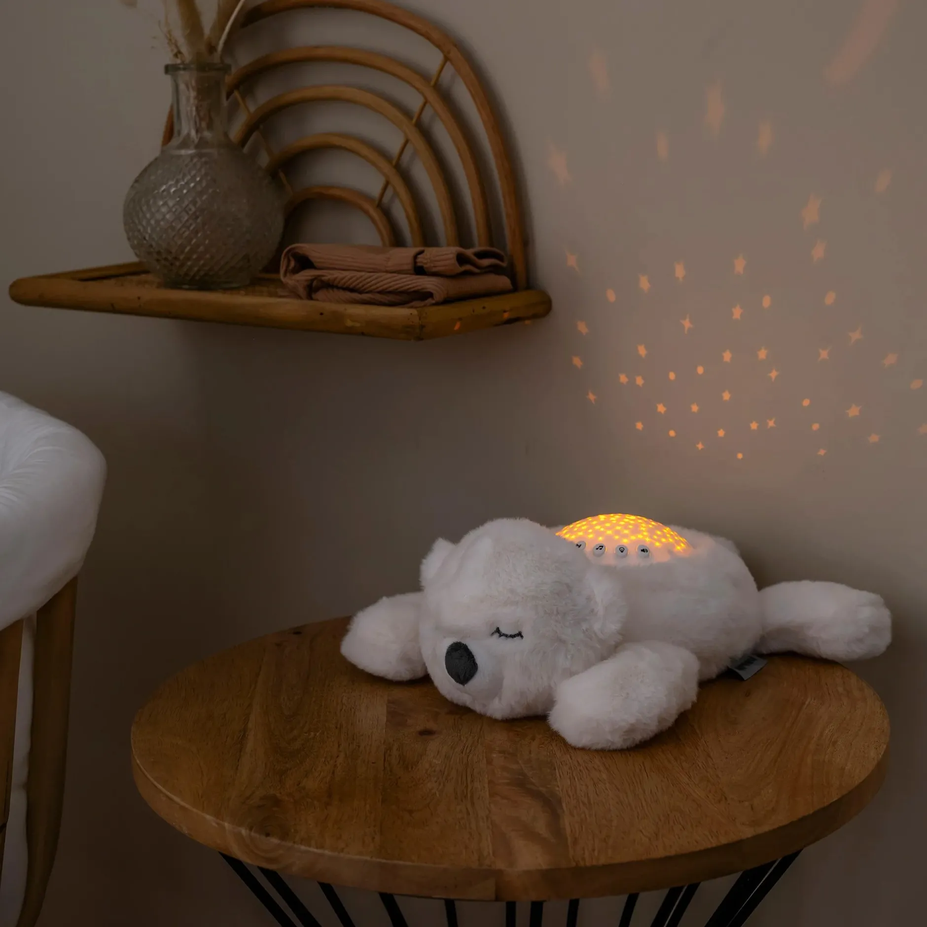 Laissez la nuit étoilée prendre vie grâce à nos adorables veilleuses en peluche. La projection d’étoiles crée une atmosphère magique et est l’accessoire indispensable pour aider votre bébé à s’endormir paisiblement. Cette veilleuse avec sons (musiques ou bruits blancs) projette différents ciels étoilés en orange, vert ou bleu, ou bien en défilement automatique. Le personnage est tout doux et câlin. Le volume sonore est réglable. Tout s’éteindra automatiquement au bout de 20 minutes pour laisser votre enfant plongé dans ses rêves.