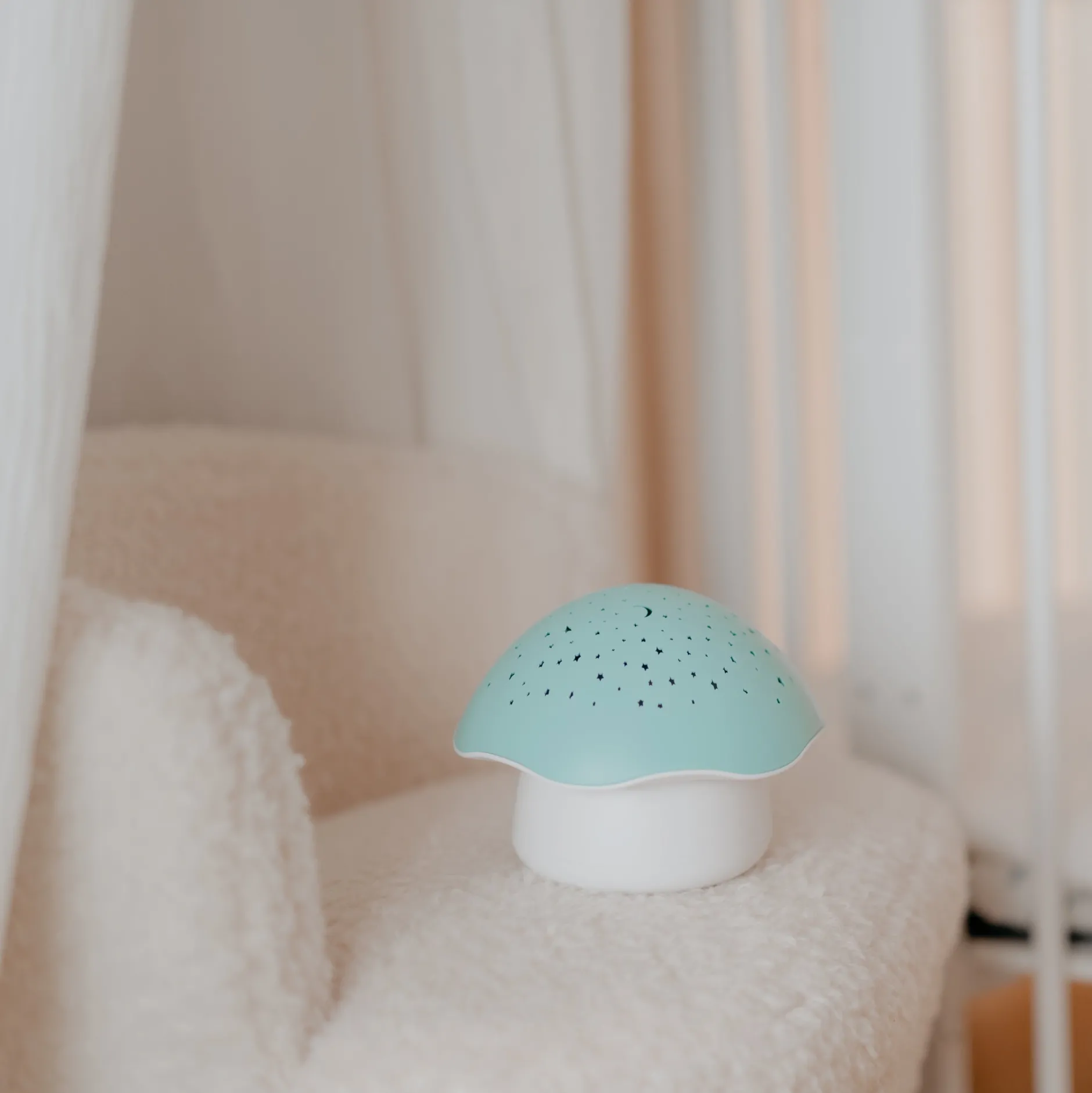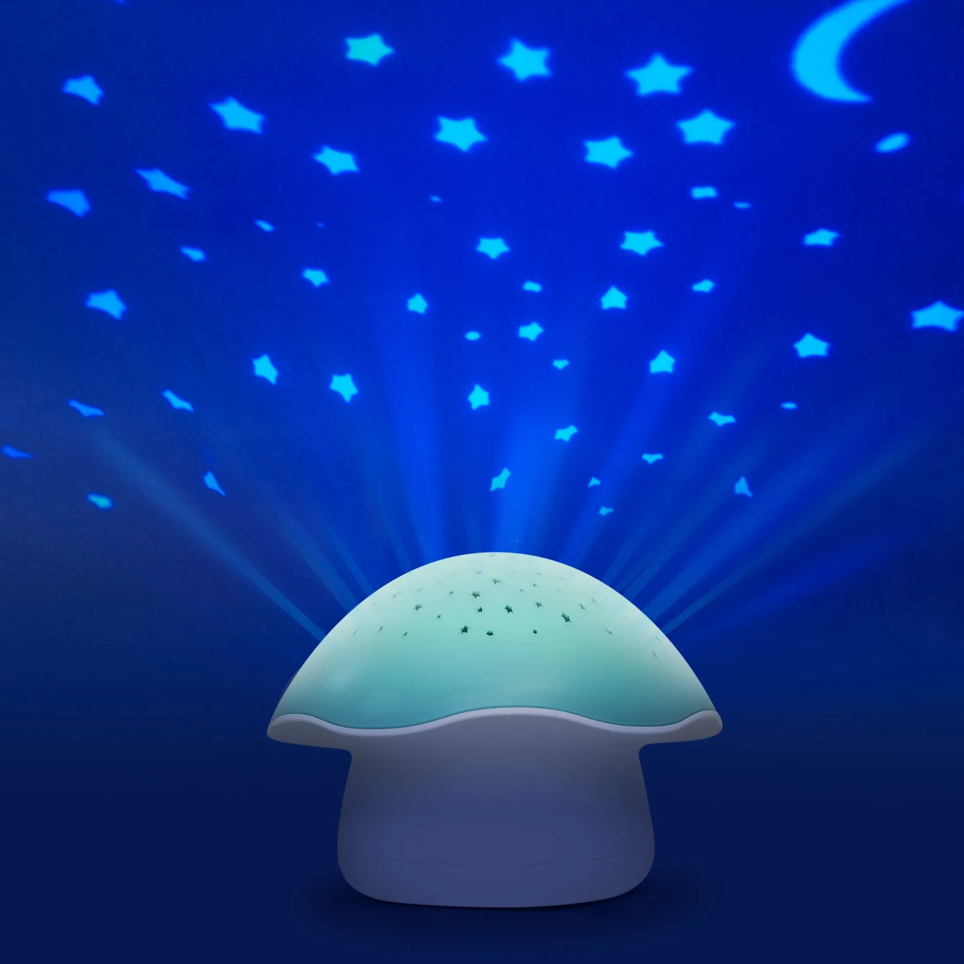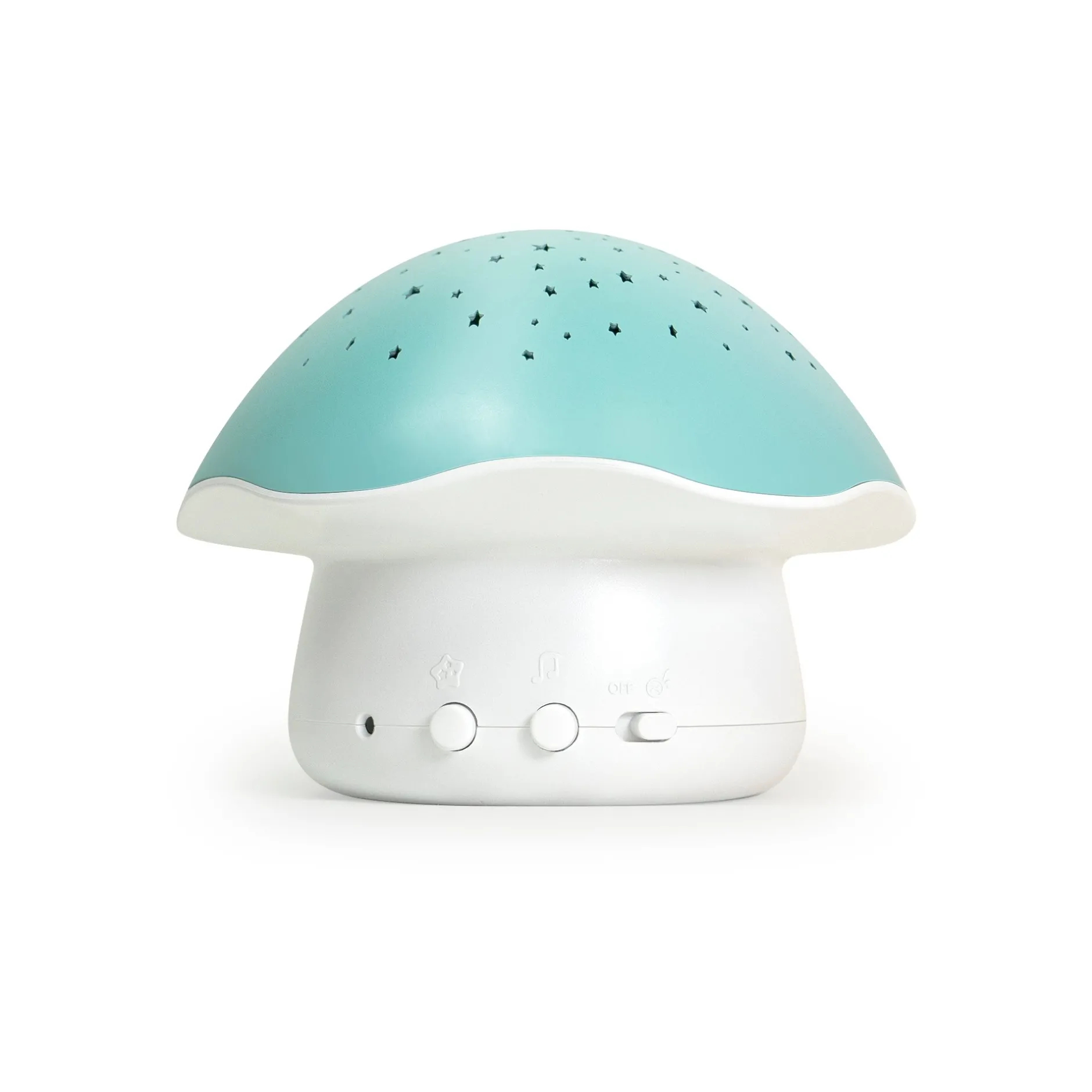 La veilleuse projecteur d’étoiles champignon projette un des étoiles pour aider votre tout petit à s’endormir paisiblement. Les étoiles changent de couleurs (la couleurs peut se figer selon vos préférences). Pour endormir bébé de la meilleure des façon, la veilleuse champignon de Pabobo diffuse une douce berceuse ou des bruits blanc de battements de coeur.