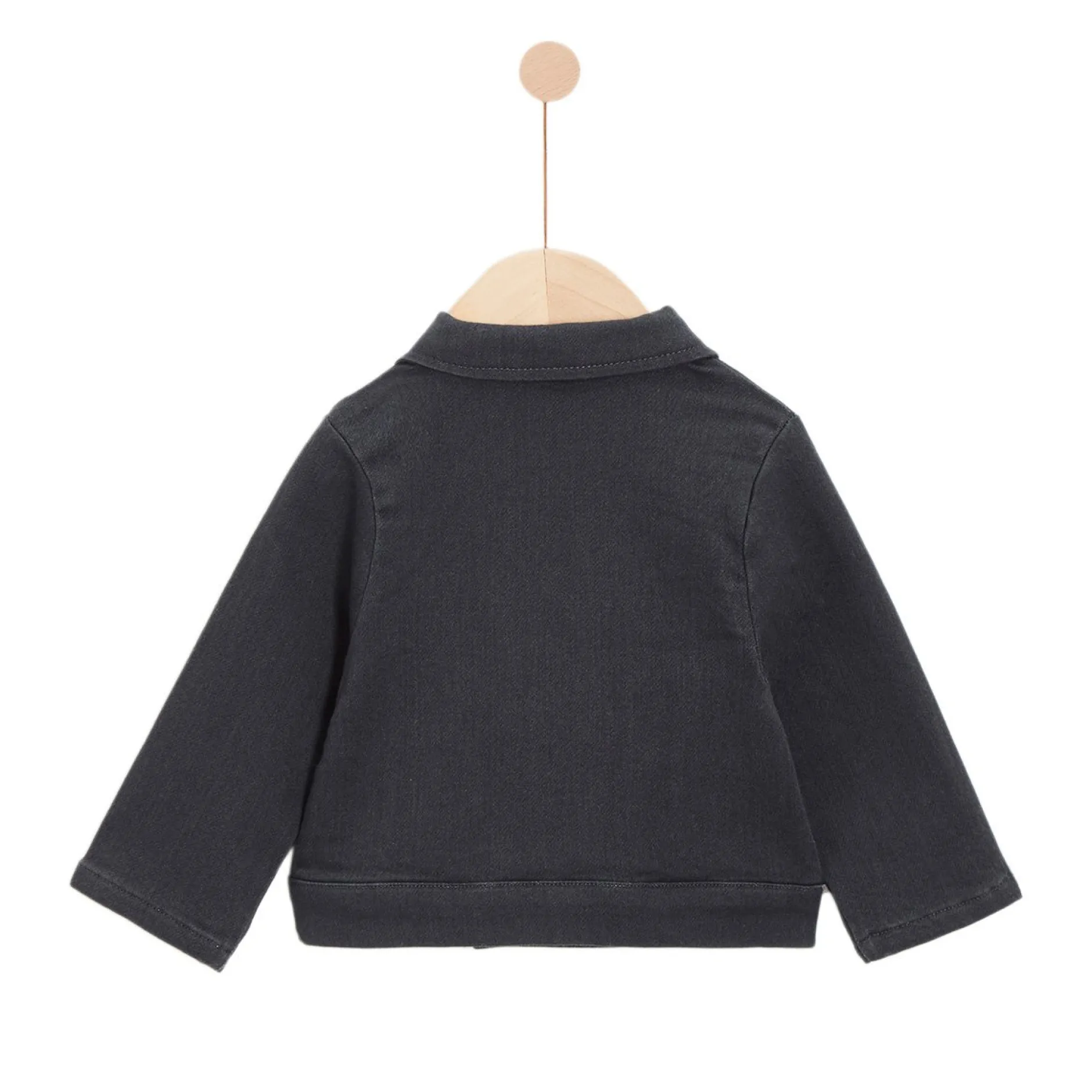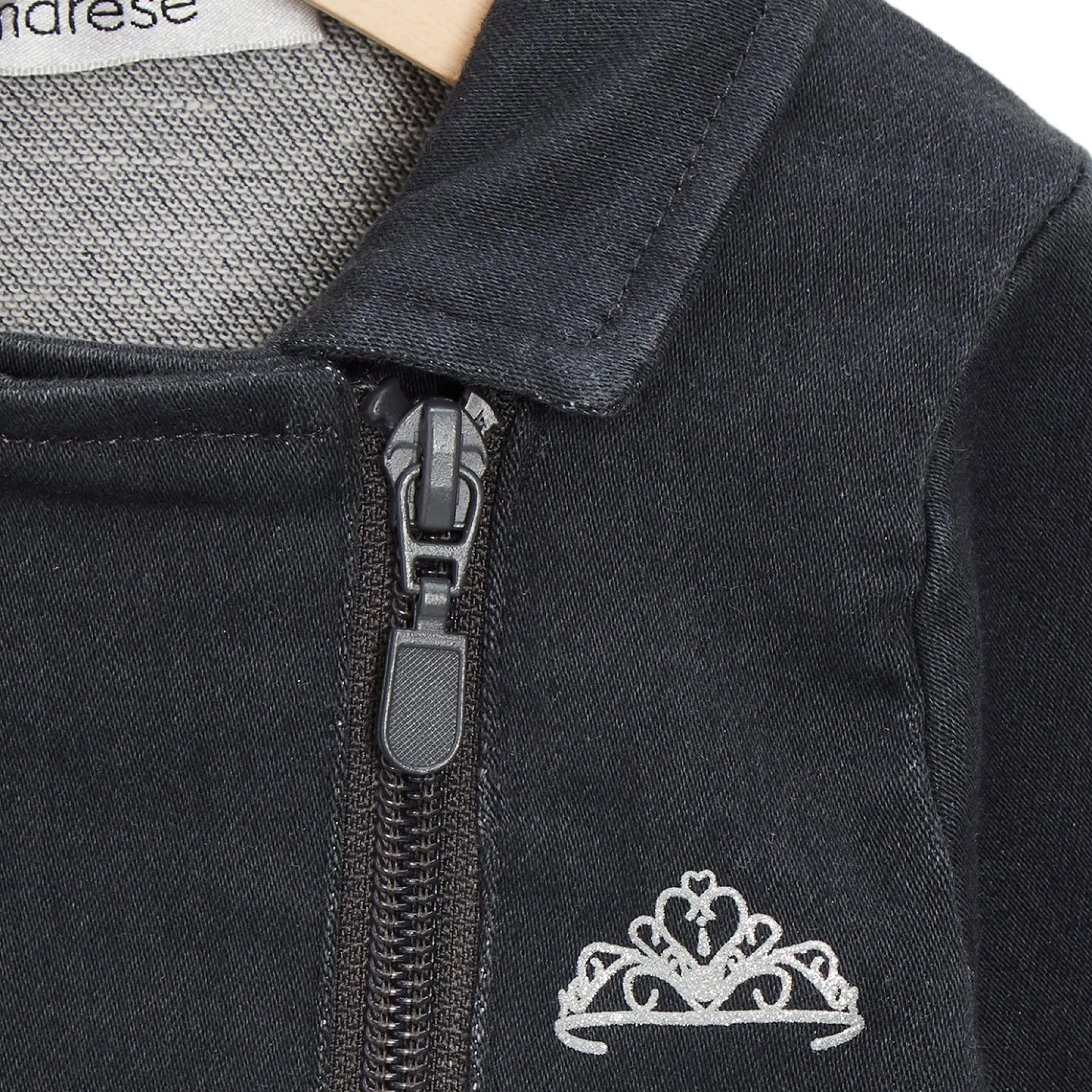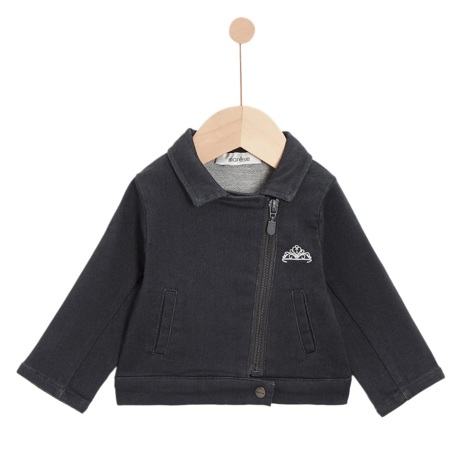 Veste en molleton façon denim huilé noir Marèse. Forme très tendance façon perfecto avec son ouverture zippée asymétrique. Poche passepoilée sur un côté. Jolie impression d’un diadème sur la poitrine en encre argentée. Une très belle pièce qui parfait les silhouettes et pour cet hiver qui tiendra les petites filles bien au chaud. Lavage à 30°C.