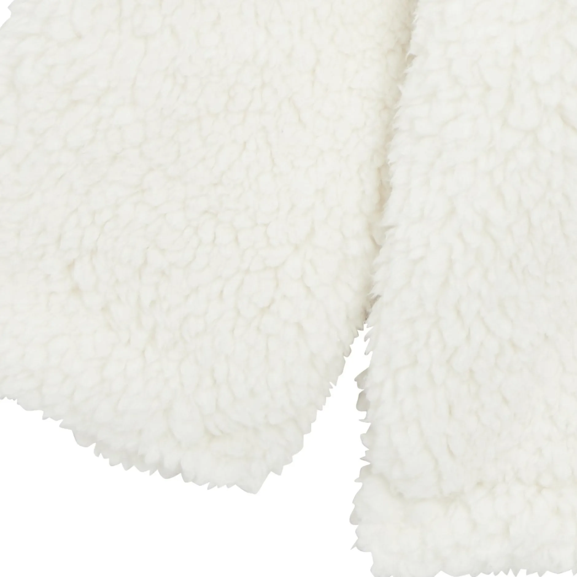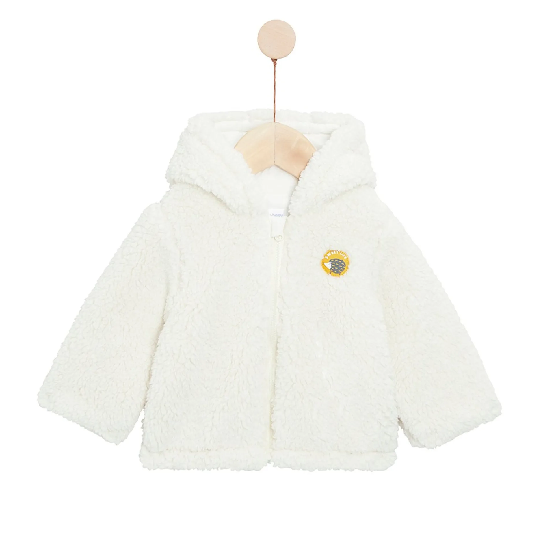 Veste à capuche P’tit Bisou en fourrure moutonnée toute douce en coloris écru. Elle est ouverte par un zip pour plus de chaleur et de confort. Elle est adorable avec ses petites oreilles en volume sur la capuche, ce qui accentue le côté ludique. Entièrement doublée de jersey écru. Elle a un écusson sur la poitrine représentant un petit hérisson.